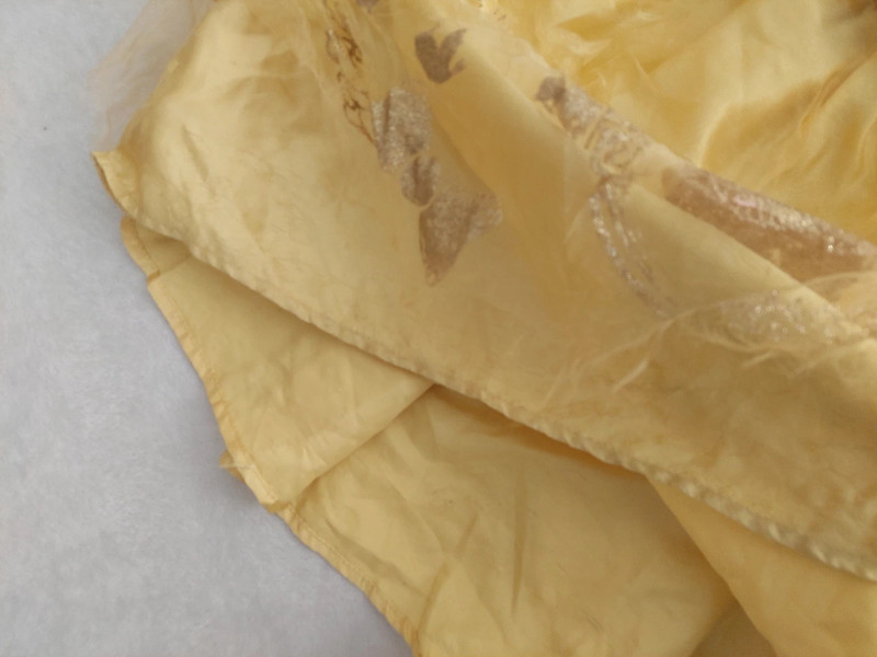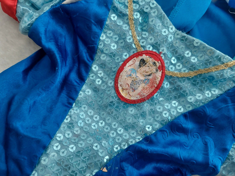 Stav: pekný nosený stav - chybičky pofotené (ošúchaný obrázok pod krkom, pozaťahovania od suchého zipsu na chrbátiku, párajúci sa lem na vrchnej organze sukničky. Šatičky veľmi pekné, stále urobia parádu, s pekný stojatým golierikom, v páse guma. Suknička pekne drží tvar.