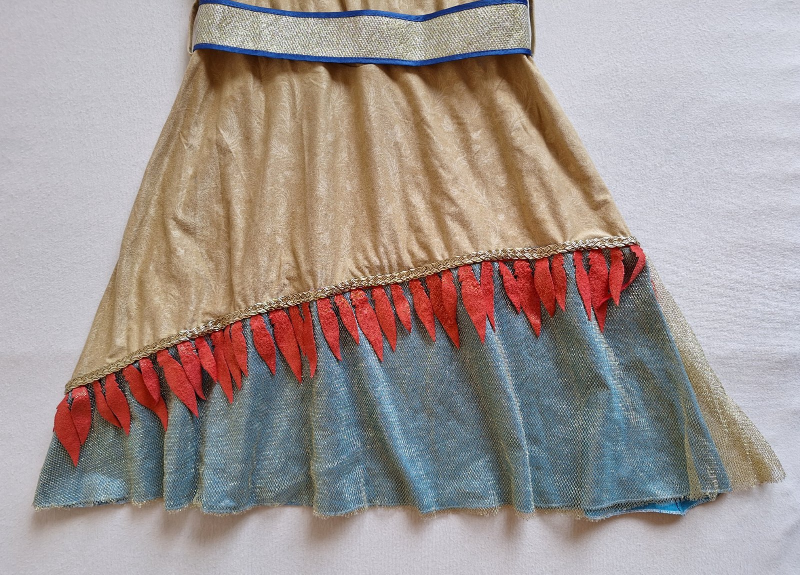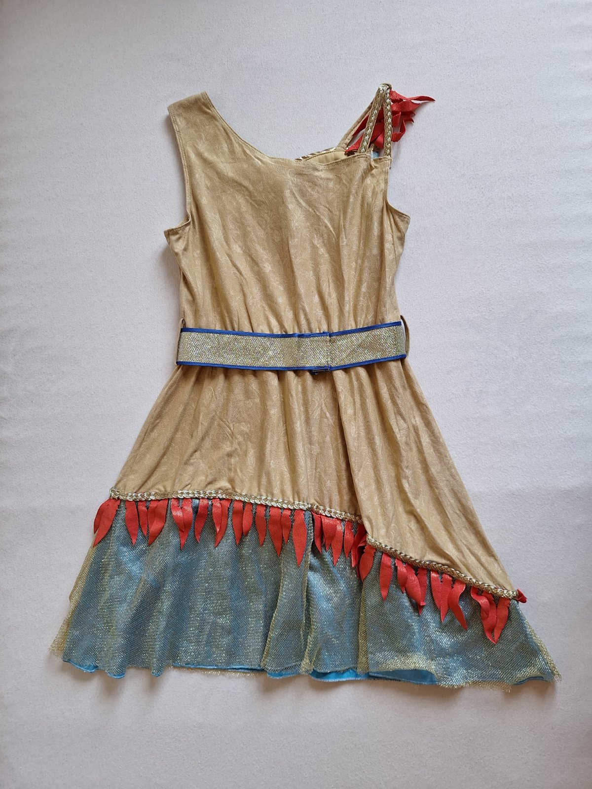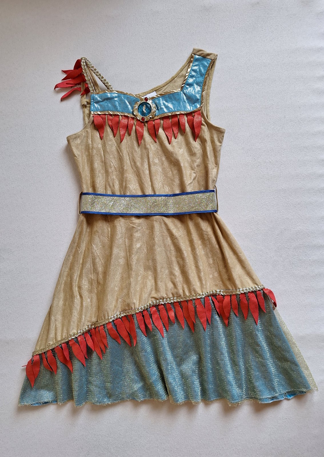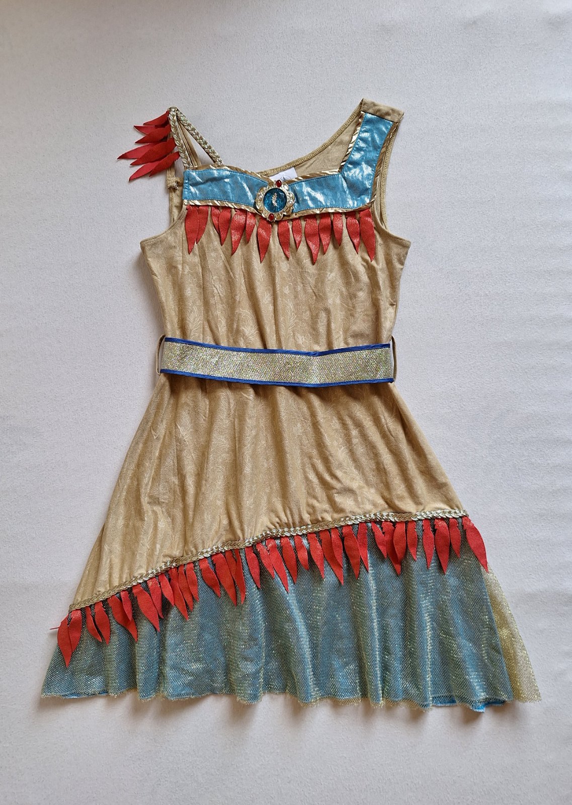 Stav: Top stav bez poškodení a známok nosenia, vhodné aj ako dar. Pekný 2-dielny kostým. Šaty sú elastické, pekne sa prispôsobia postave, na hrudi výrazná brošňa a zaujímavá je aj potlač lístkov a kvetov v látke. Zlatý opasok sa zapína na suchý zips. Dá sa použiť aj ako kostým Indiánky