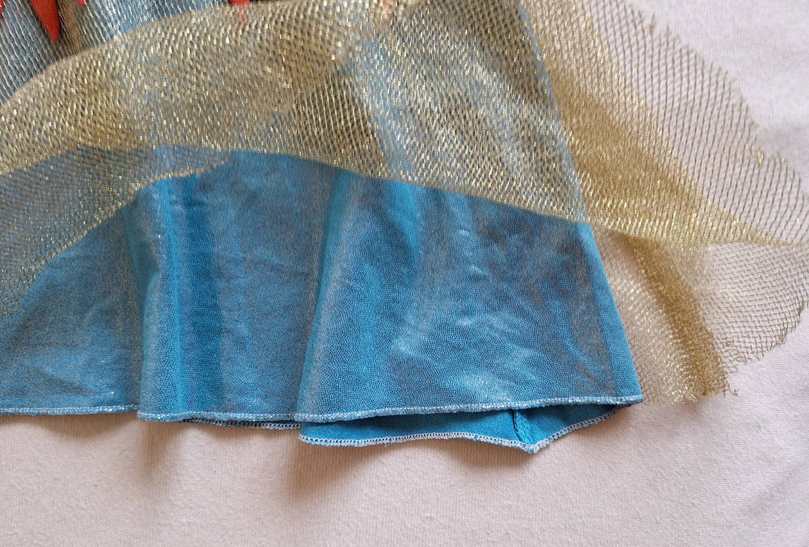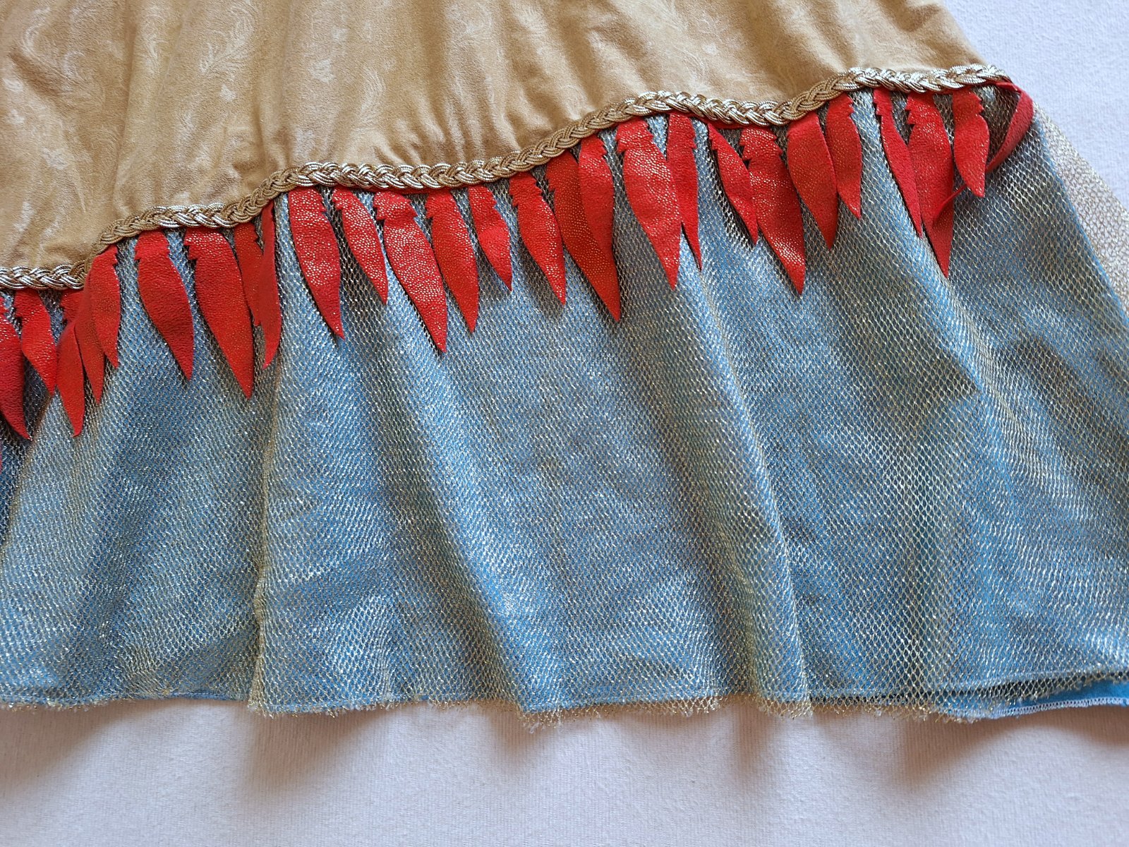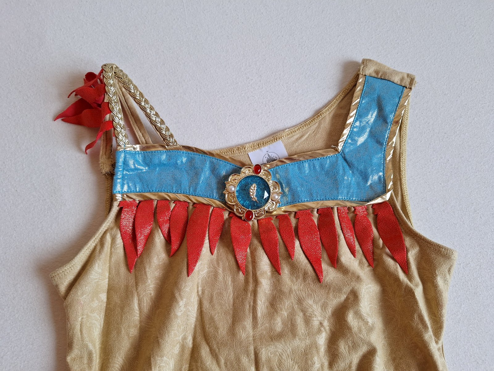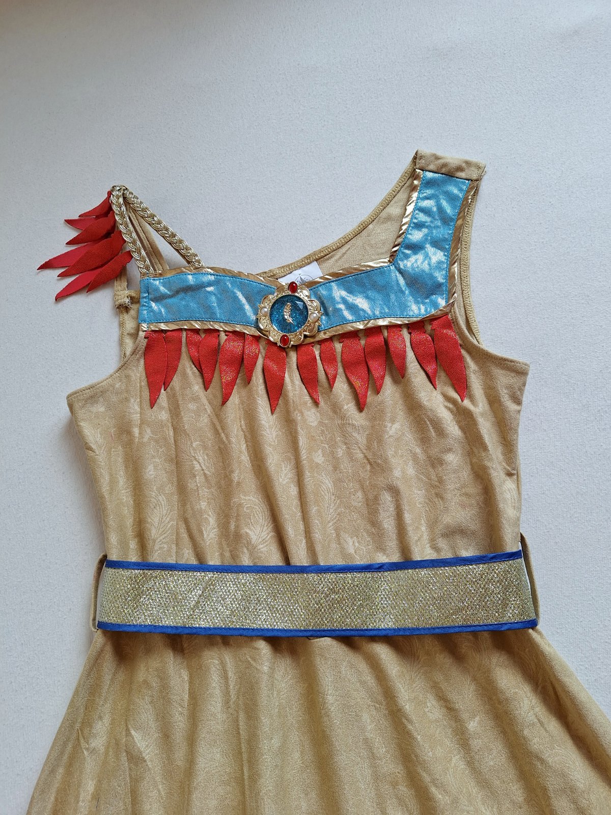 Stav: Top stav bez poškodení a známok nosenia, vhodné aj ako dar. Pekný 2-dielny kostým. Šaty sú elastické, pekne sa prispôsobia postave, na hrudi výrazná brošňa a zaujímavá je aj potlač lístkov a kvetov v látke. Zlatý opasok sa zapína na suchý zips. Dá sa použiť aj ako kostým Indiánky