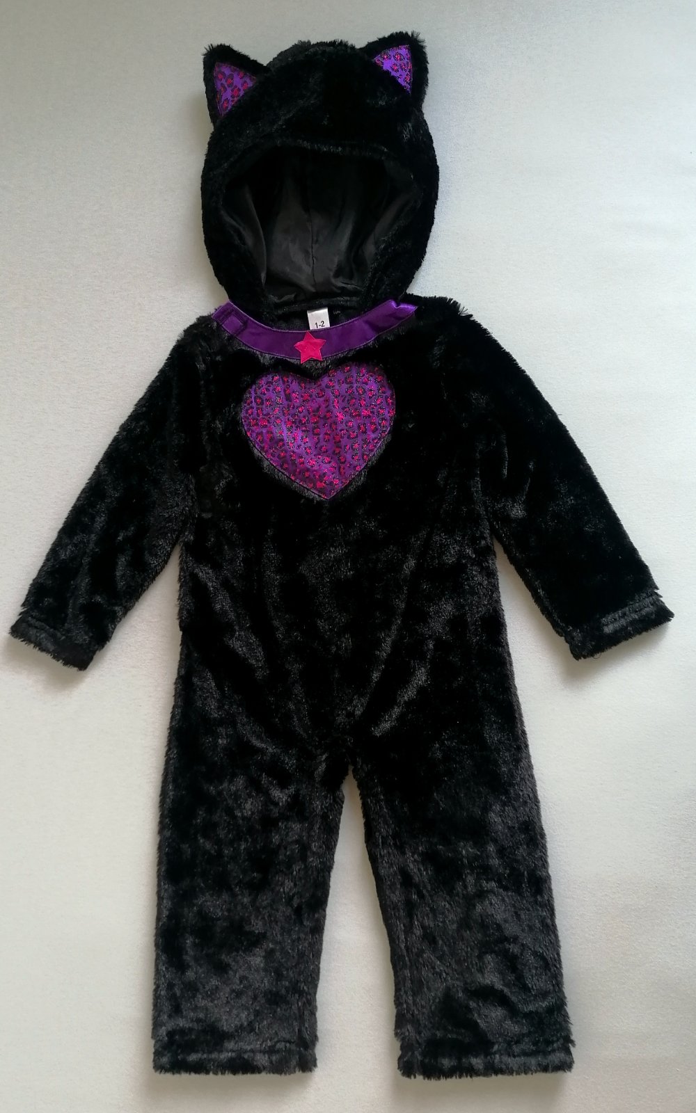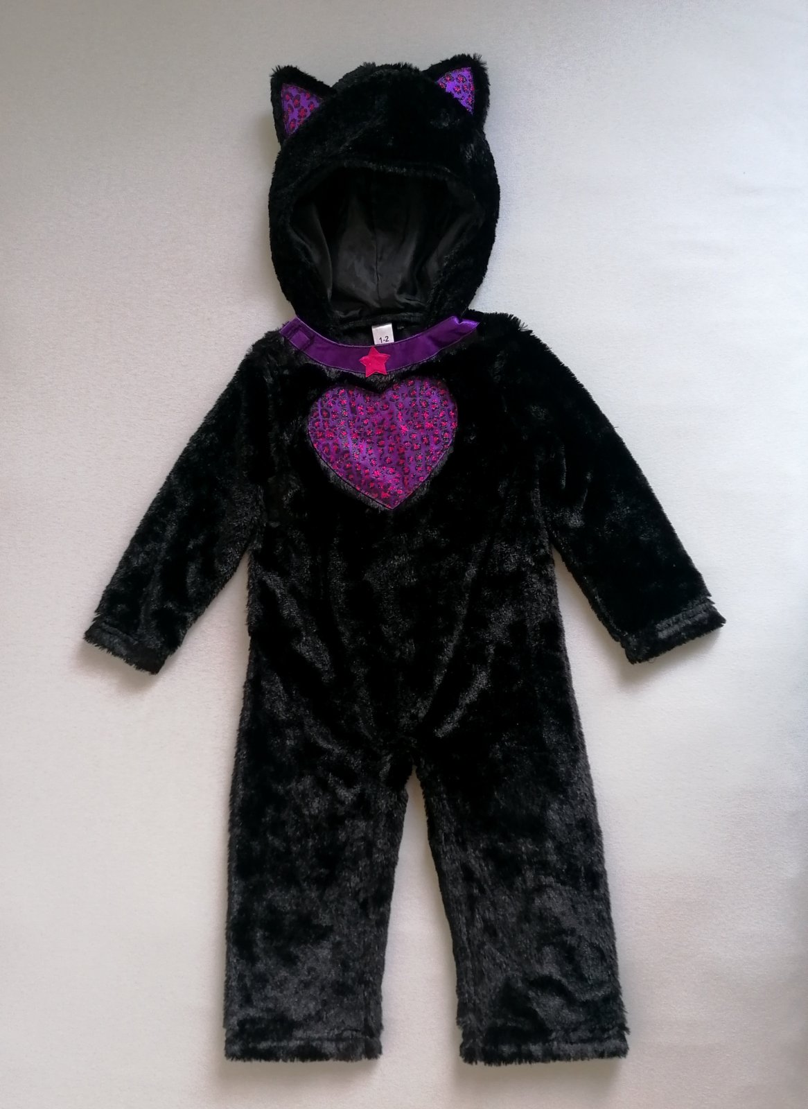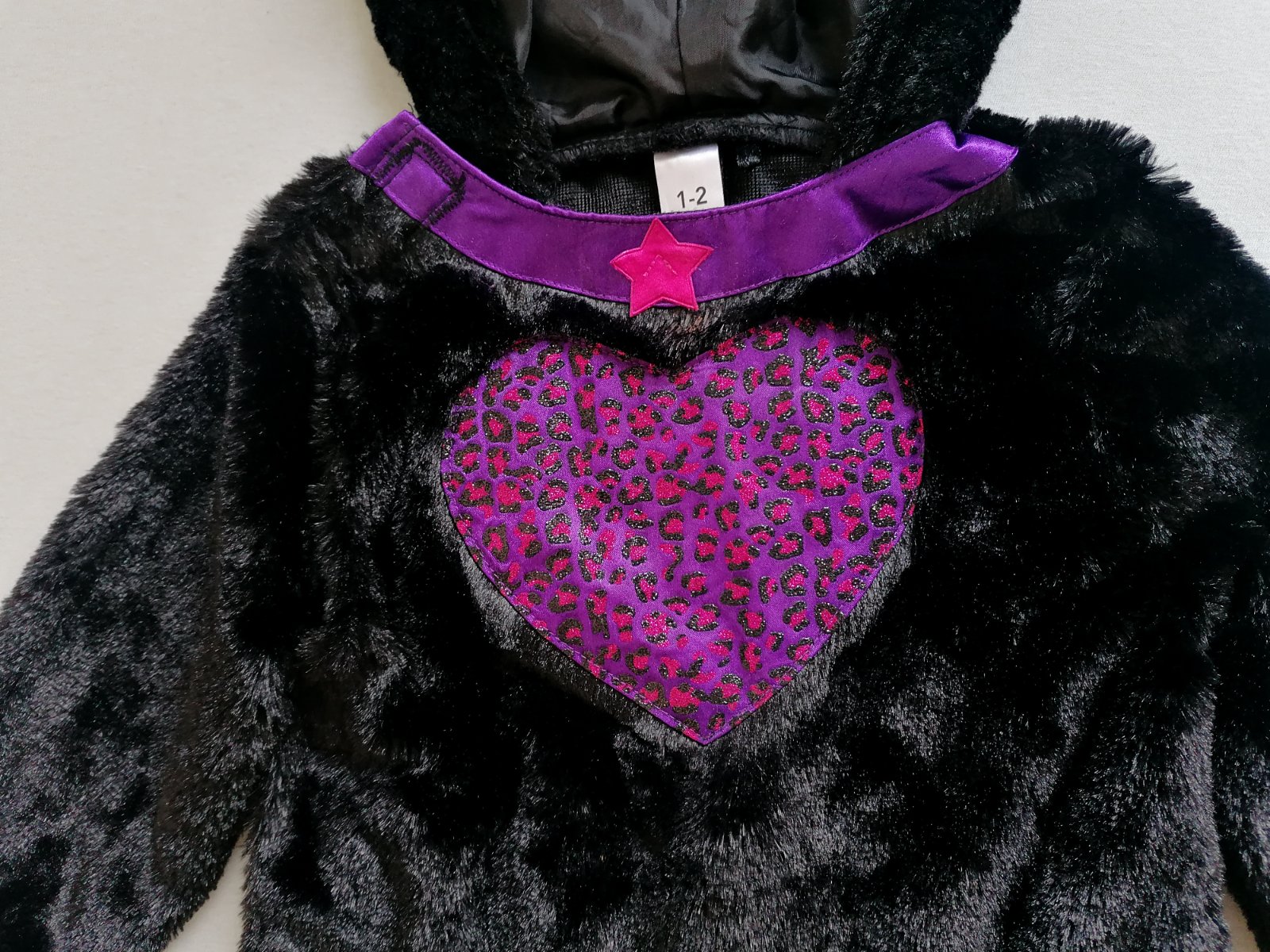 Hebunký, pohodlný plyšový kostým mačičky s trblietavým srdiečkom na hrudi a aplikáciou na uškách. Vzadu chvostík na suchý zips. Top stav bez poškodení, ako nový.