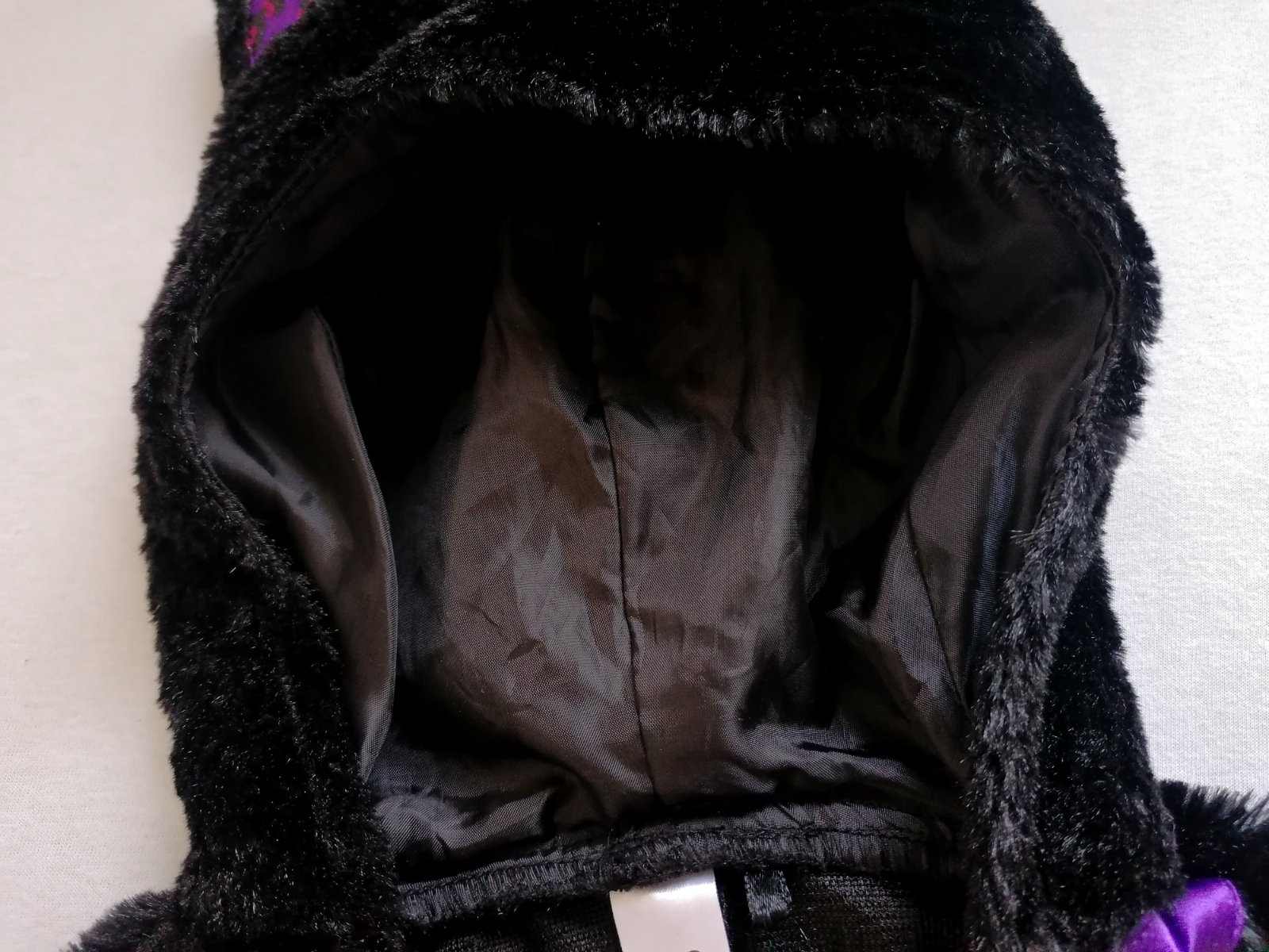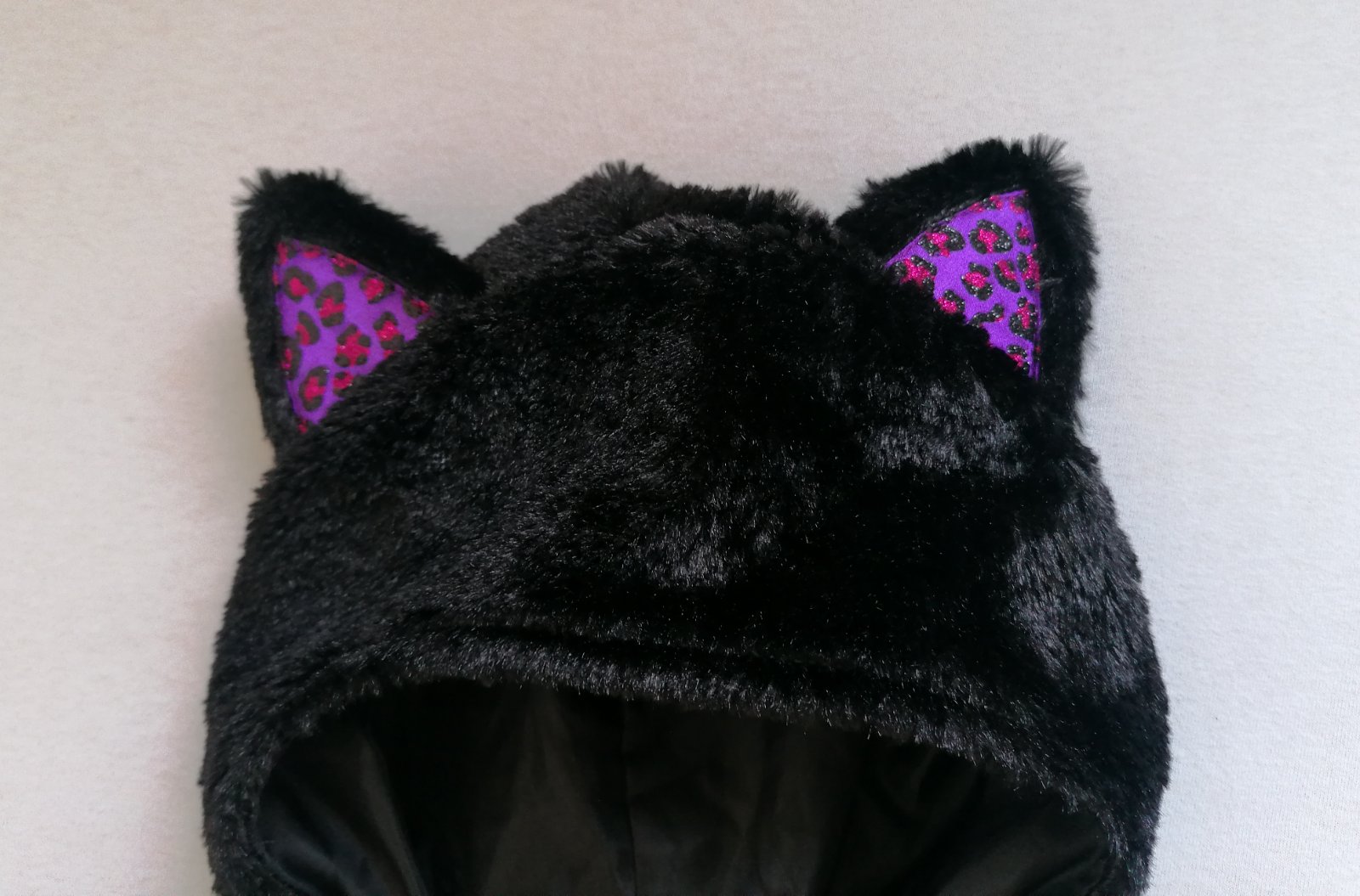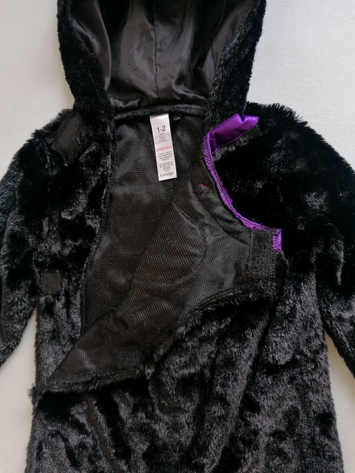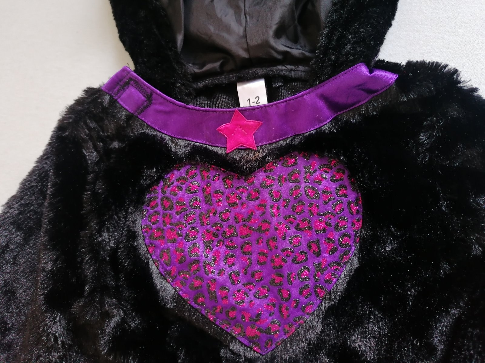 Hebunký, pohodlný plyšový kostým mačičky s trblietavým srdiečkom na hrudi a aplikáciou na uškách. Vzadu chvostík na suchý zips. Top stav bez poškodení, ako nový.