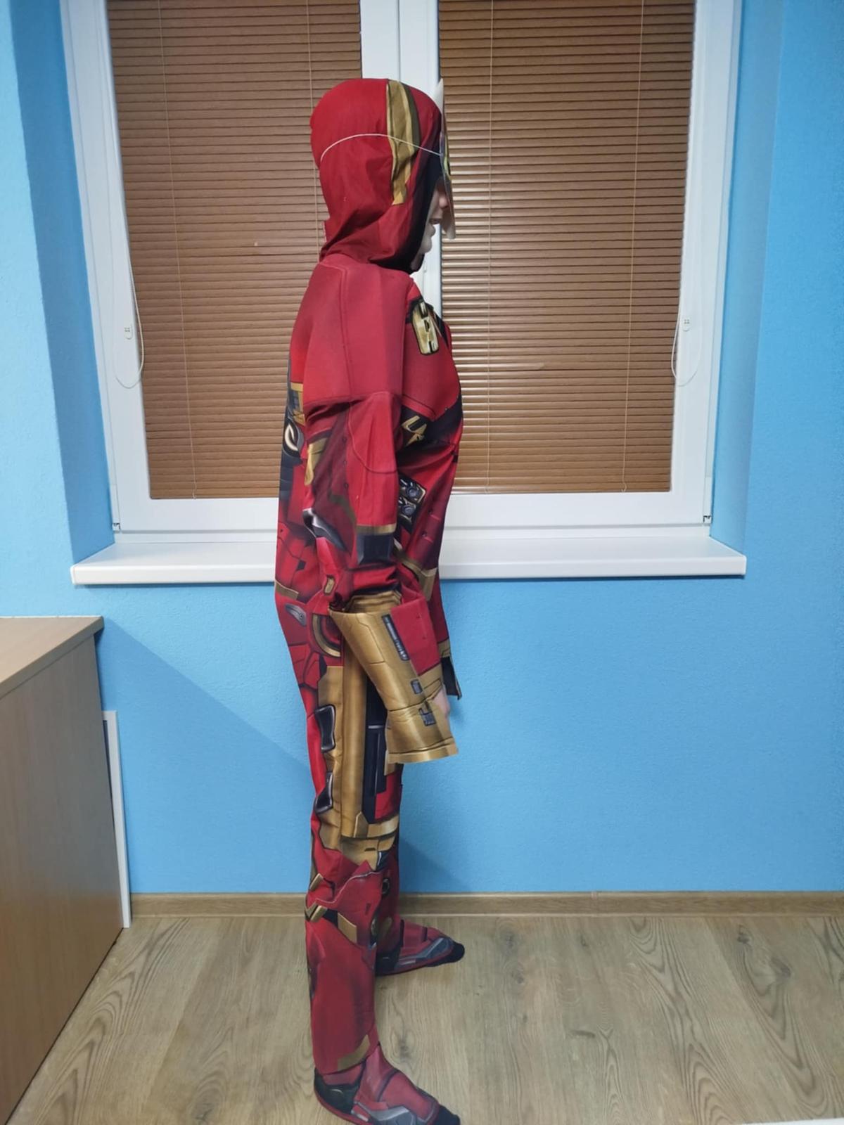 Predám kostým Ironman. Maska na tvár je z papieru. Oblečený 2x. Syn na fotke má 13 rokov a výšku 167 cm.