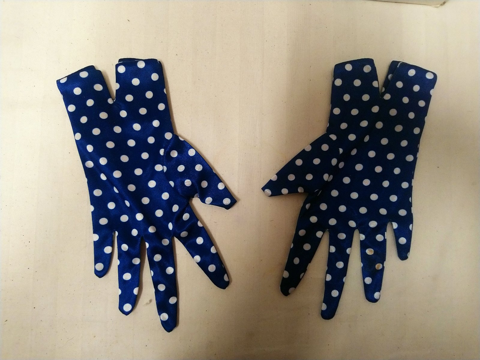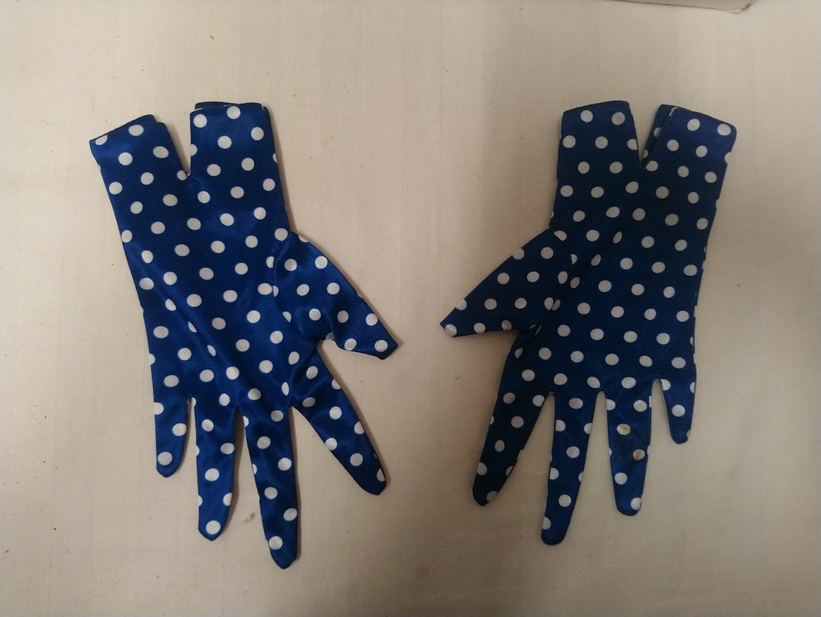 2. modré rukavice s bielymi bodkami