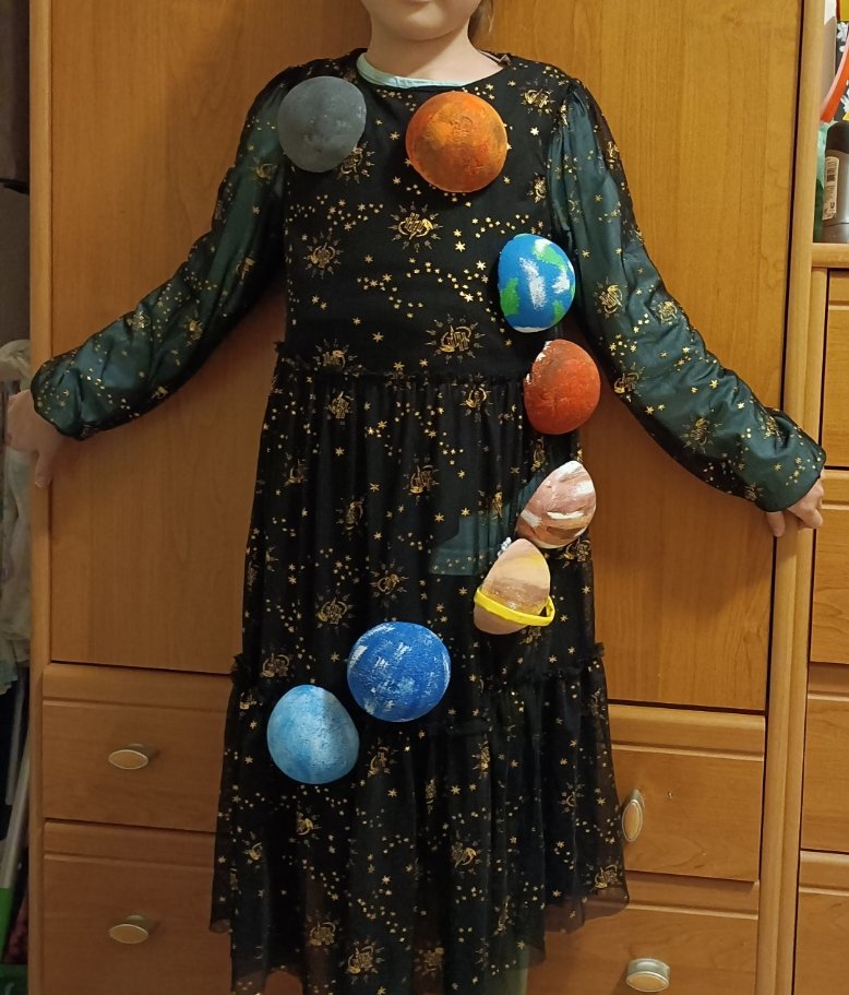 Karnevalový kostým - šaty s 3D planétami - celá slnečná sústava vytvorené z polysterenovych pologúľ. Ručne maľované. Originálny kúsok. Veľkosť 6-10 rokov. V prípade záujmu pomerám.