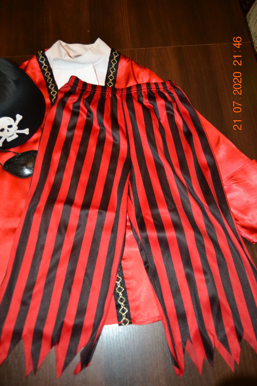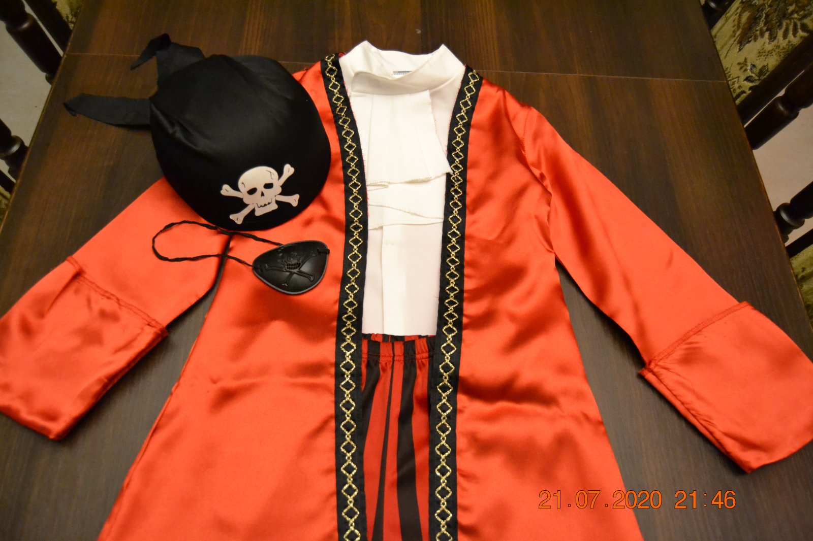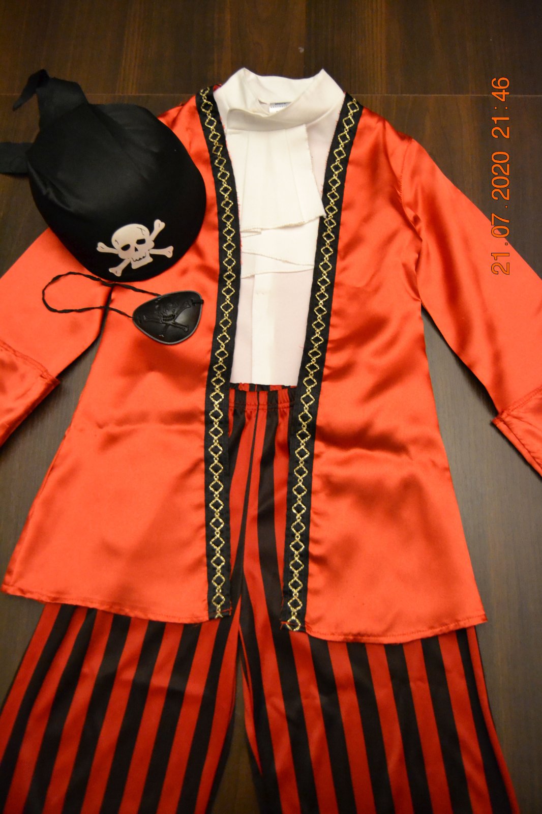 Predám kostým piráta, veľkosť uvedená 116-128. Použitý 2 krát. Na umelom trojuholníku na prekrytie oka treba vymeniť gumičku. Kostým je bez opasku. Ja som synovi dala svoj. Syn ho mal v 6. rokoch.