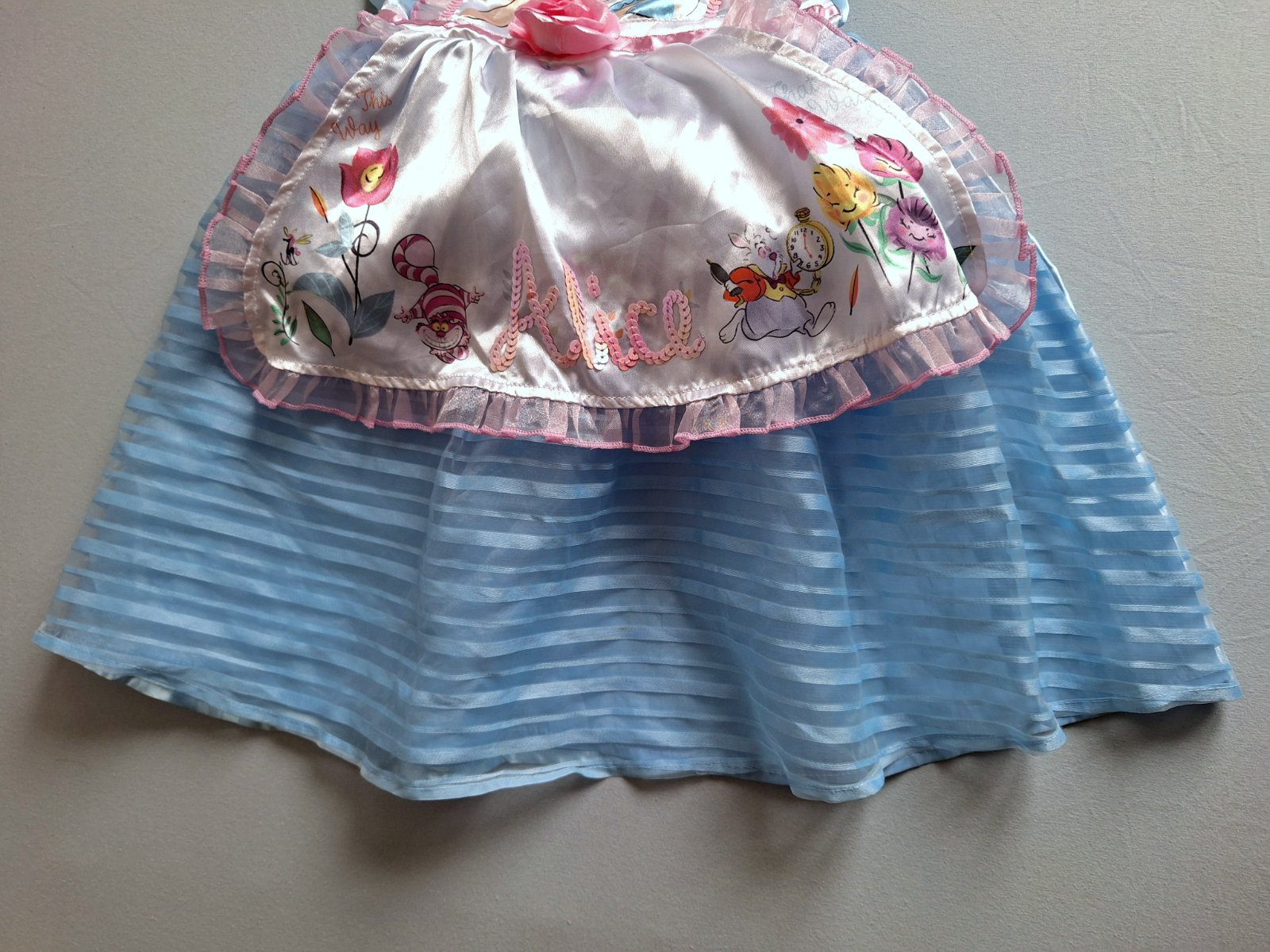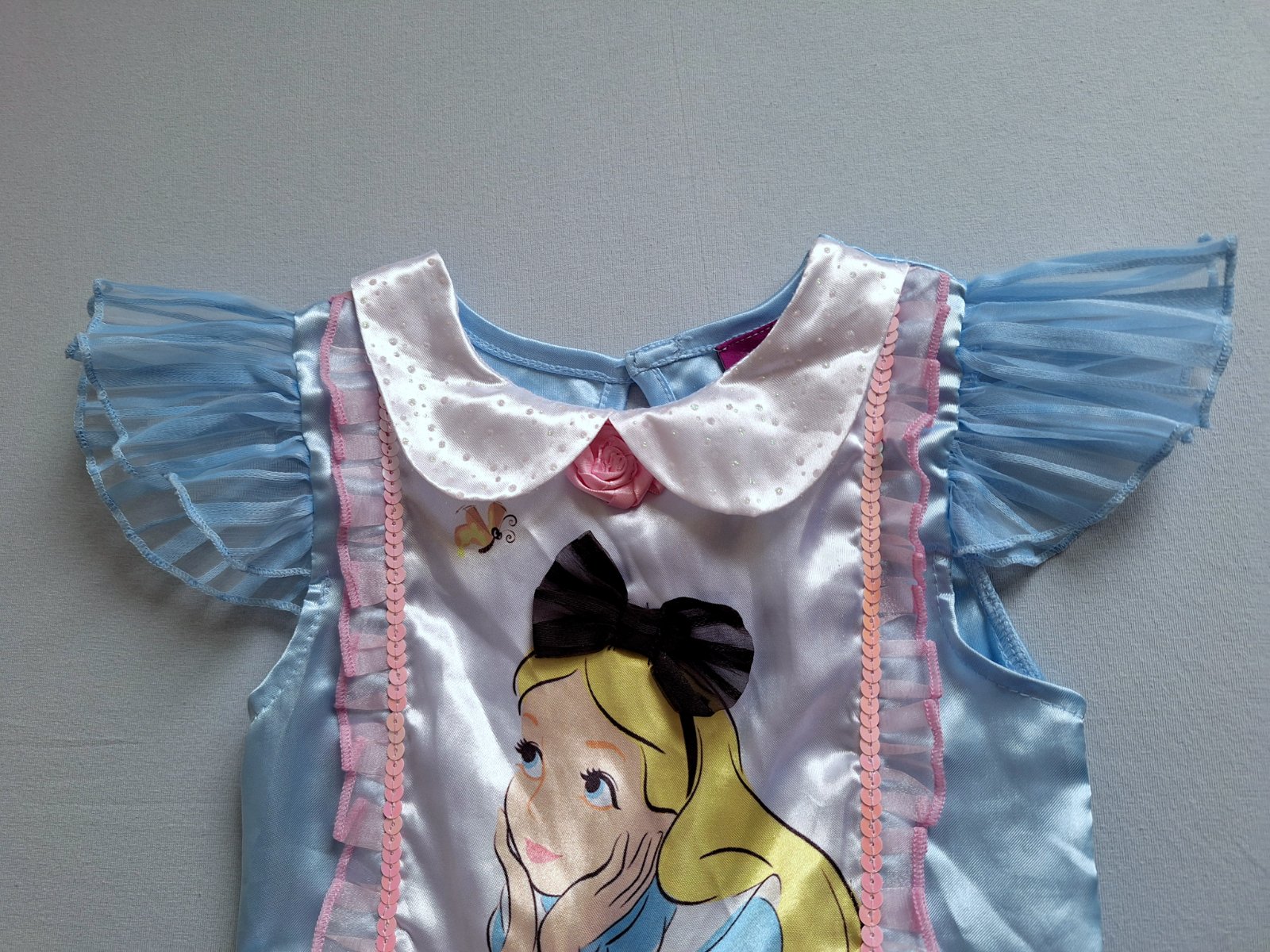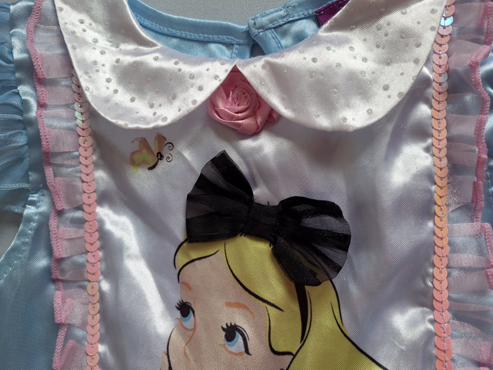 Stav: Top stav bez poškodení a známok nosenia, vhodné aj ako dar. Exkluzívny kostým Alice, je do detailov prepracovaný, našitou mašľou, ružou v páse aj pod krkom, trblietky na golieriku a zdobený flitrami a volánikmi. Šaty majú pevnú spodničku , čím sukňa pekne drží nadýchaný tvar.