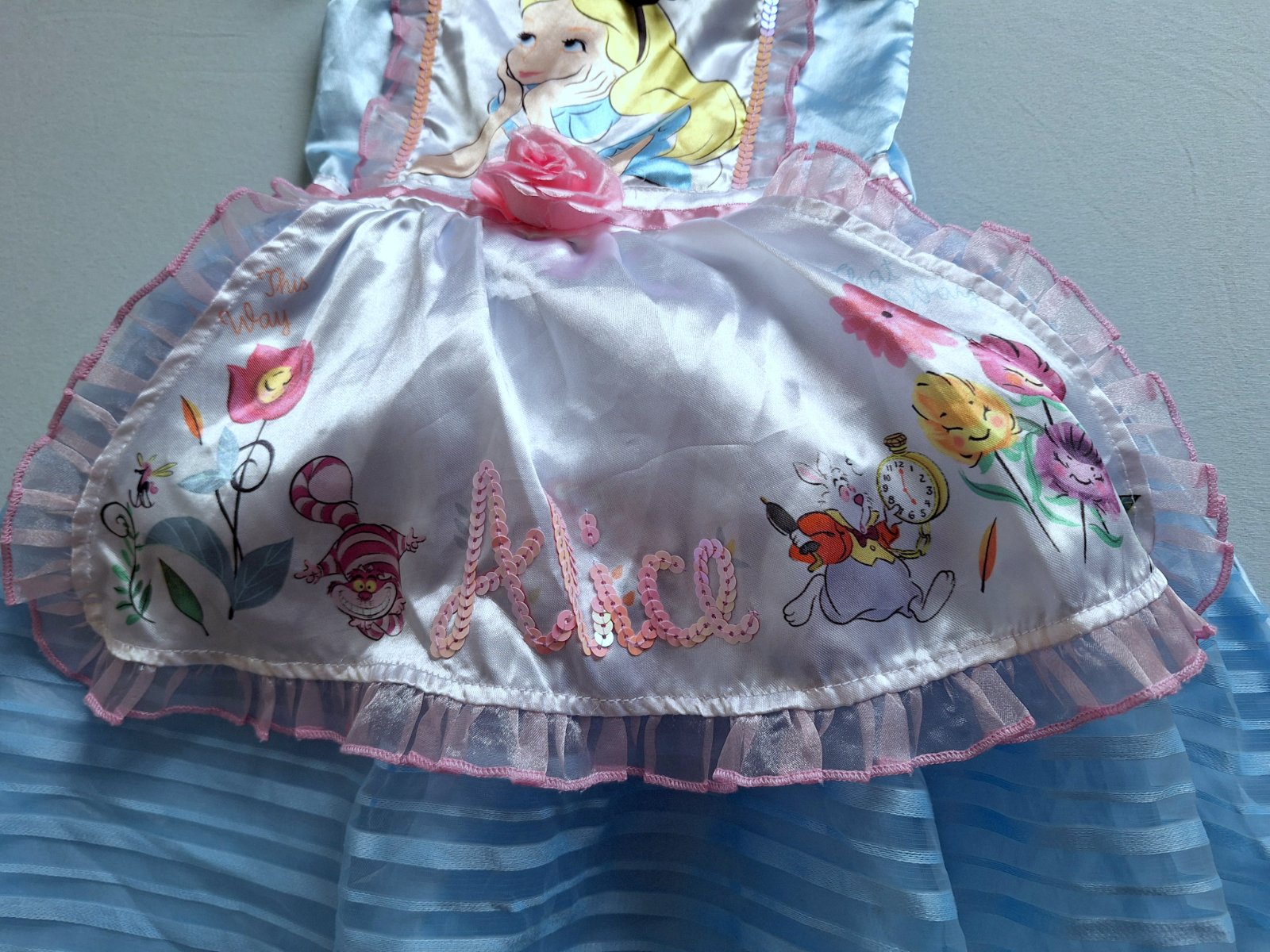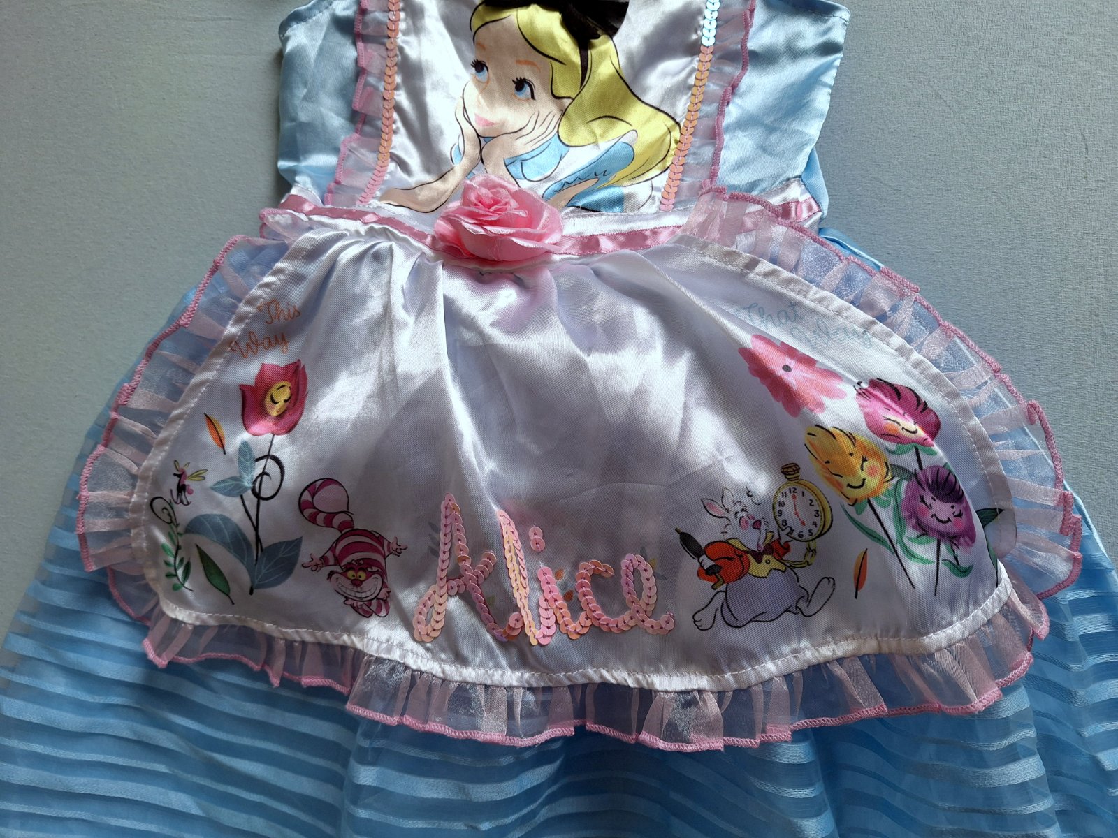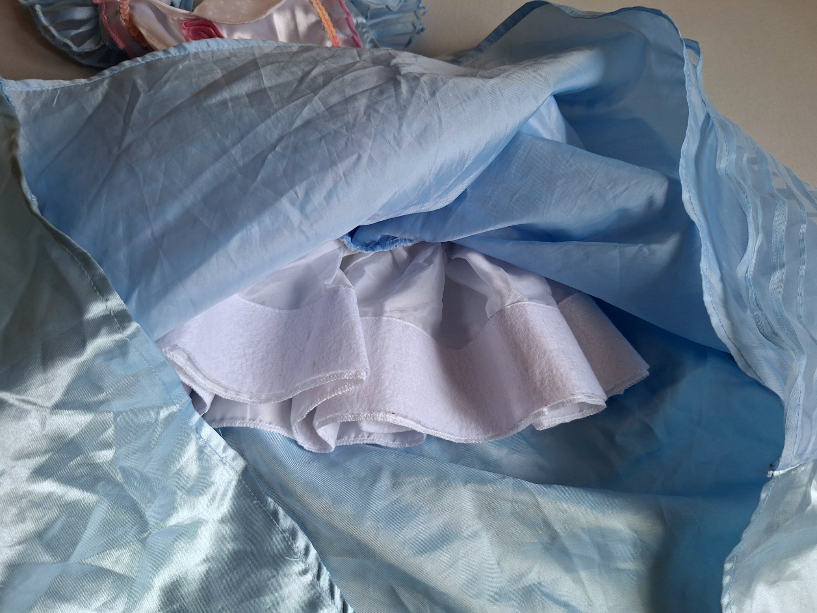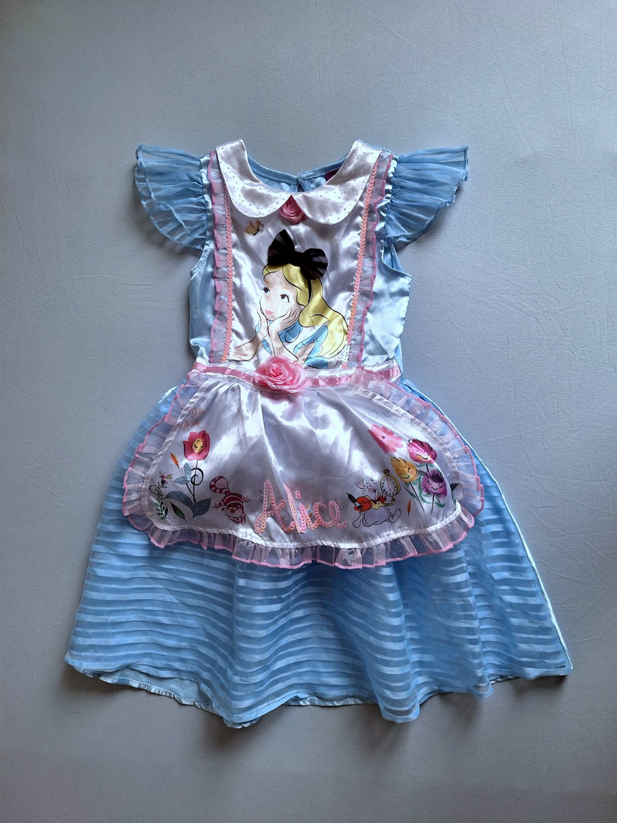 Stav: Top stav bez poškodení a známok nosenia, vhodné aj ako dar. Exkluzívny kostým Alice, je do detailov prepracovaný, našitou mašľou, ružou v páse aj pod krkom, trblietky na golieriku a zdobený flitrami a volánikmi. Šaty majú pevnú spodničku , čím sukňa pekne drží nadýchaný tvar.