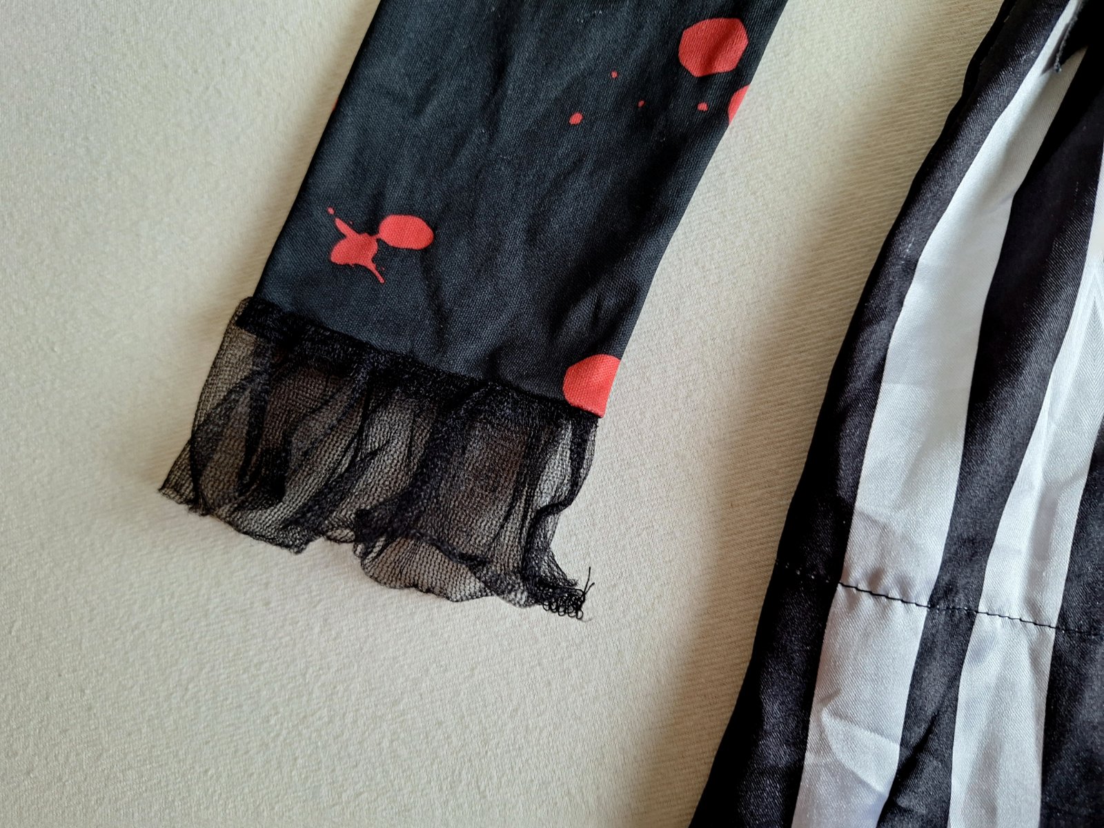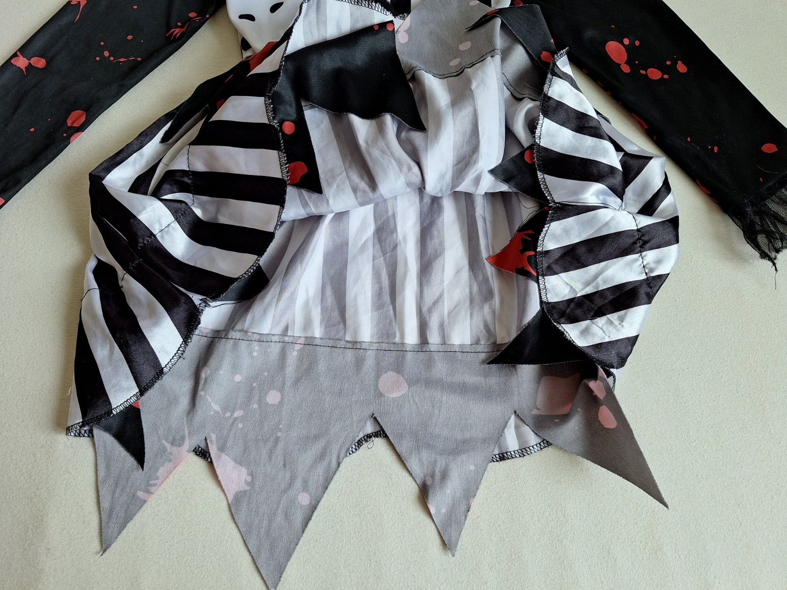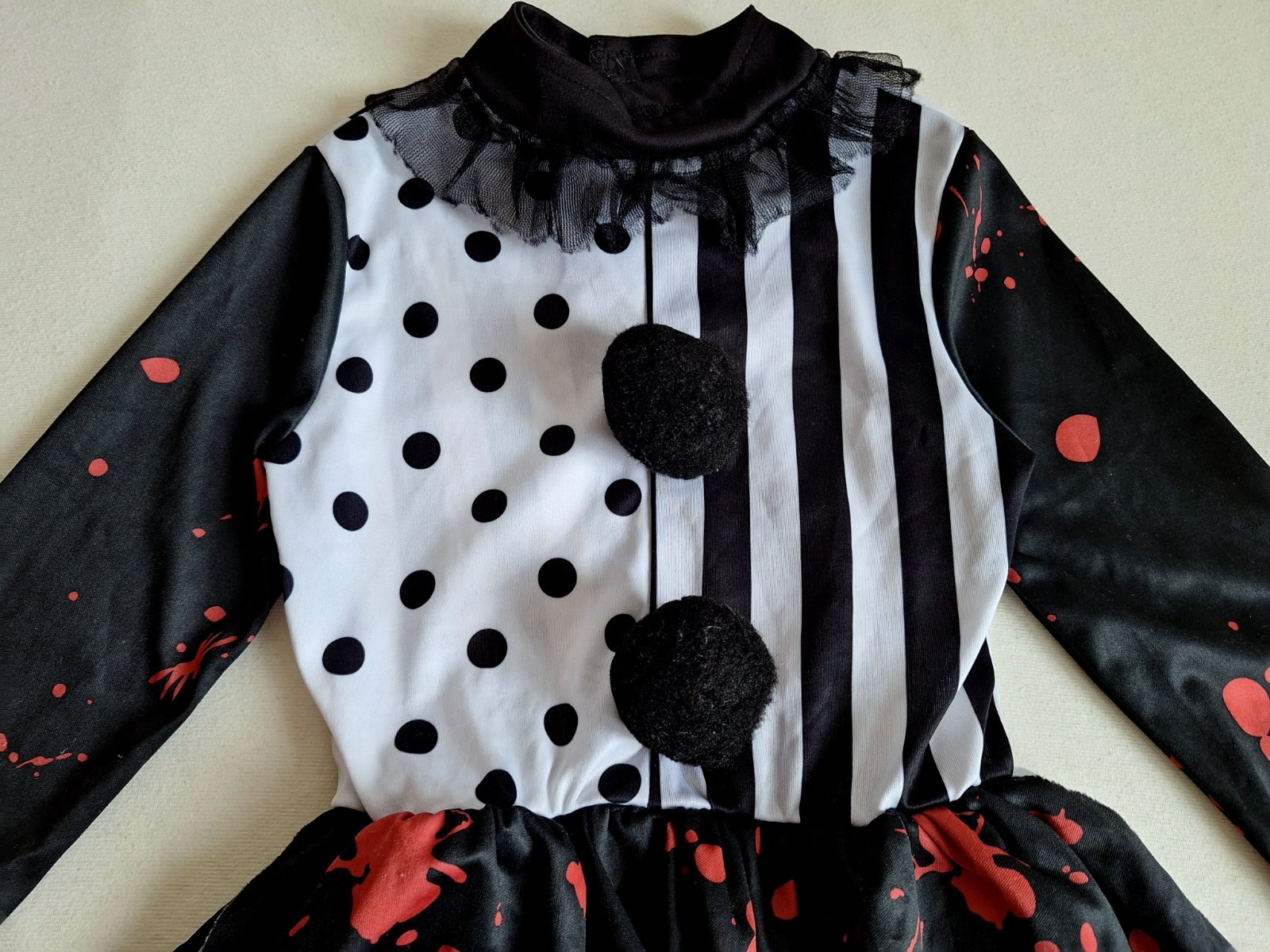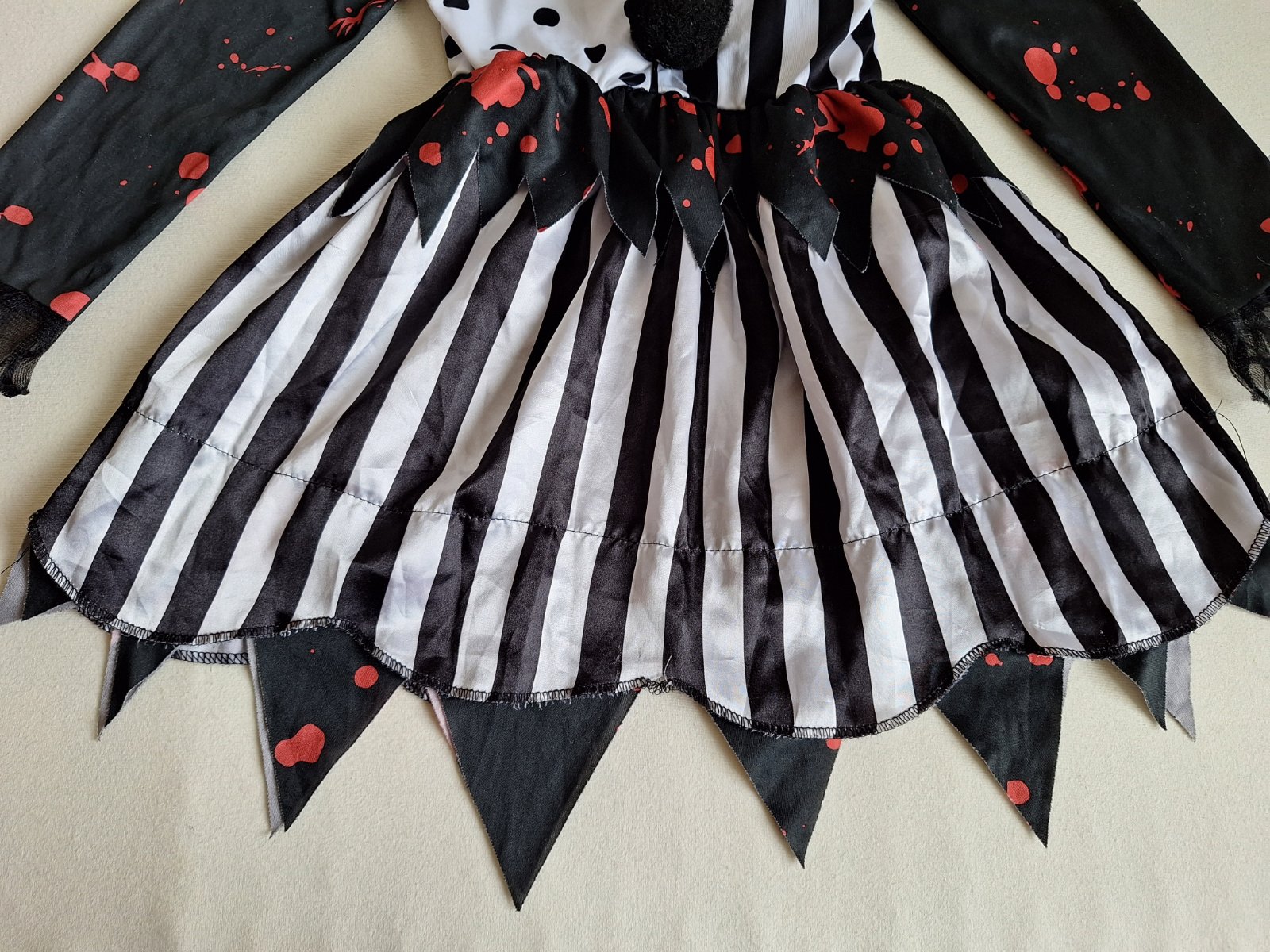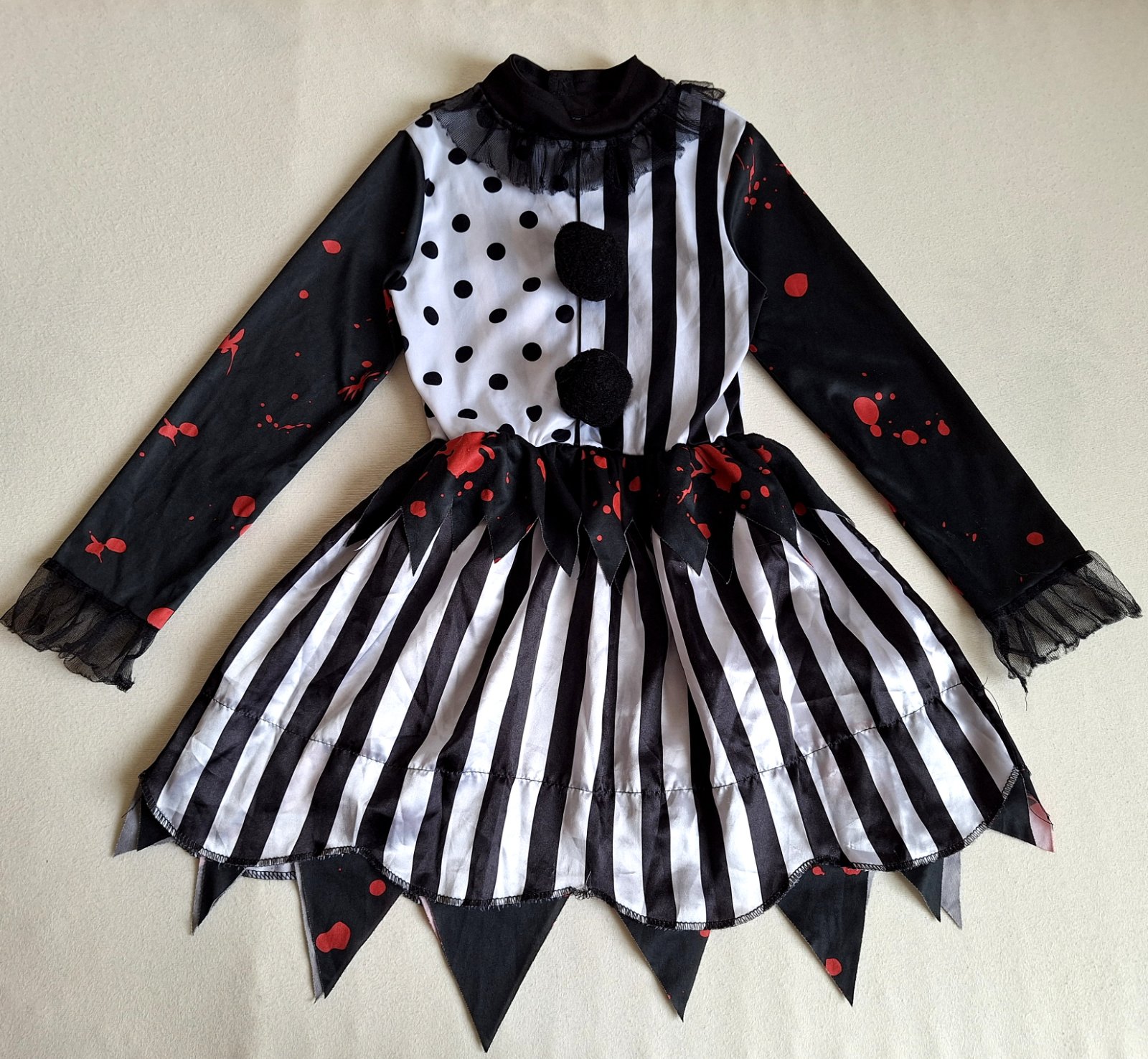 Exkluzívny kostým, je v top stave, bez poškodení. Vhodný na karneval aj halloween. Elastický živôtik s brmbolcami a okolo stojačika a na rukávoch riasený ozdobný tyl. Suknička bohato riasená, lesklá saténová v páse guma. Živôtik elastický, pohodlný pri nosení.