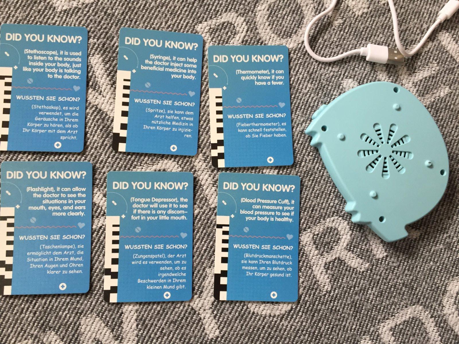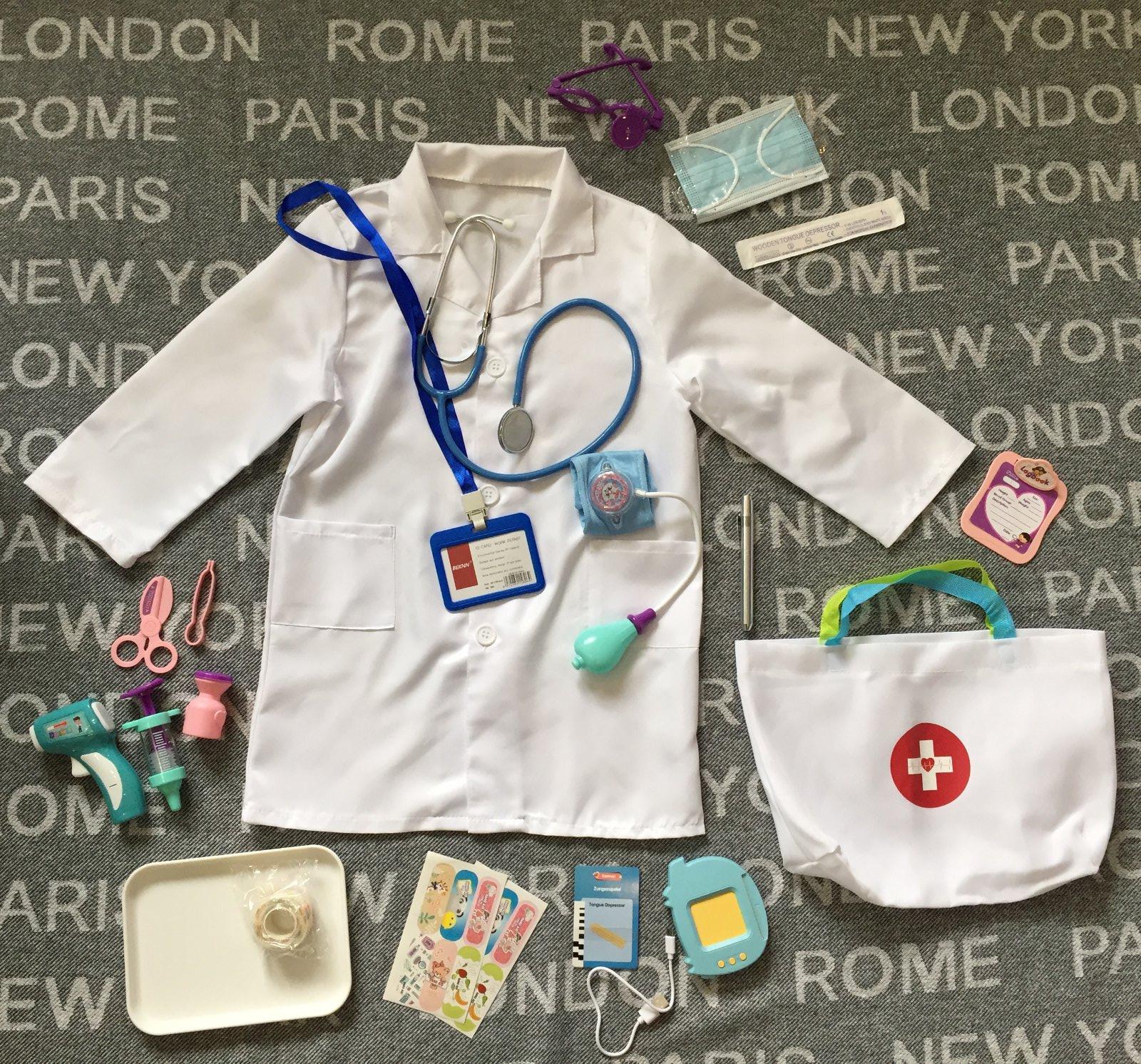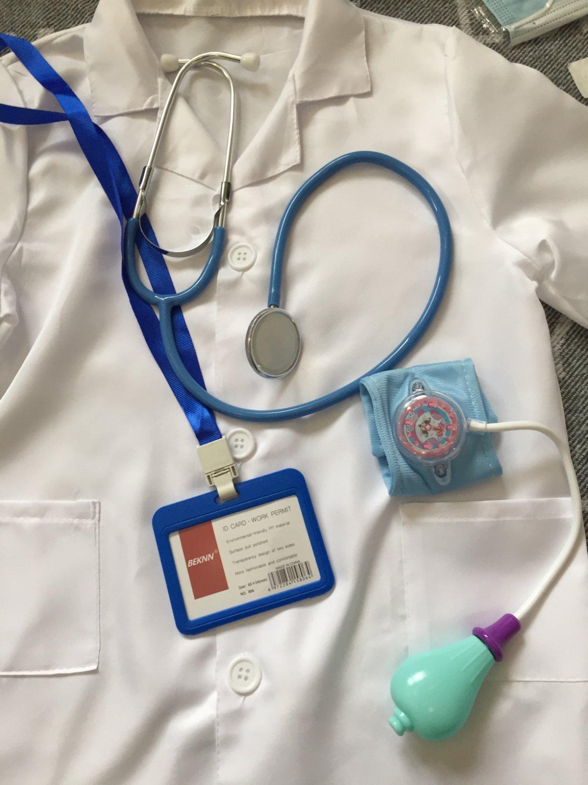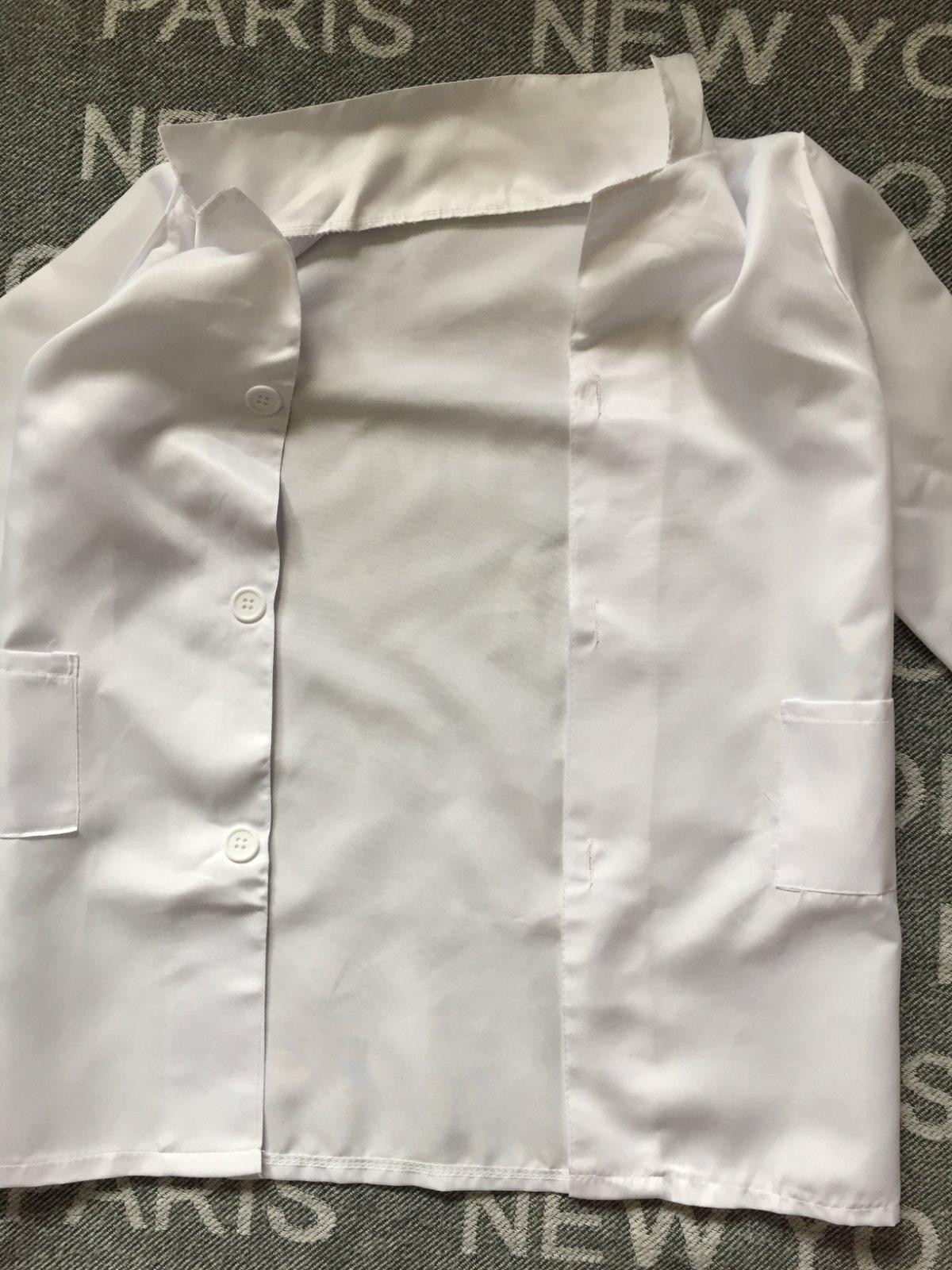 Kostym lekarka s doplnkami je novy, nepouzity. Velkost cca 104-110. Plast dlzka je 63cm, sirka cez prsia 40cm, rukav 39cm. Edukacny pristroj cita karticky po anglicky a hned potom po nemecky. Latkova taska. Obsahuje baterku-svieti, teplomer tiez, striekacka vydava zvuk, tlakomer sa toci.. A dalsie doplnky ako na foto.