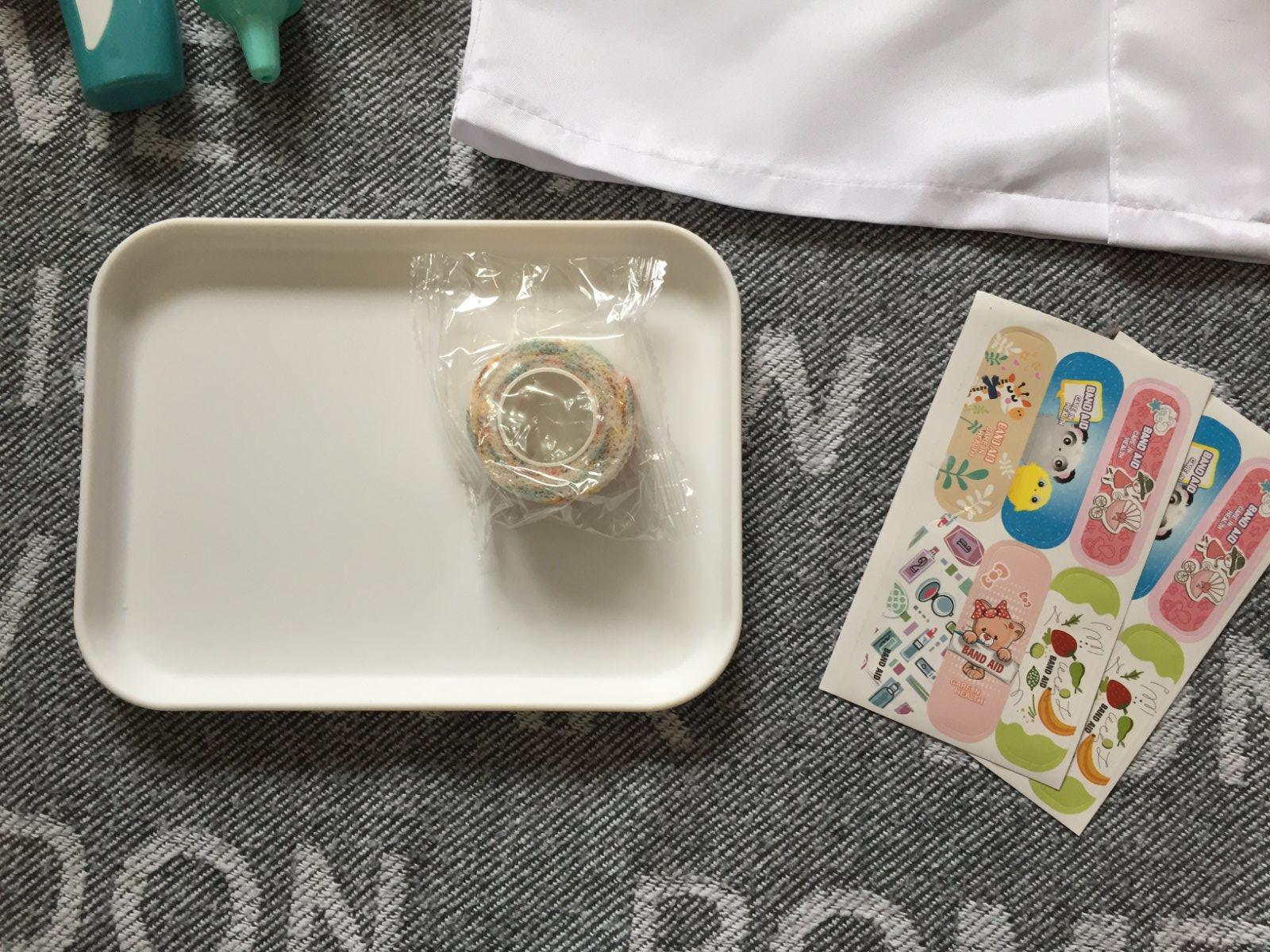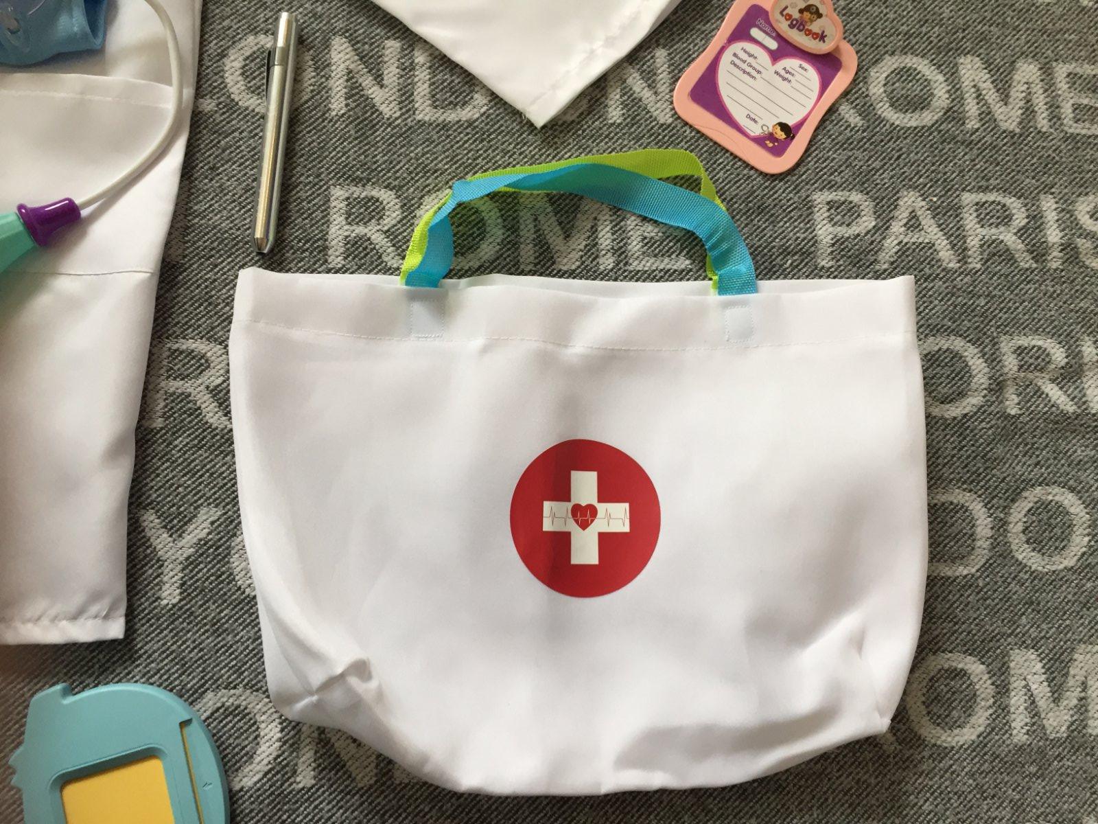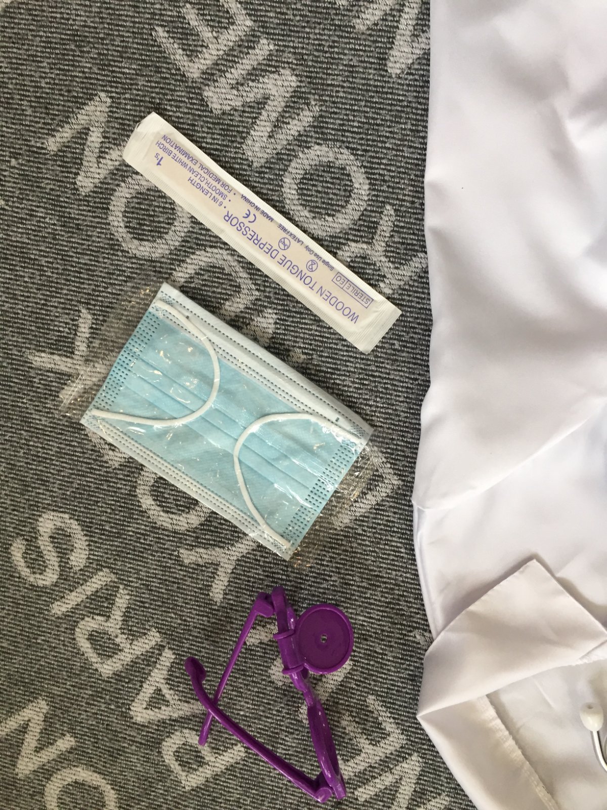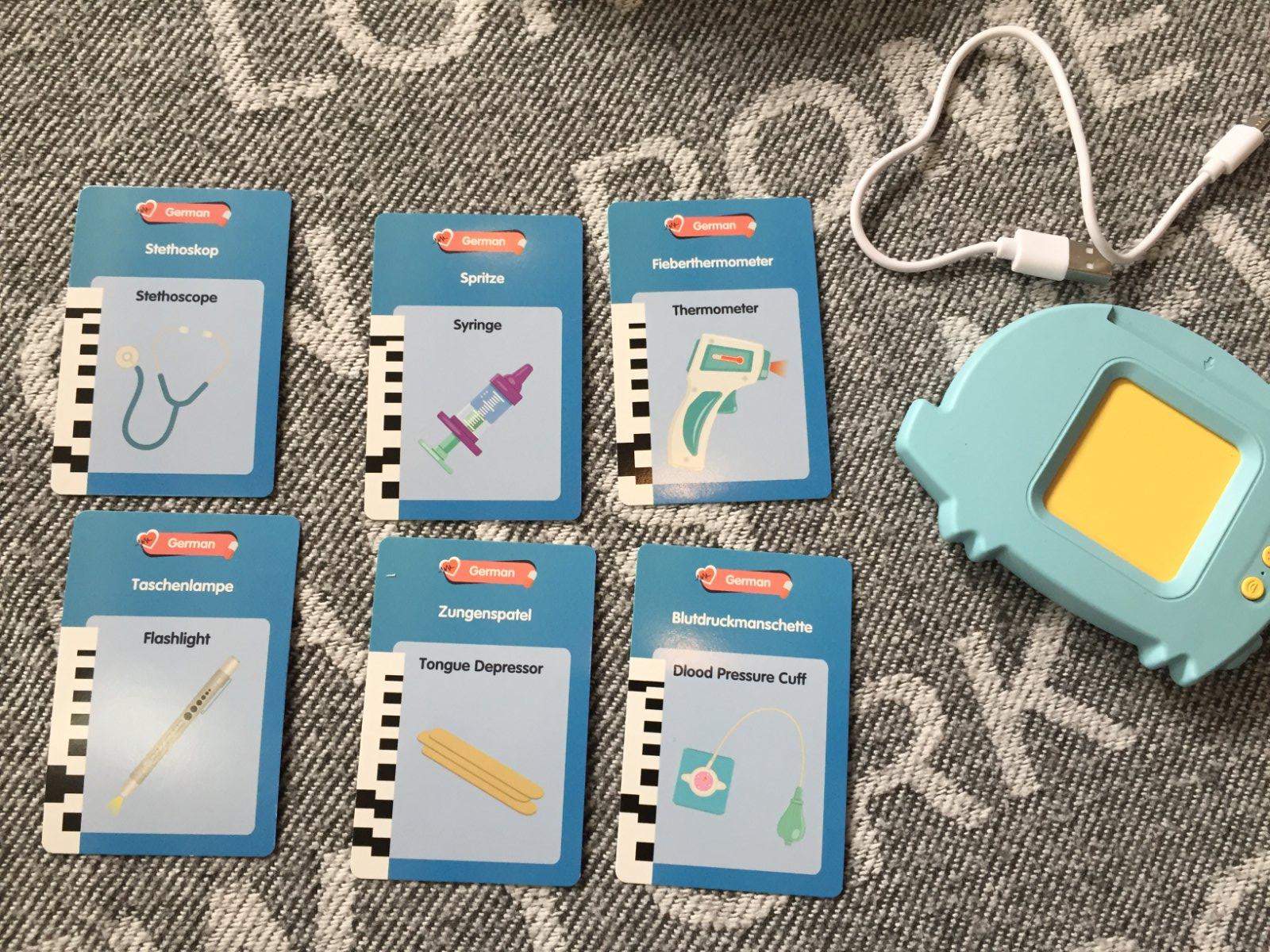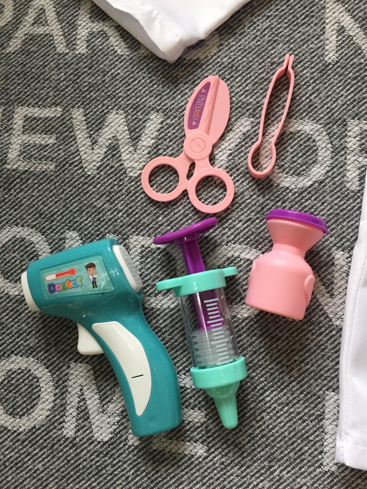 Kostym lekarka s doplnkami je novy, nepouzity. Velkost cca 104-110. Plast dlzka je 63cm, sirka cez prsia 40cm, rukav 39cm. Edukacny pristroj cita karticky po anglicky a hned potom po nemecky. Latkova taska. Obsahuje baterku-svieti, teplomer tiez, striekacka vydava zvuk, tlakomer sa toci.. A dalsie doplnky ako na foto.