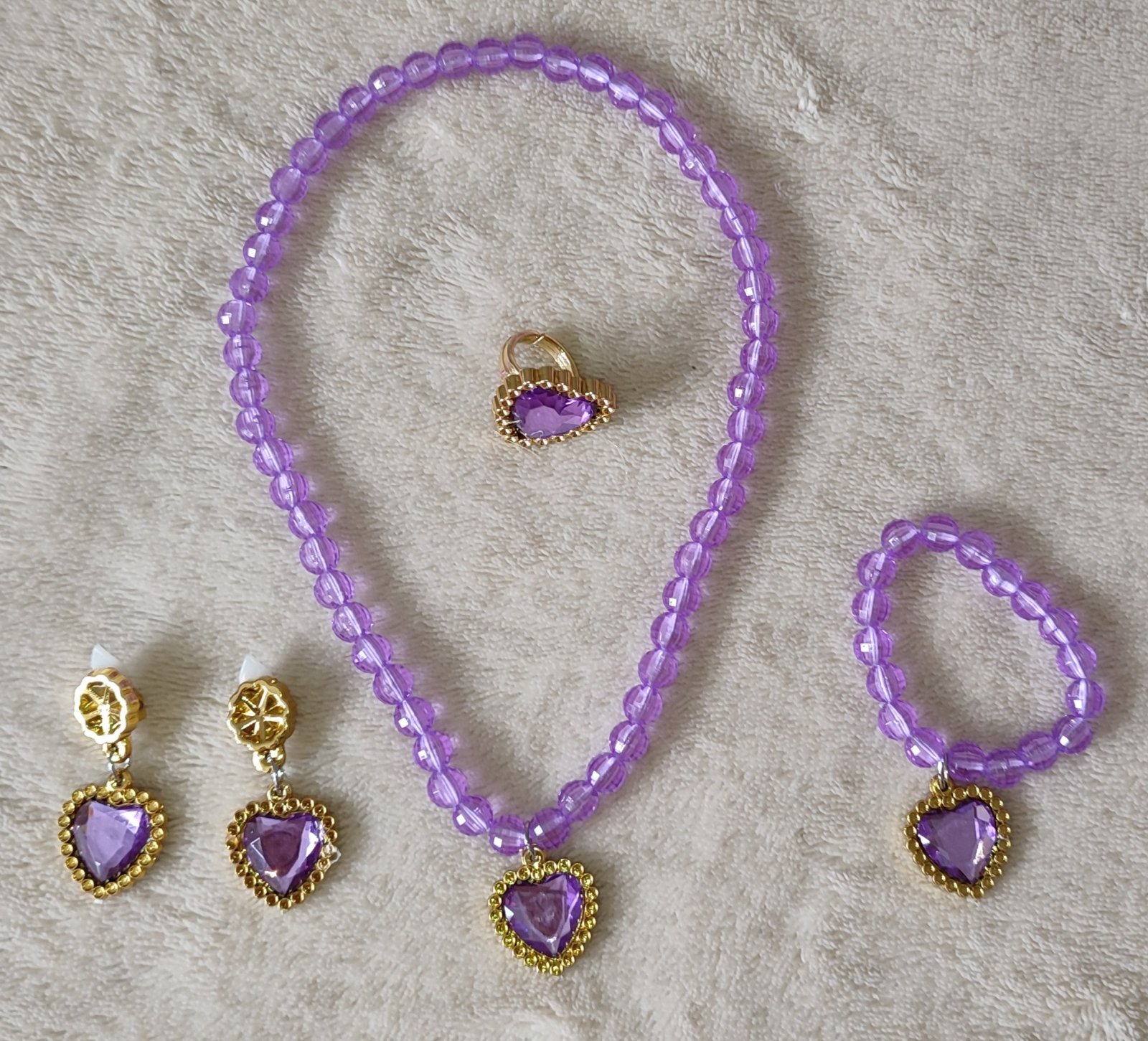 Krásne bledo fialové rukavičky a bižutéria pre princeznú (náhrdelník, náramok, prsteň, náušnice).