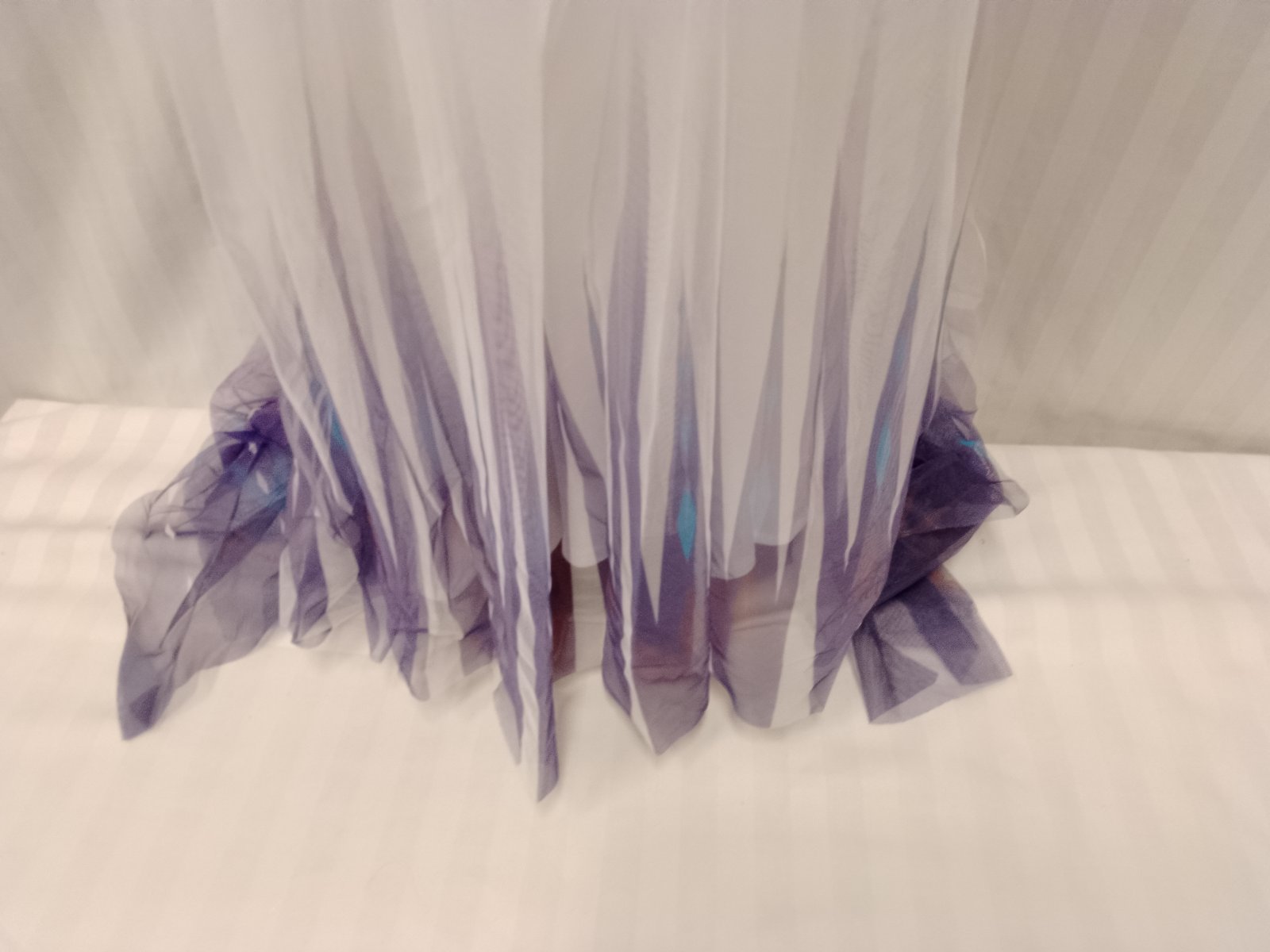 Nový Kostým Frozen Elsa bielofialové šaty obsahujú biele šaty s dlhým rukávom ozdobené fialovo modrým vzorom, v páse je gumička. Spodná časť - sukňa je z dvoch vrstiev, spodná vrstva je biela, vrchná vrstva je biela s odtieňami fialovej a modrej v spodnej časti, je tylová, padavá, obe majú prekrytý rozparok do pásu. Vzadu na šatách na chrbáte sú prišité 2ks závoja, ktoré sú dlhšie ako šaty.