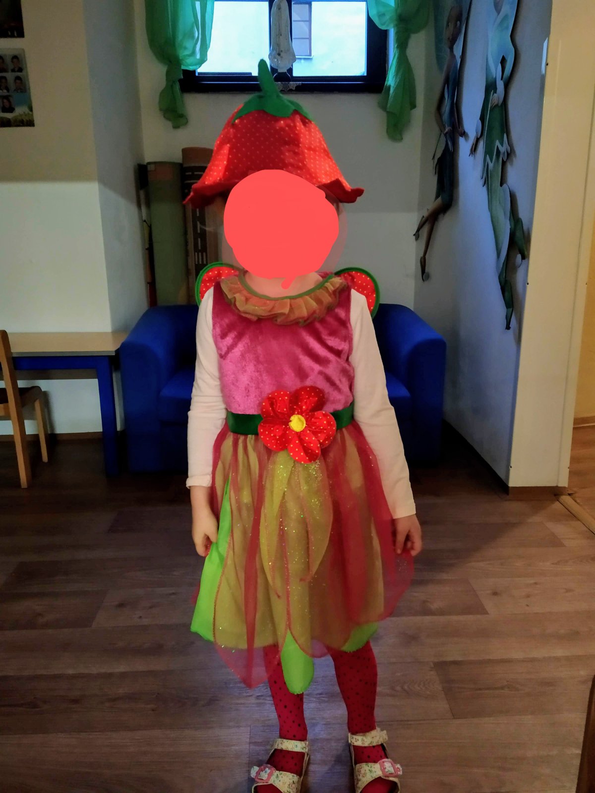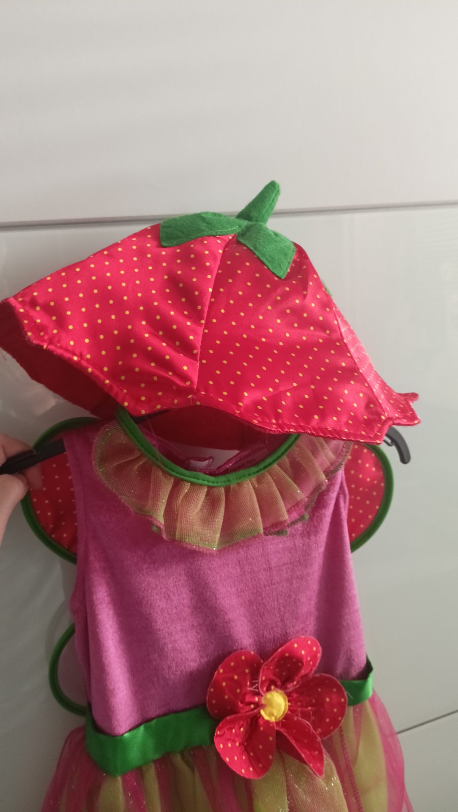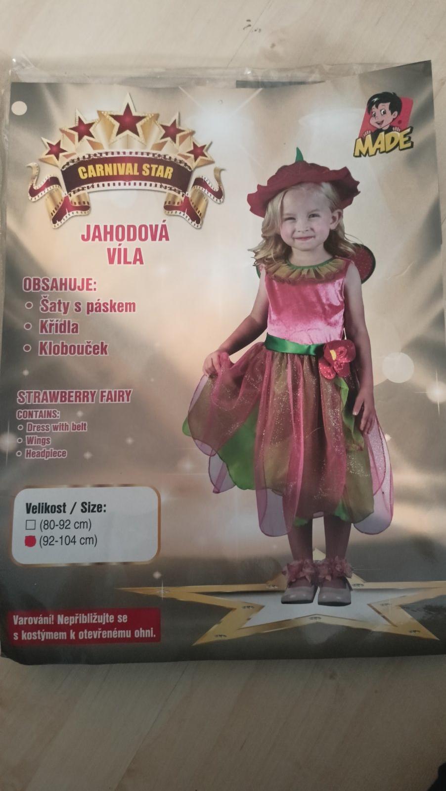 Predám karnevalový kostým - jahodová víla. Veľkosť 92-104. Mali sme ho vo veku 3,5 roka 2x oblečený.