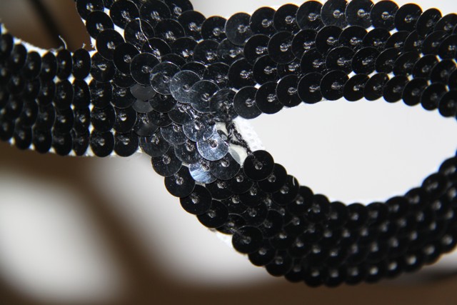 Top vyšitý flitrami a ozdobnými kamienkami, vzadu na šnúrku a zapínanie na boku na háčiky. Na škraboške pri nose chýba jeden fliter. Inak vo veľmi dobrom stave.