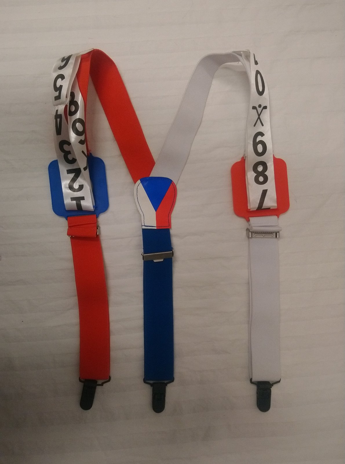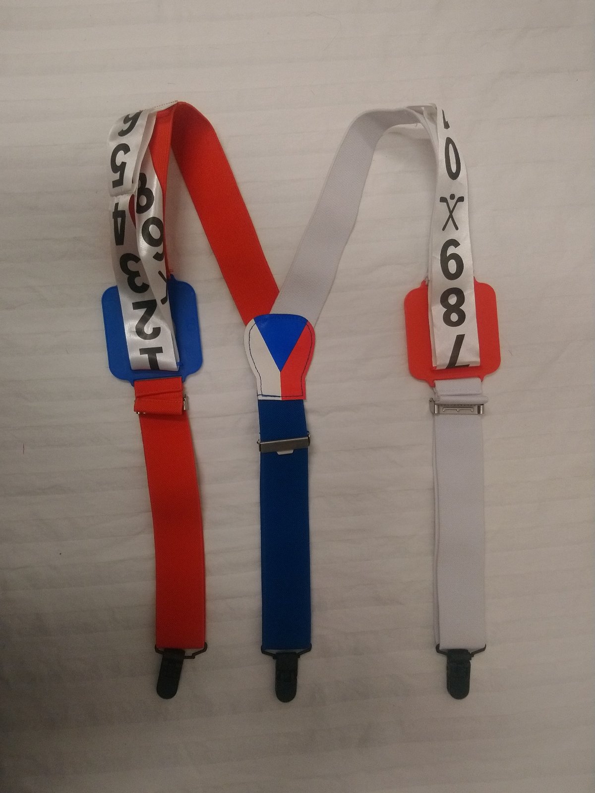 Doplnok kostýmu šašo-klaun štýlové farebné Traky, sú pestrofarebné, farby červená, biela, modrá, čierna, s farebným motívom, nastaviteľná dĺžka,