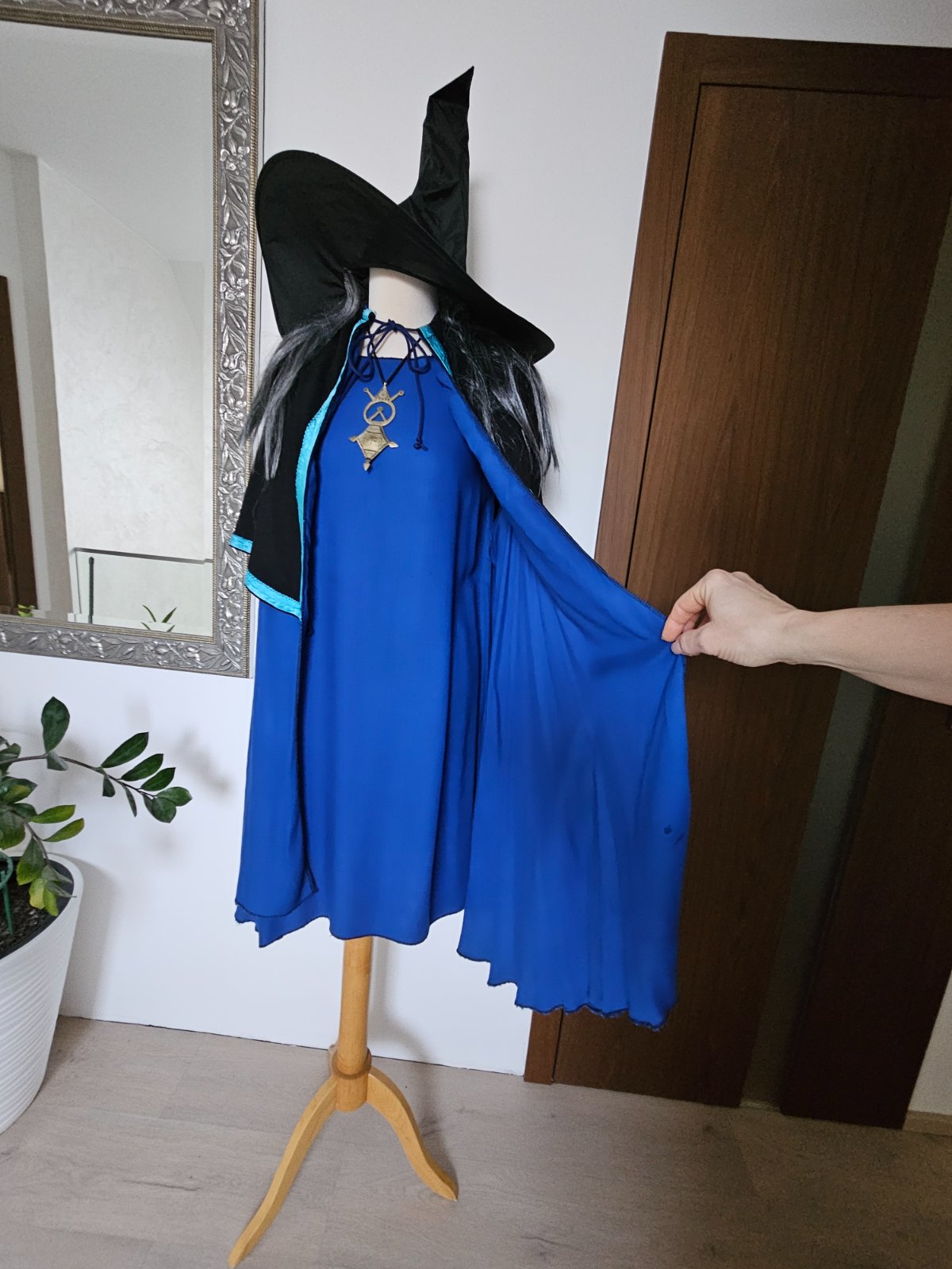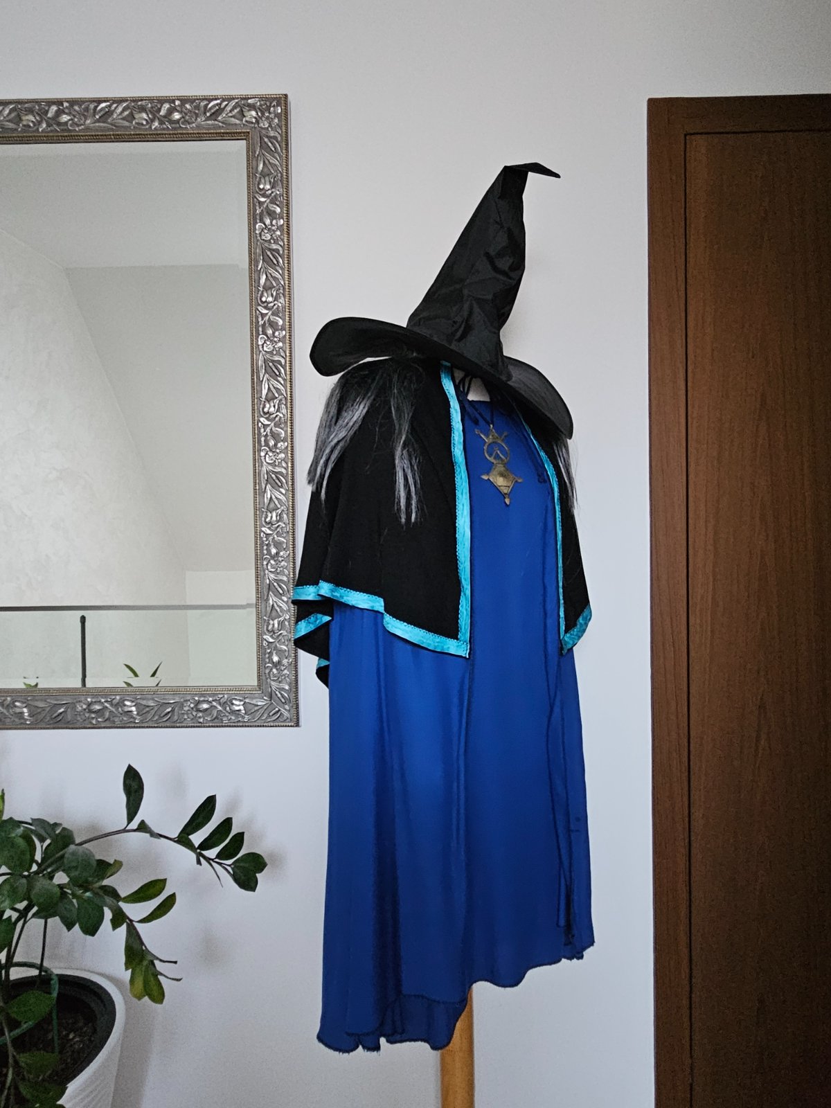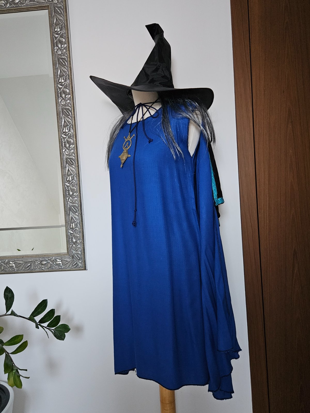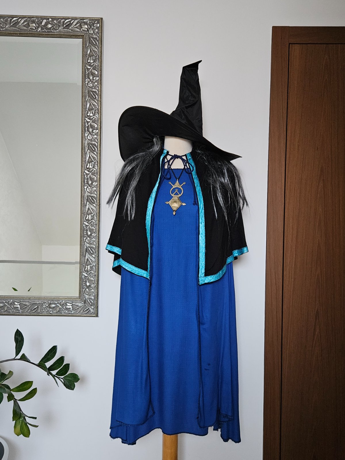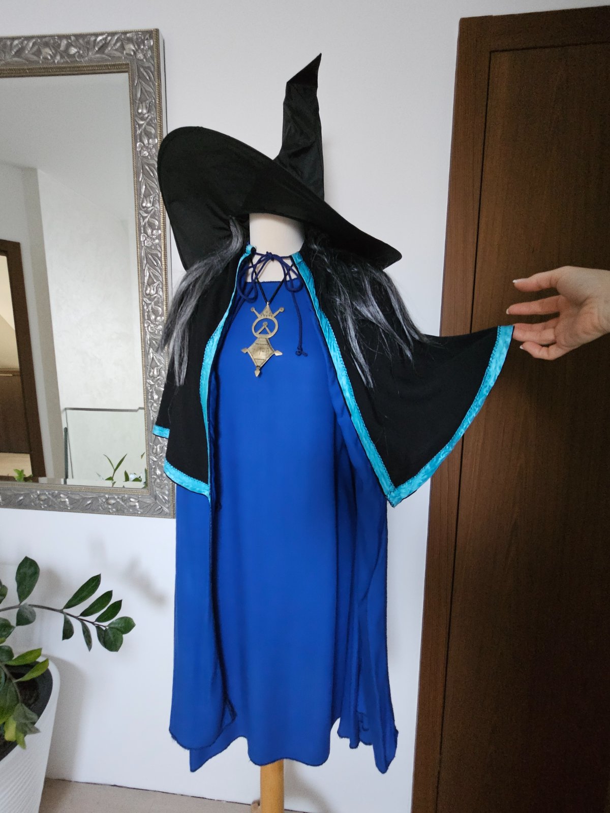 Hand-made čarodejnícky kostým na karneval pre dieťa vo veku od 6 rokov. Námet bol Harry Potter. Kostým sa skladá z modrej tuniky a a plášťa. K tomu je čarodejnícky klobúk a ornament na krk. Paličku sme asi stratili. Kostým bol nosený, má malé pretrhnutie na zadnej strane, ktoré sme prekryli záplatou, ale pokiaľ je oblečený plášť, nie je ju vidieť. Na prednej strane je fliačik. Určite ešte niekoho poteší.