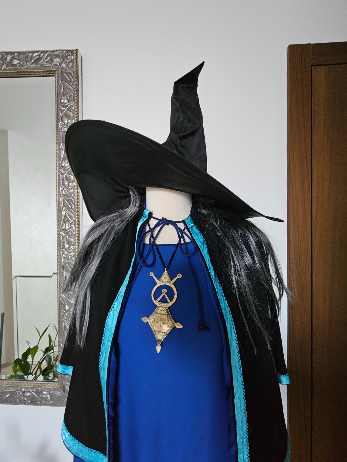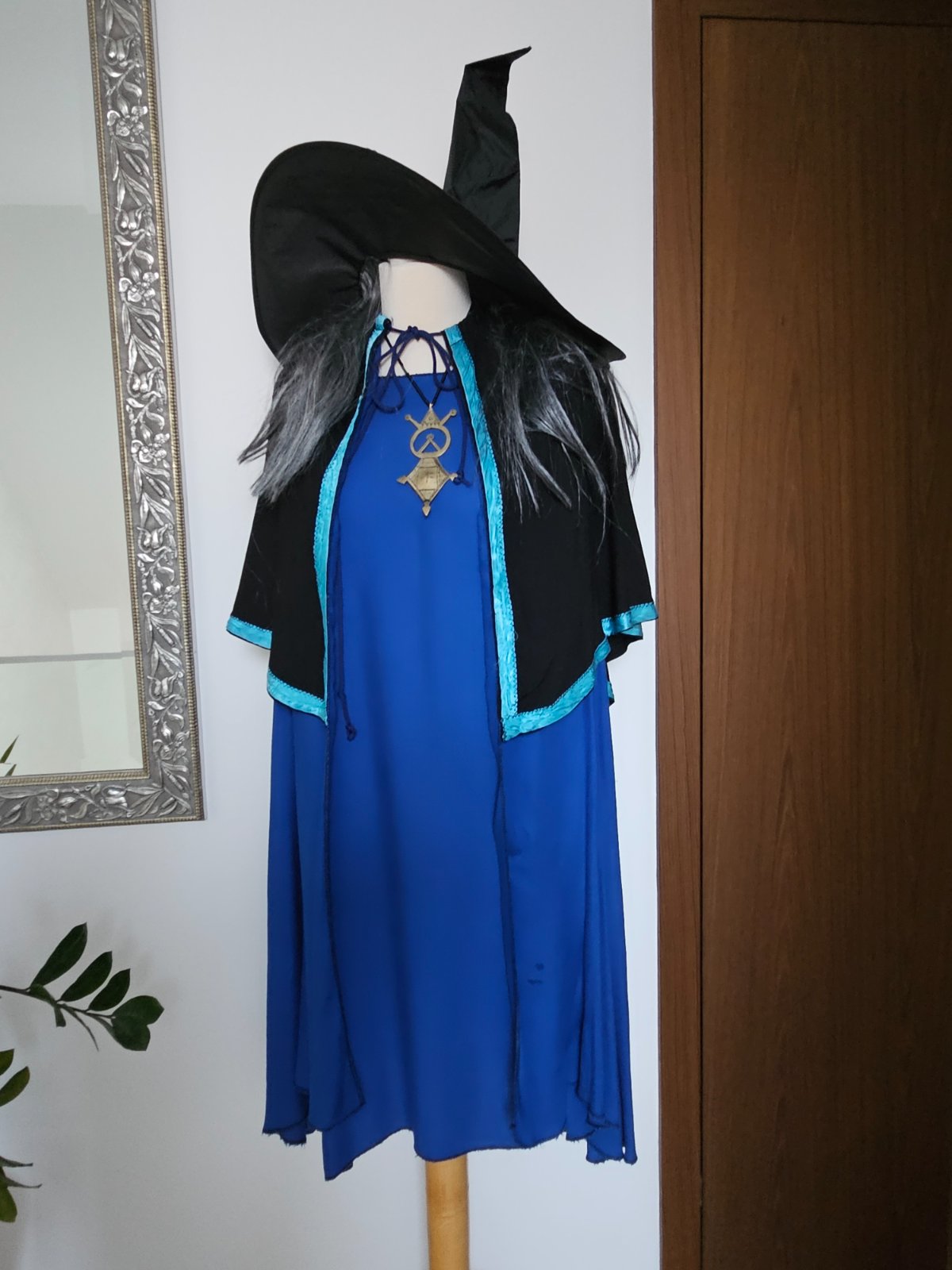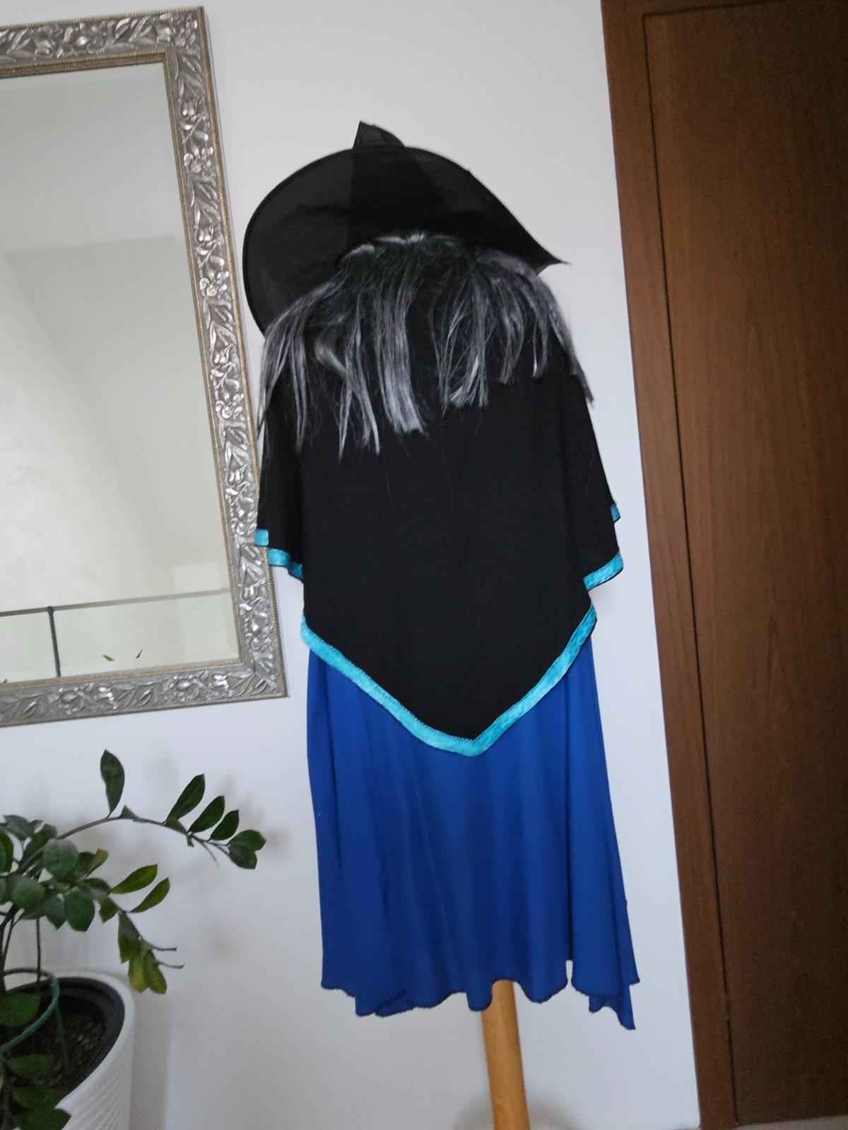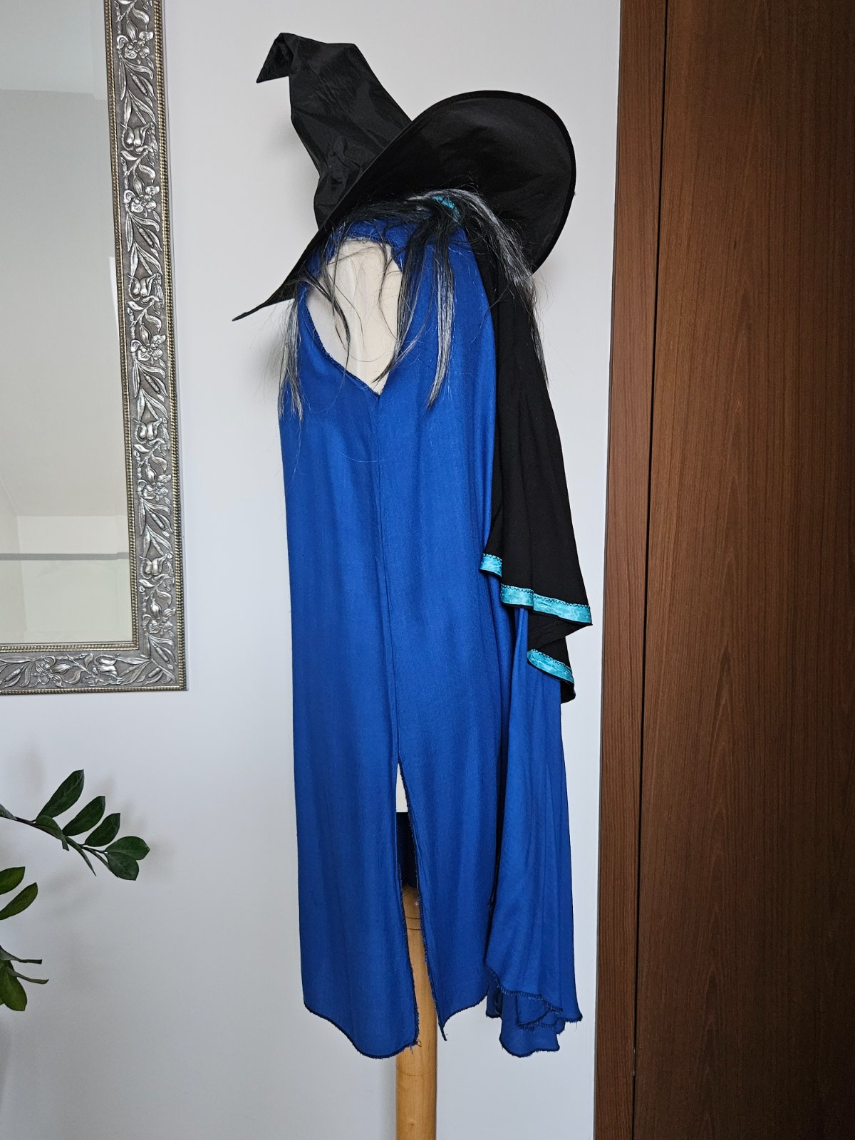 Hand-made čarodejnícky kostým na karneval pre dieťa vo veku od 6 rokov. Námet bol Harry Potter. Kostým sa skladá z modrej tuniky a a plášťa. K tomu je čarodejnícky klobúk a ornament na krk. Paličku sme asi stratili. Kostým bol nosený, má malé pretrhnutie na zadnej strane, ktoré sme prekryli záplatou, ale pokiaľ je oblečený plášť, nie je ju vidieť. Na prednej strane je fliačik. Určite ešte niekoho poteší.