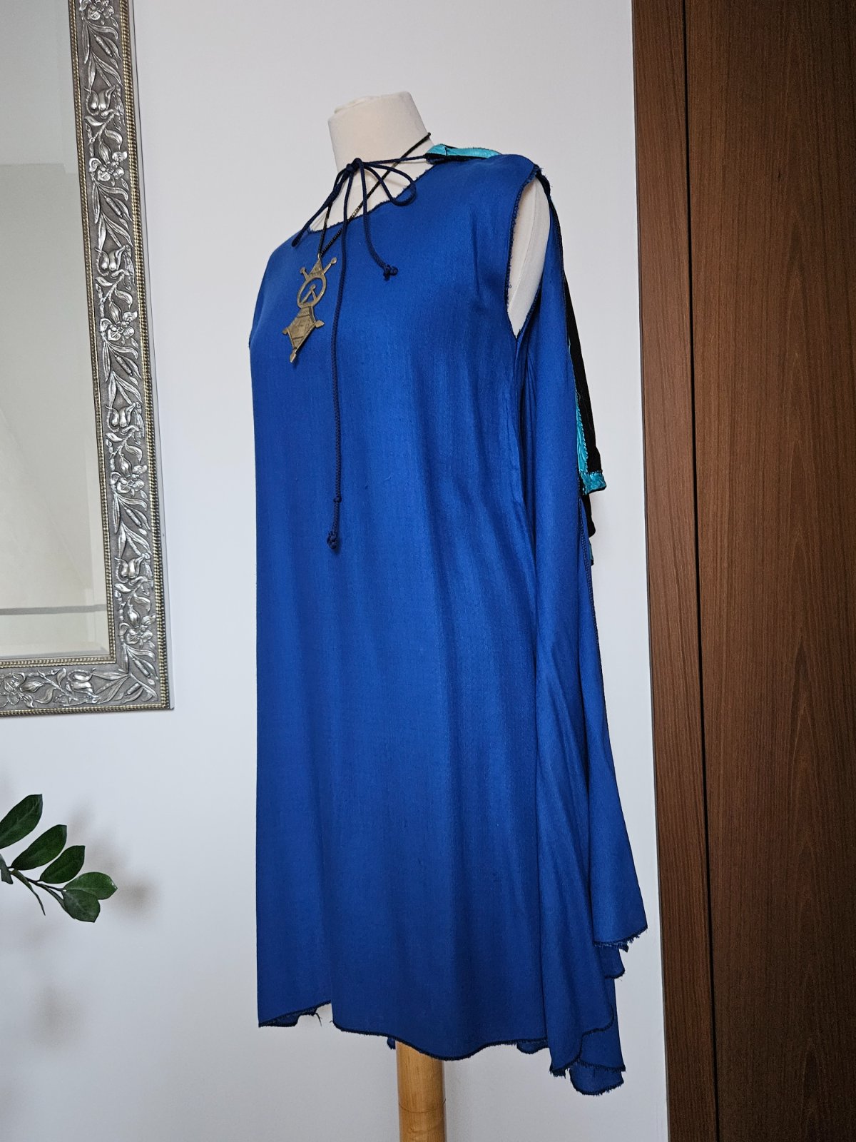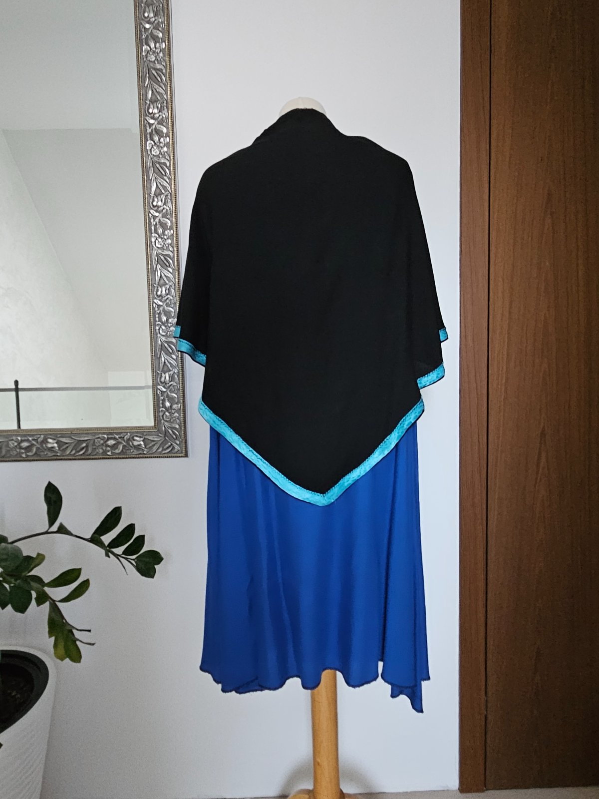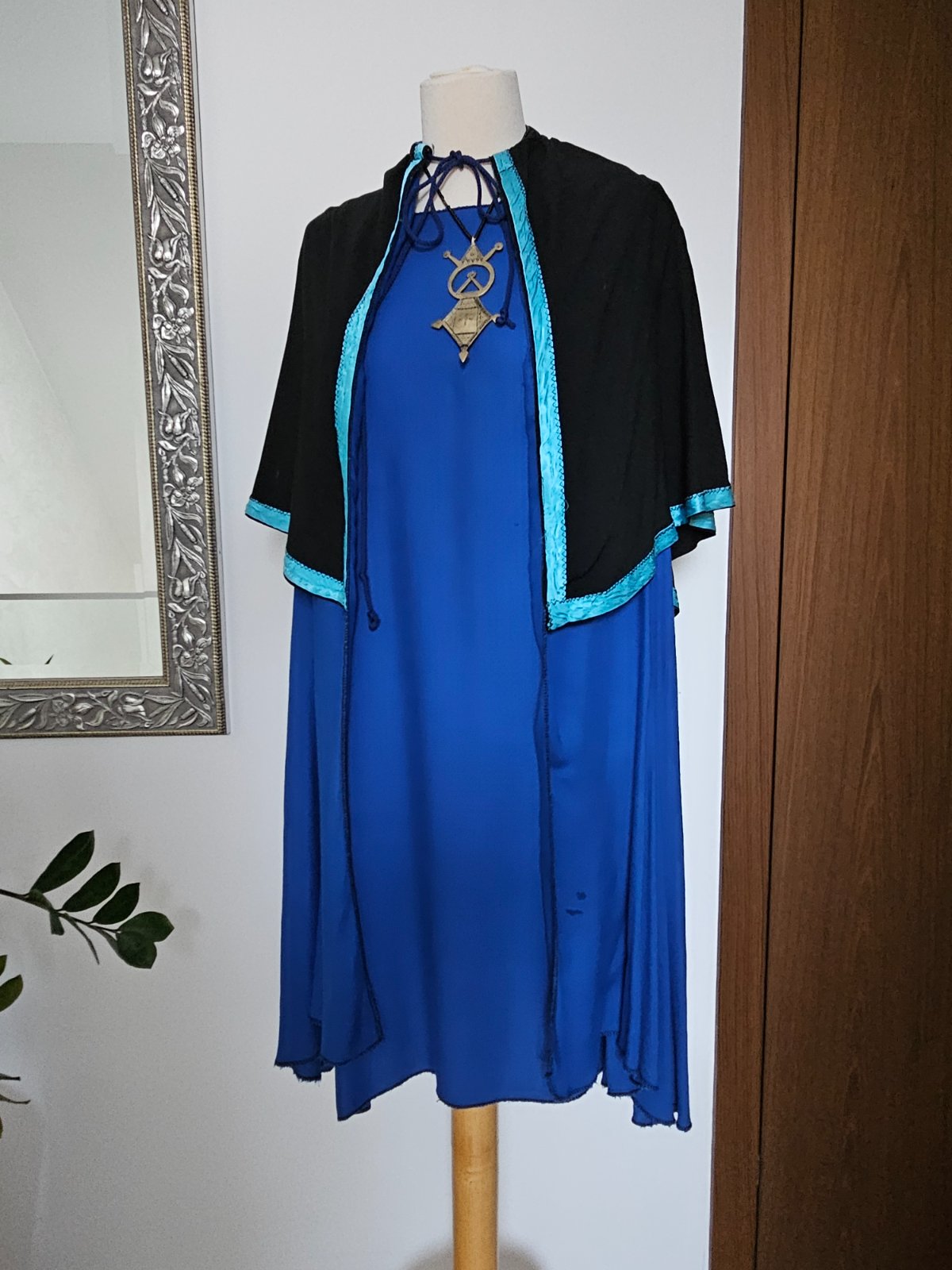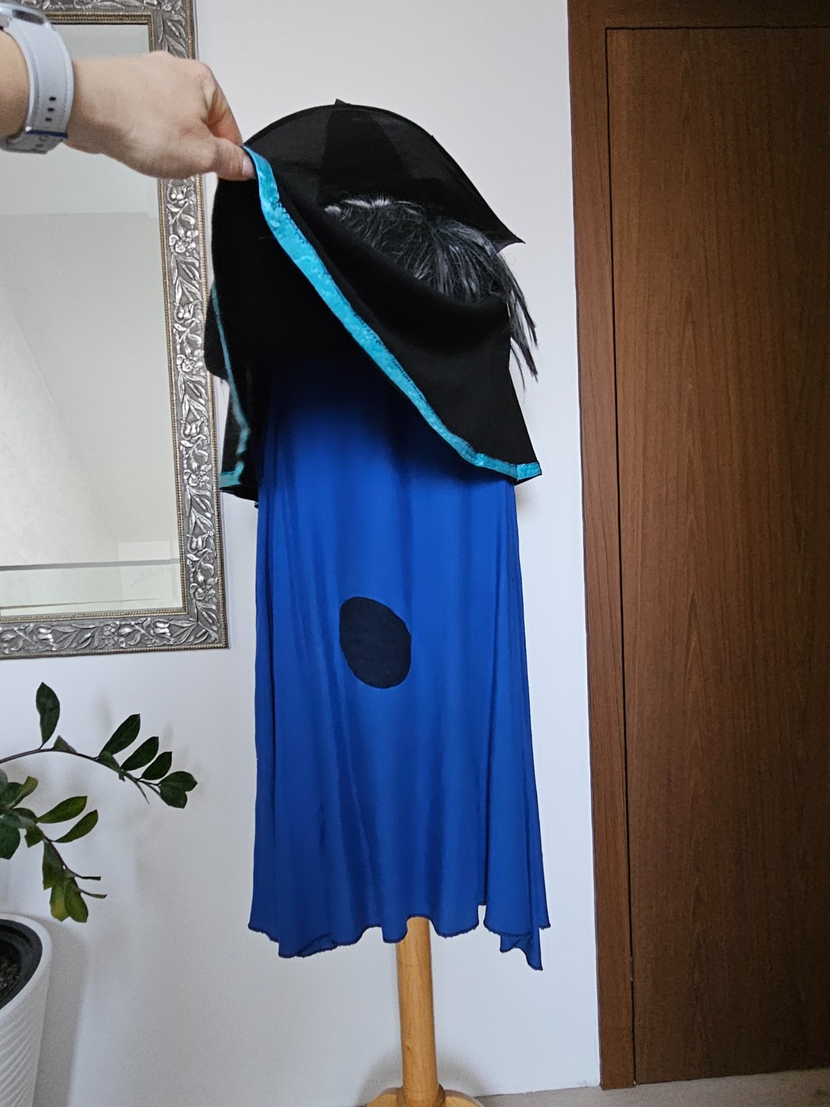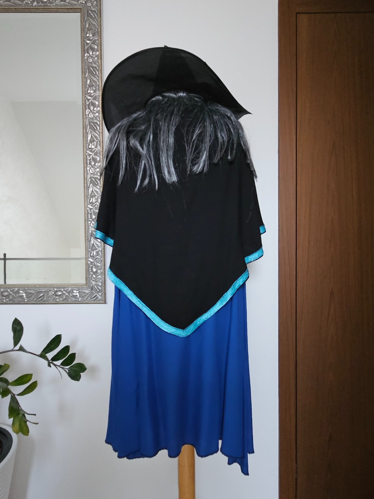 Hand-made čarodejnícky kostým na karneval pre dieťa vo veku od 6 rokov. Námet bol Harry Potter. Kostým sa skladá z modrej tuniky a a plášťa. K tomu je čarodejnícky klobúk a ornament na krk. Paličku sme asi stratili. Kostým bol nosený, má malé pretrhnutie na zadnej strane, ktoré sme prekryli záplatou, ale pokiaľ je oblečený plášť, nie je ju vidieť. Na prednej strane je fliačik. Určite ešte niekoho poteší.