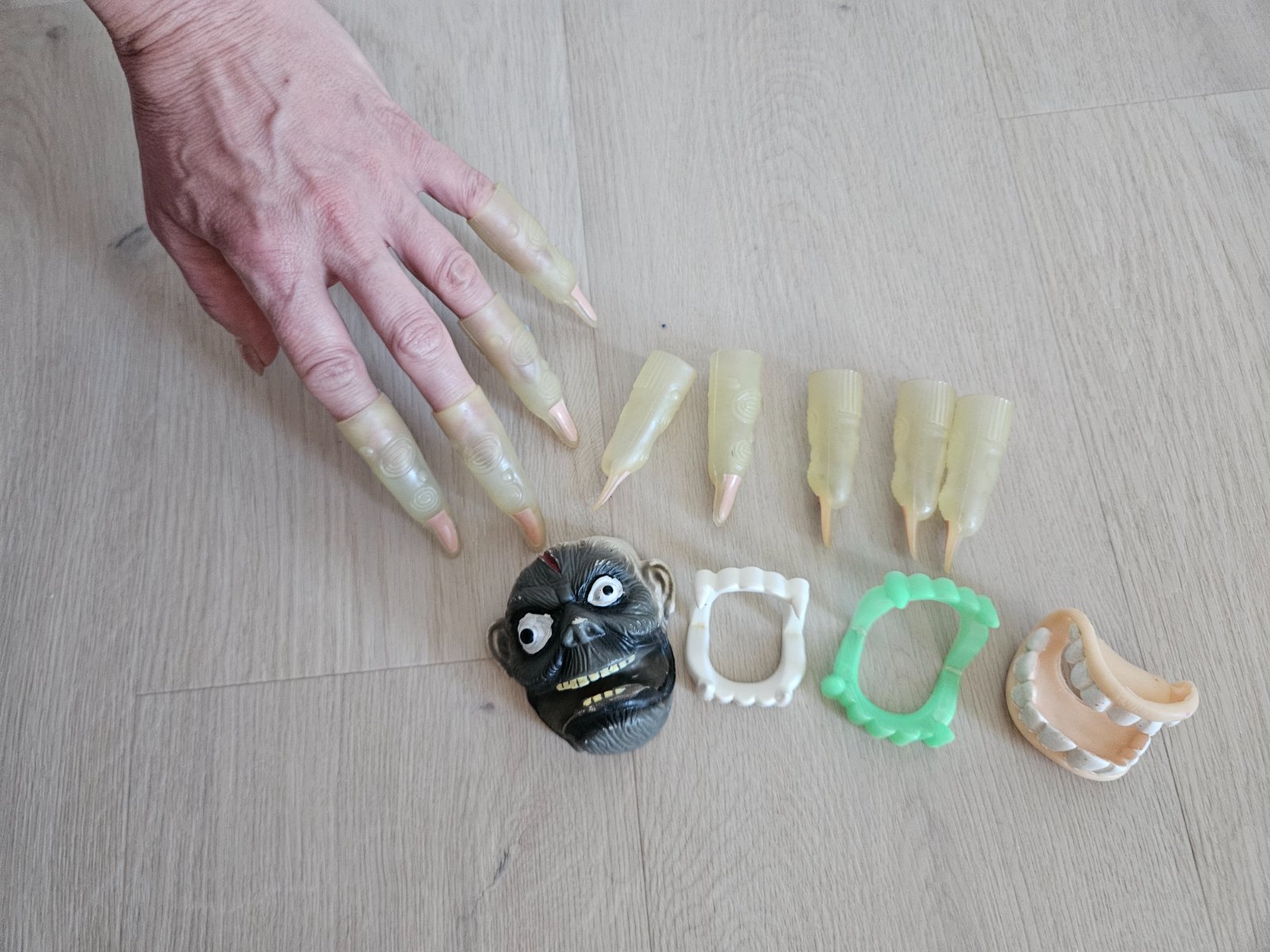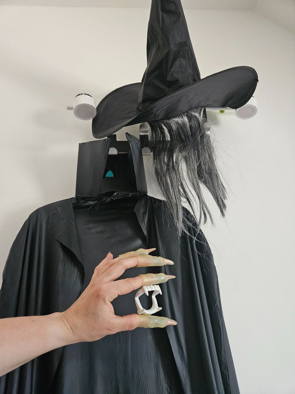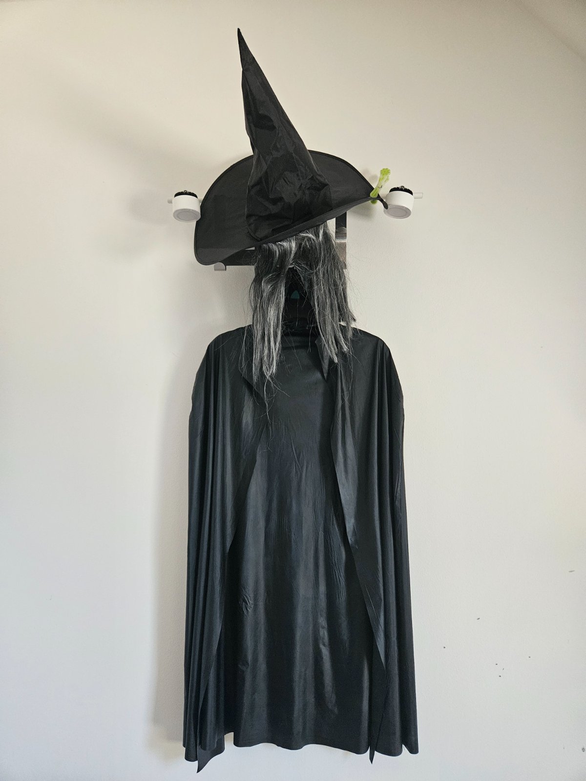 K dispozícii máme ešte jeden čarodejnícky klobúk s pogumovaným čiernym plášťom s pazúrmi a zubami (10€)