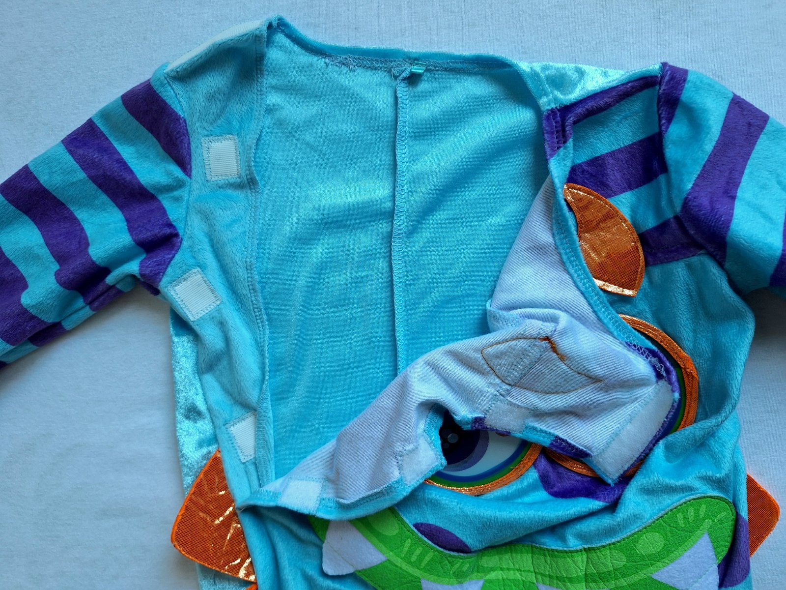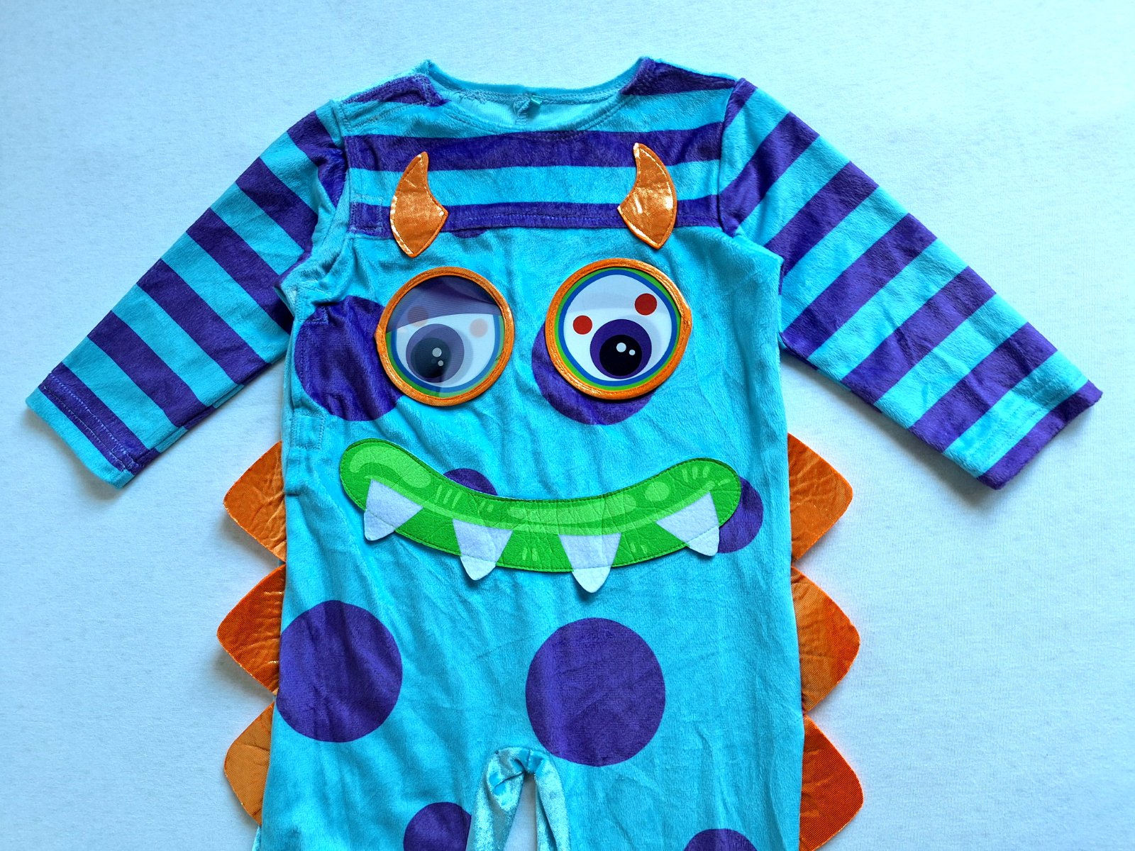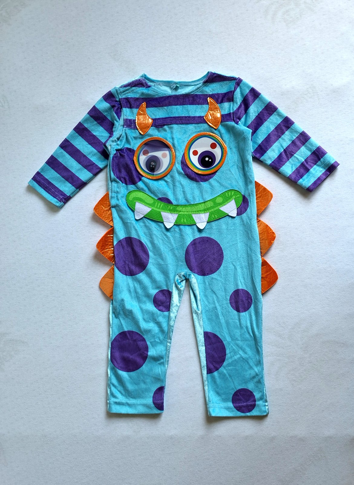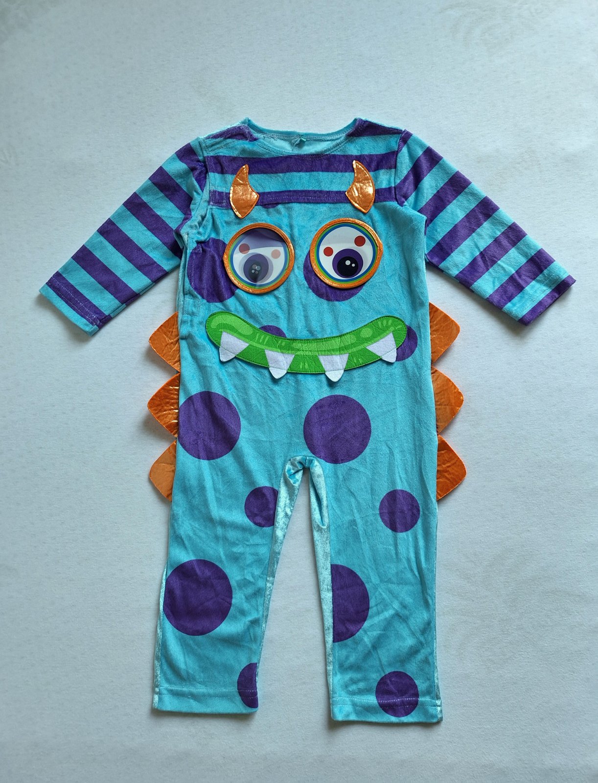 Top stav, bez poškodení a známok nosenia. Parádny monster overal na halloween, zamatový, príjemný na telo, hebký. Vpredu pekná aplikácia meniacich sa očí.