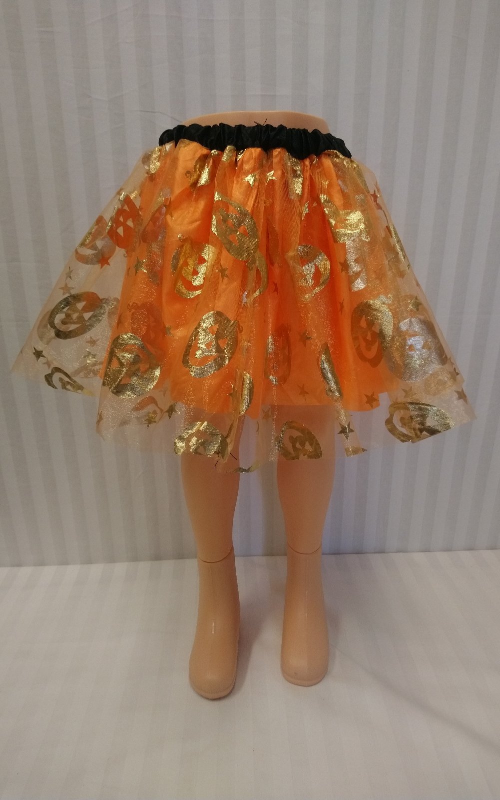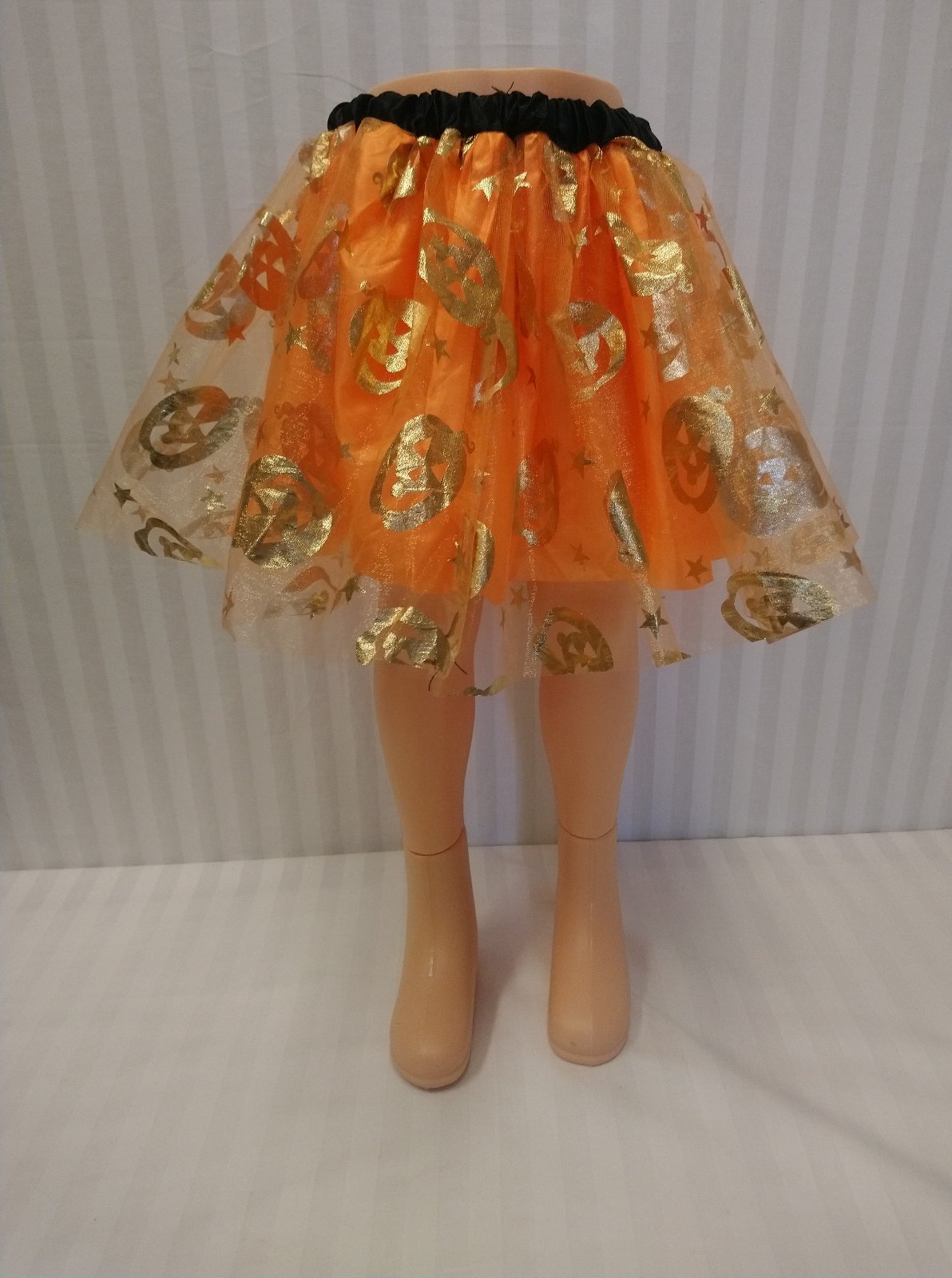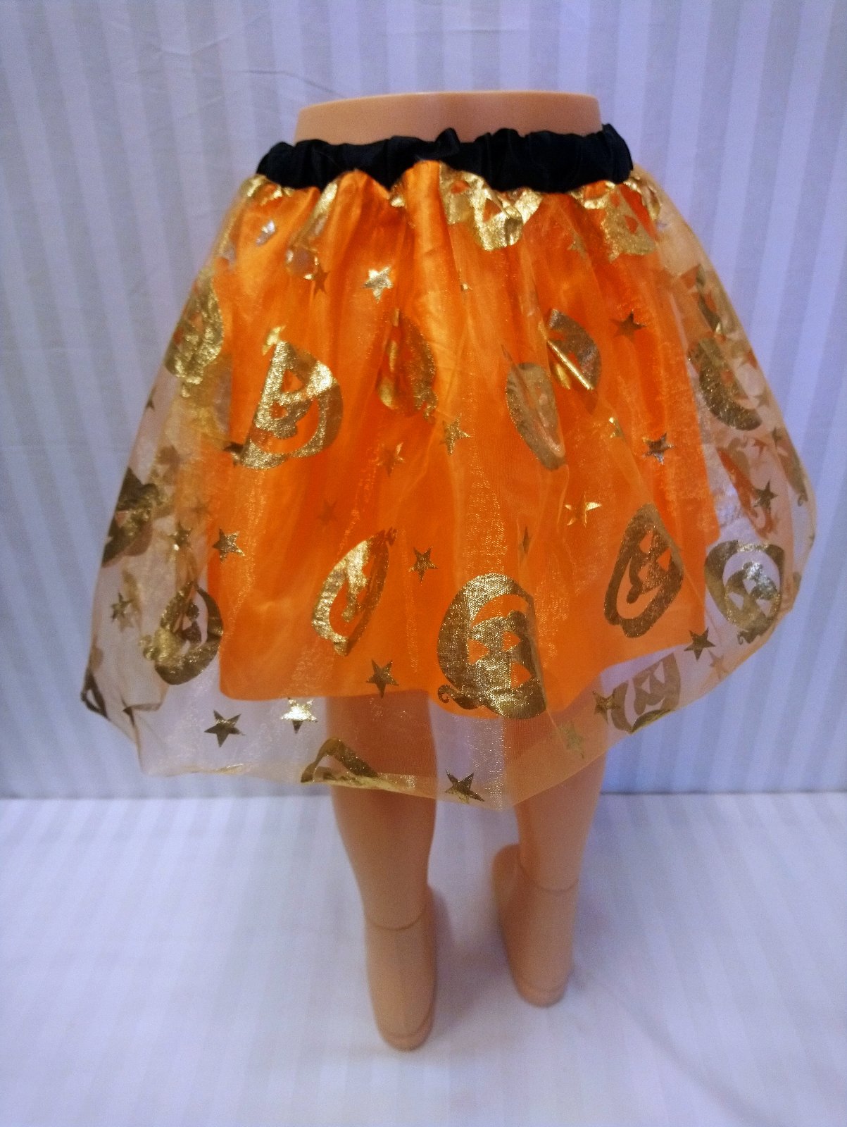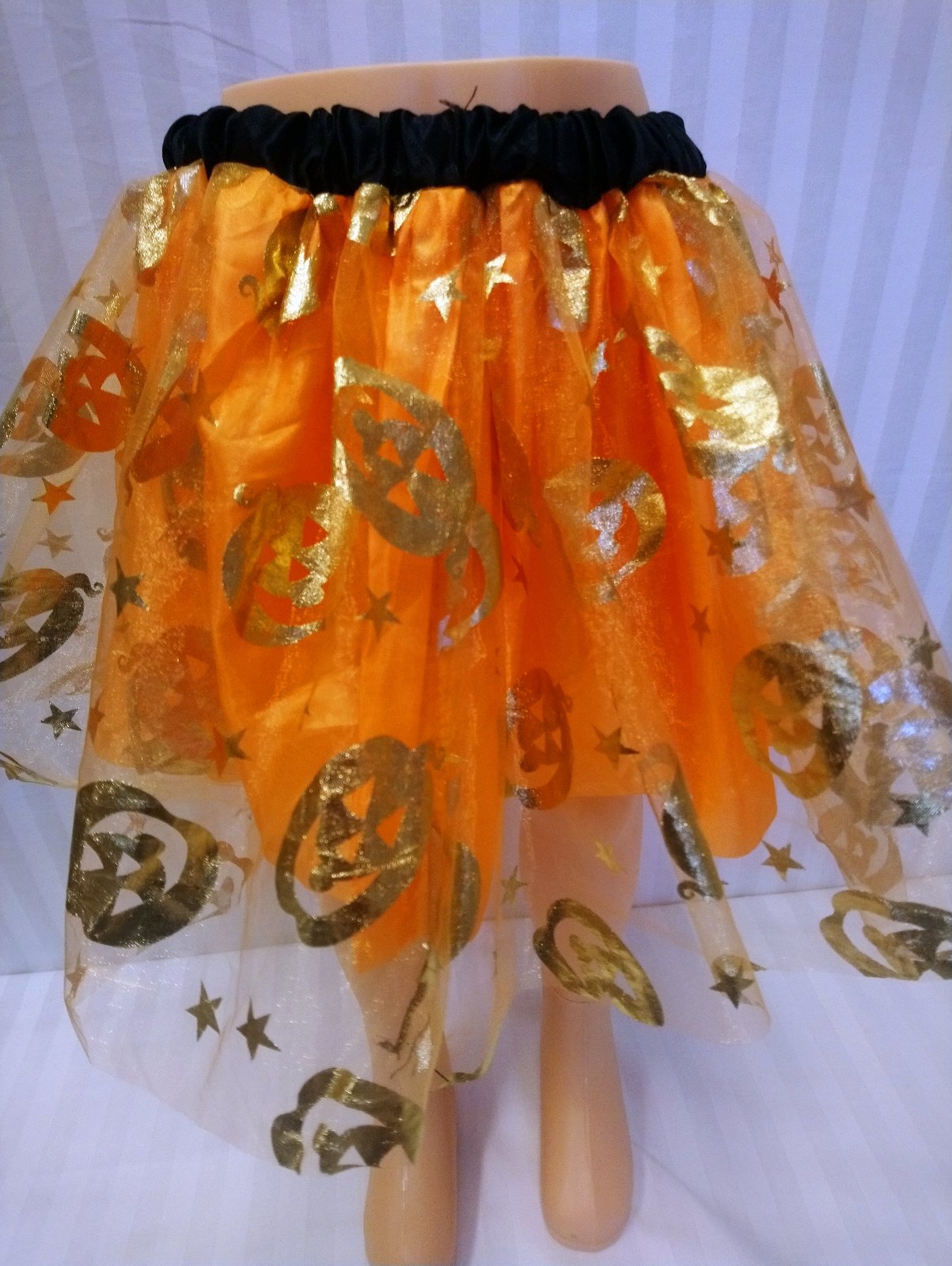kostým Karnevalová Sukňa oranžovo zlatá tekvica je v páse na gumu, pás je čierny, suknička má dve vrstvy, spodná je oranžová, vrchná je tylová so zlatým motívom tekvice.