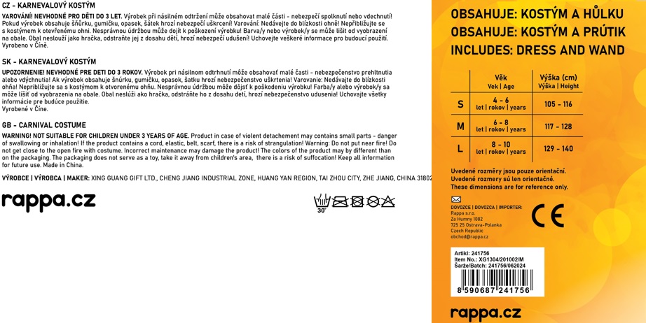 Kostým modrej farby vo veľkosti M je určený pre dievčatká vo vekovom rozmedzí 6-8 let (117-128 cm). Vo velkosti S je určený pre dievčatká vo vekovom rozmedzí 4-6 rokov (105-116 cm).