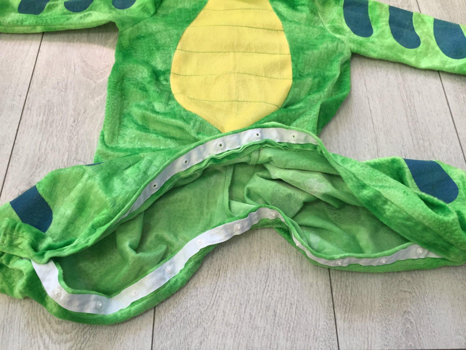 Kostym triceratops vo vybornom stave.V rozkroku sa da rozopinat. Velkosť cca 92. Dlžka 72cm, širka cez pazuchy 34cm, rukav 30cm, rozkrok 33cm. Pomožky protišmykove dlžka 14cm.