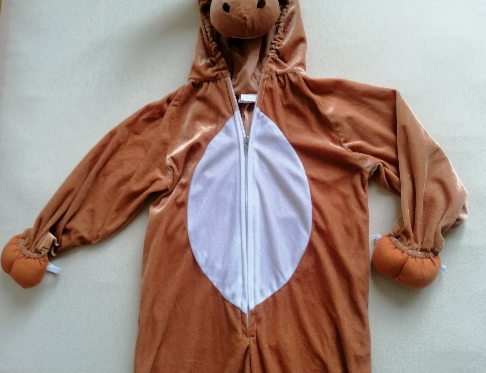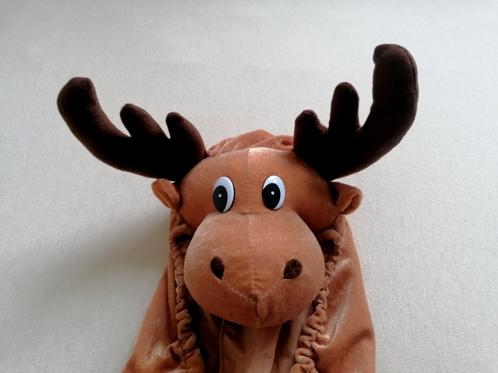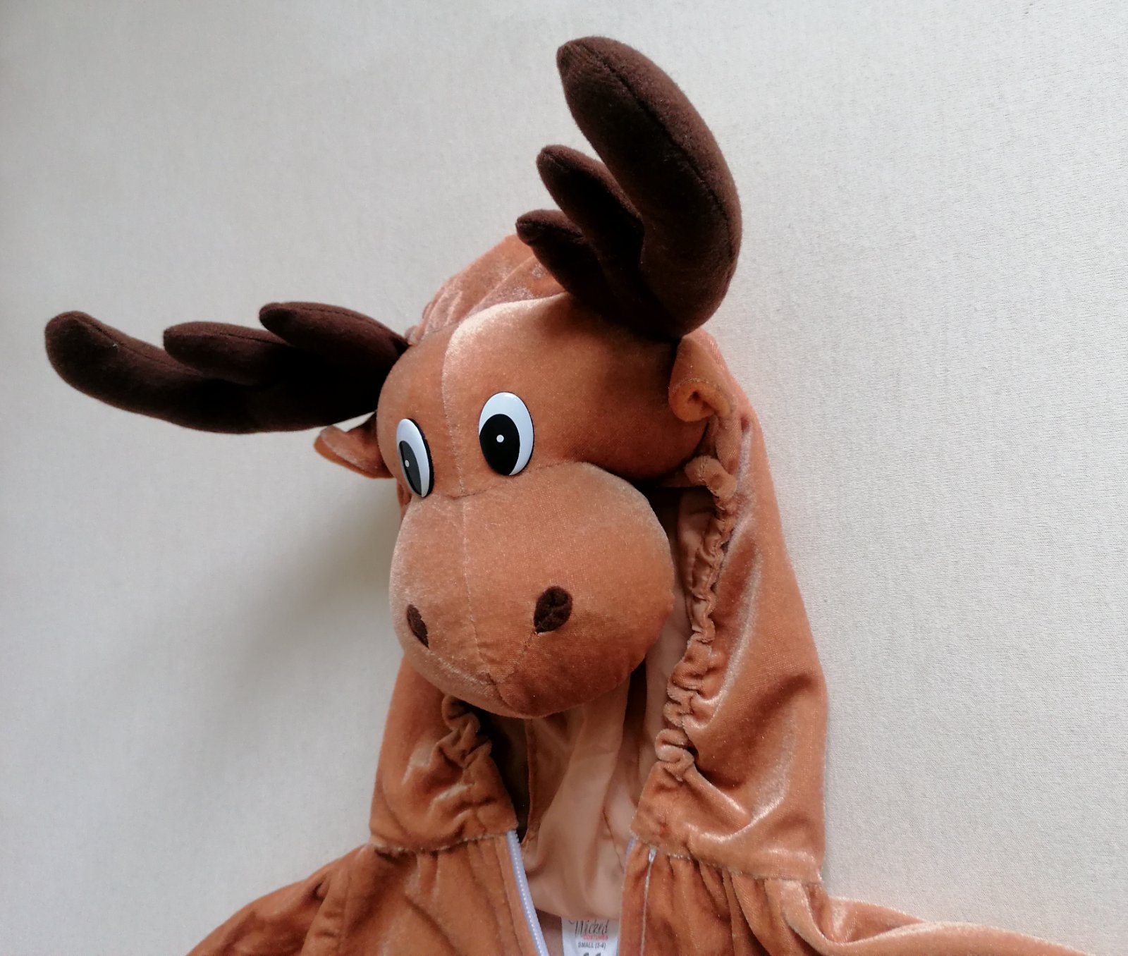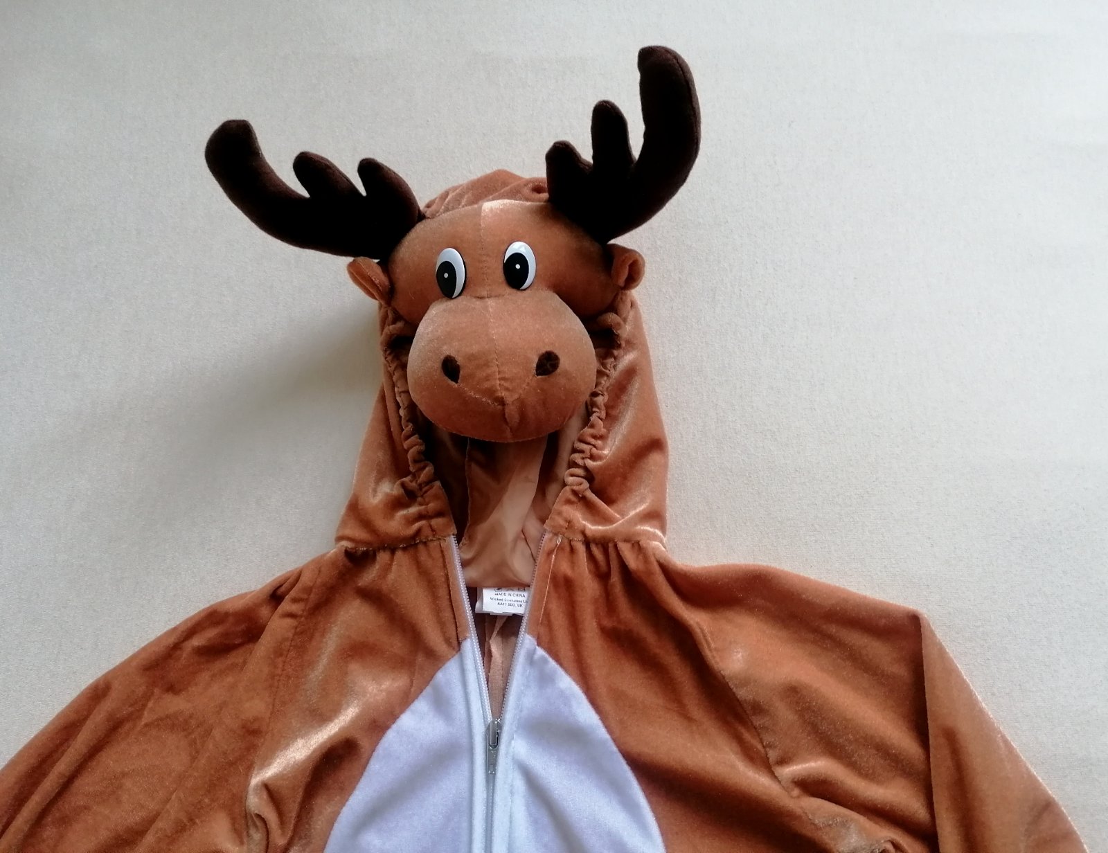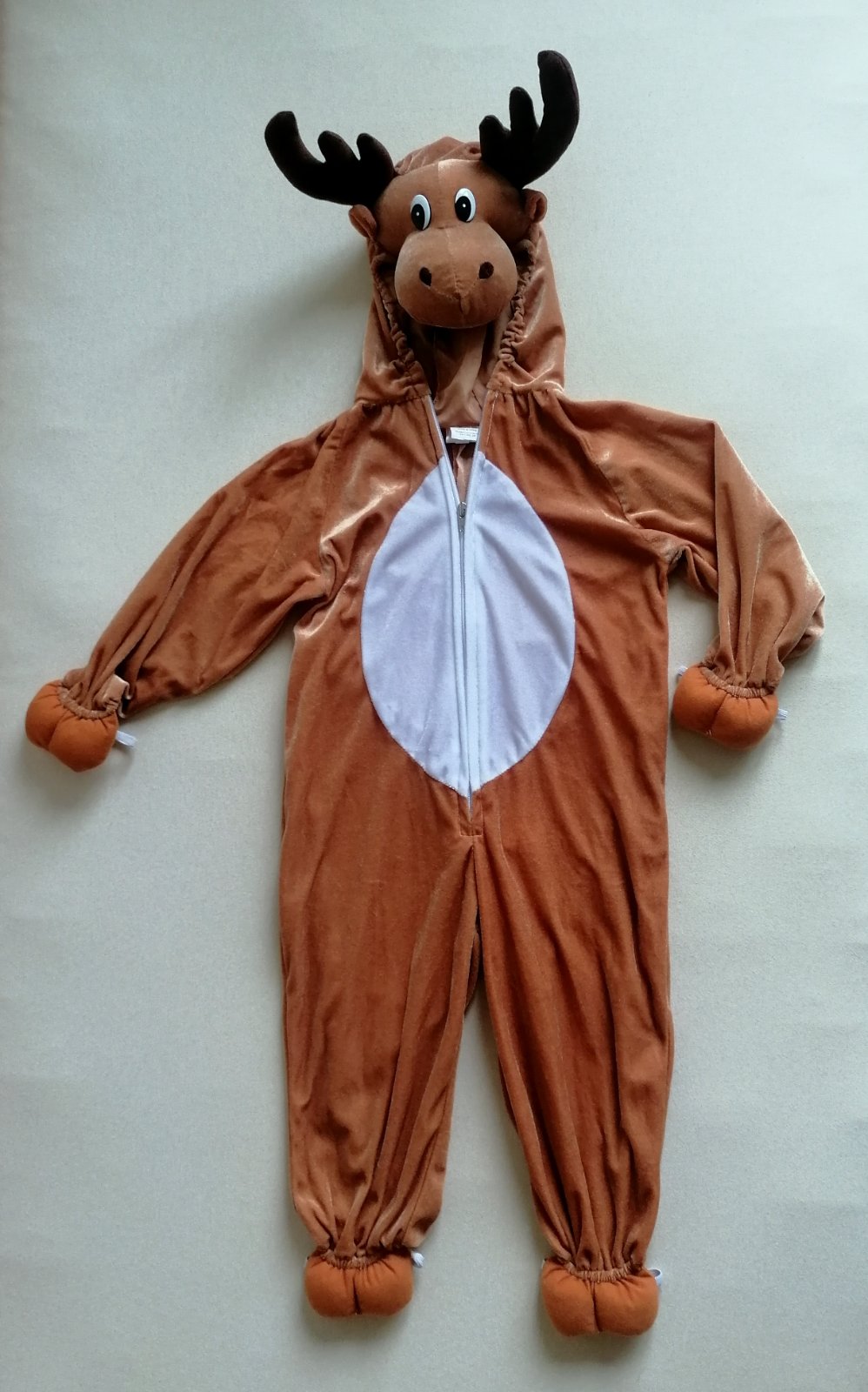 Exkluzívny do detailov prepracovaný kostým-overal soba s parádne vystuženou hlavou na kapucni, na rukách a nohách kopýtka, vzadu chvostík. Parohy pekne držia tvar. Na rukách a nohách má gumičky, ktoré držia kopýtka. Vhodný na Vianoce aj na karneval