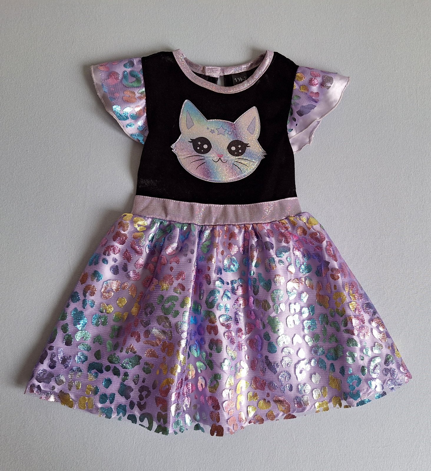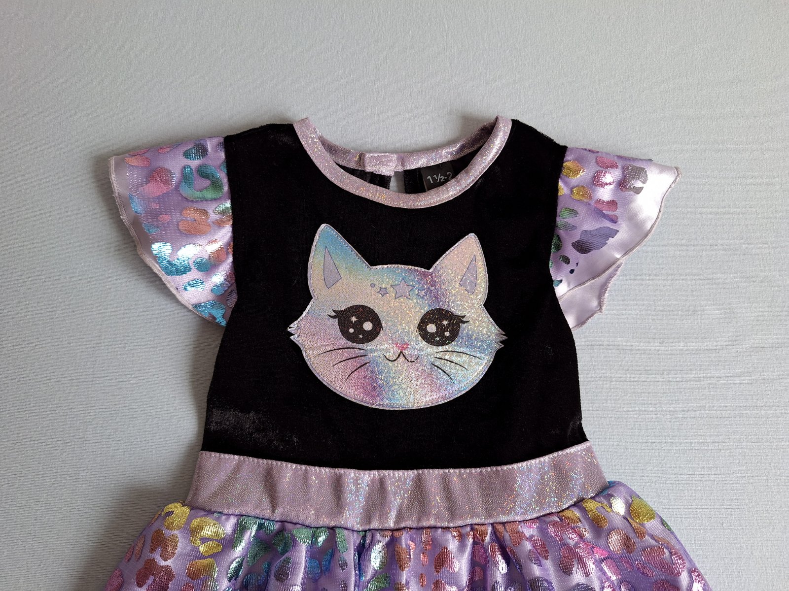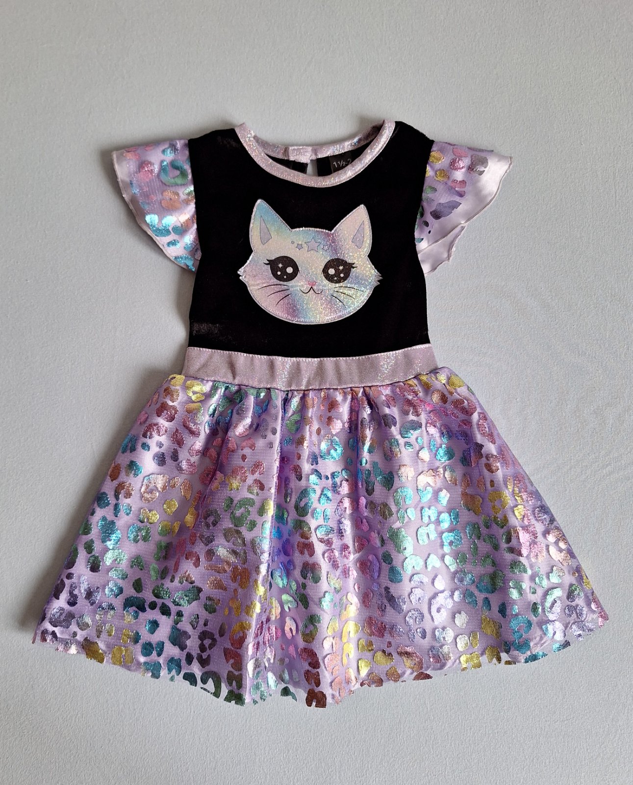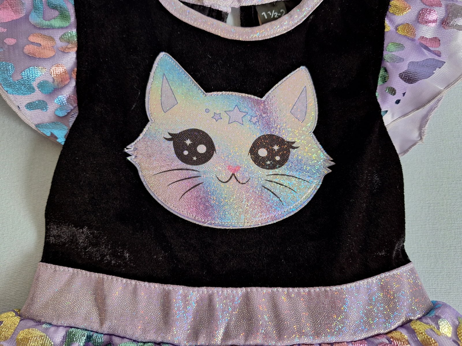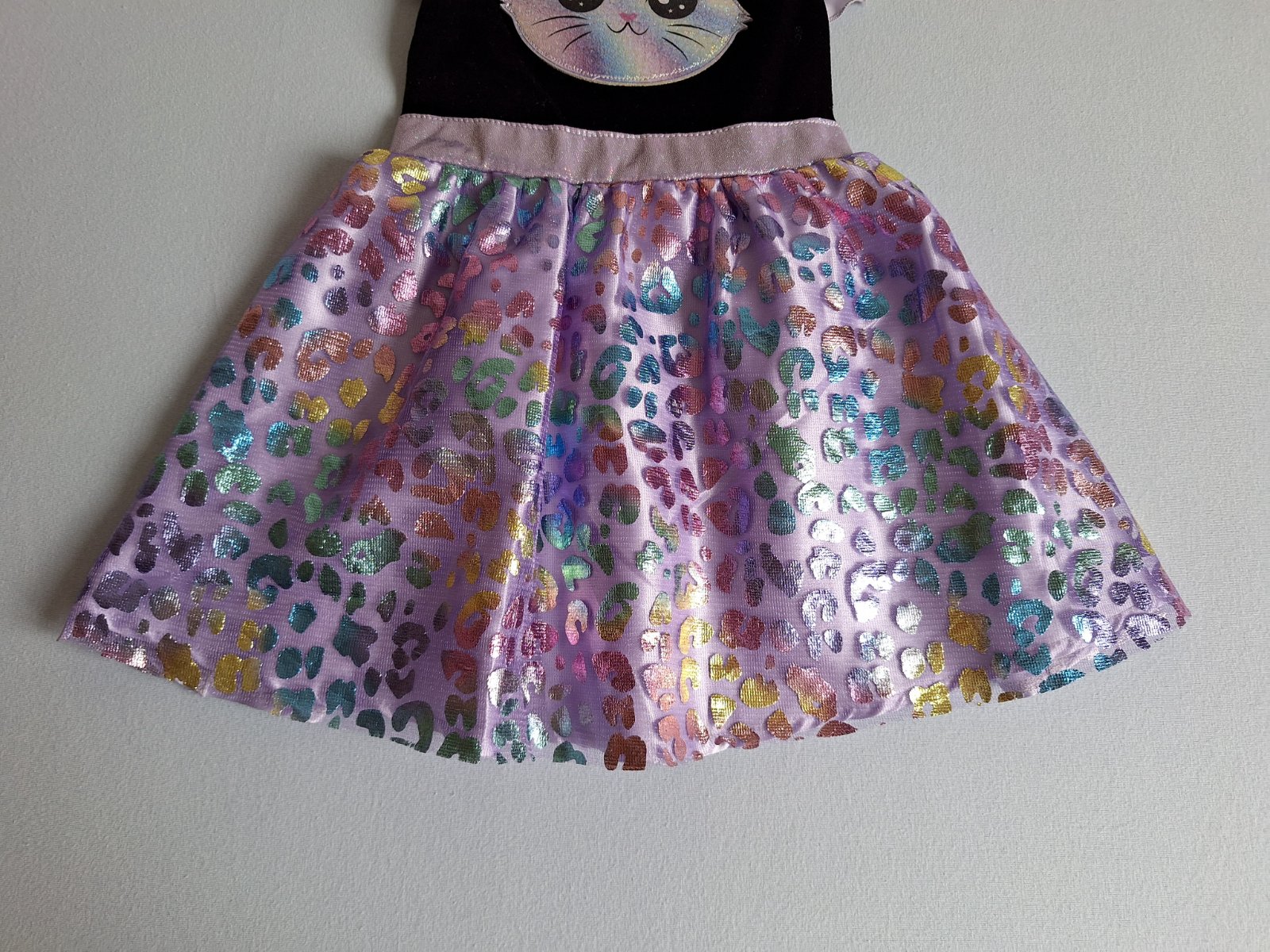 Stav: Top stav bez poškodení a známok nosenia, vhodné aj ako darček. Zamatový živôtik, pekne elastický a lesklý, v páse guma. Výrazná dúhová a trblietavá aplikácia mačičky na hrudi.