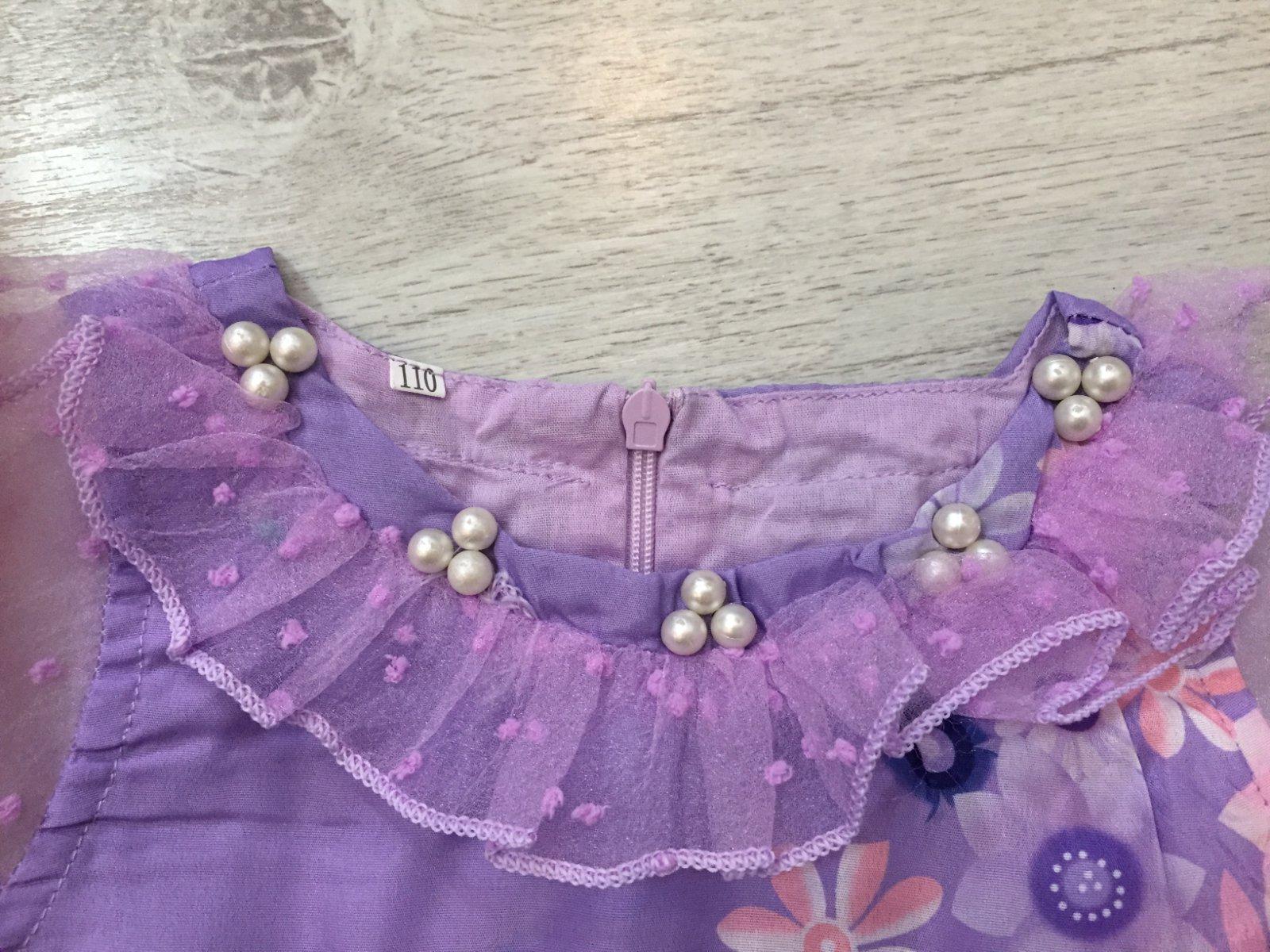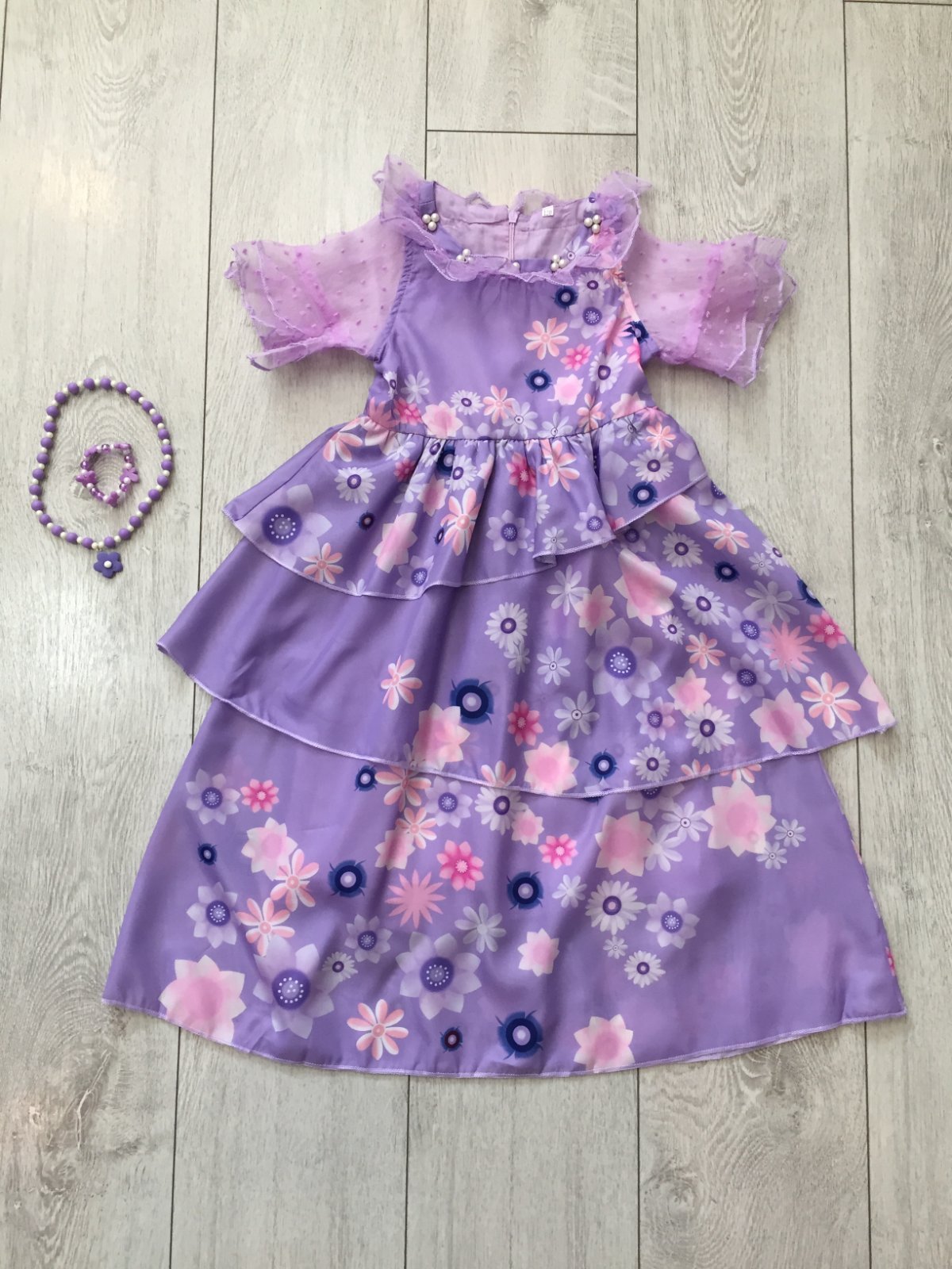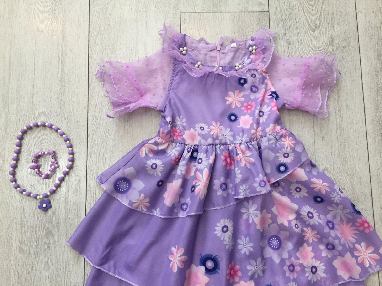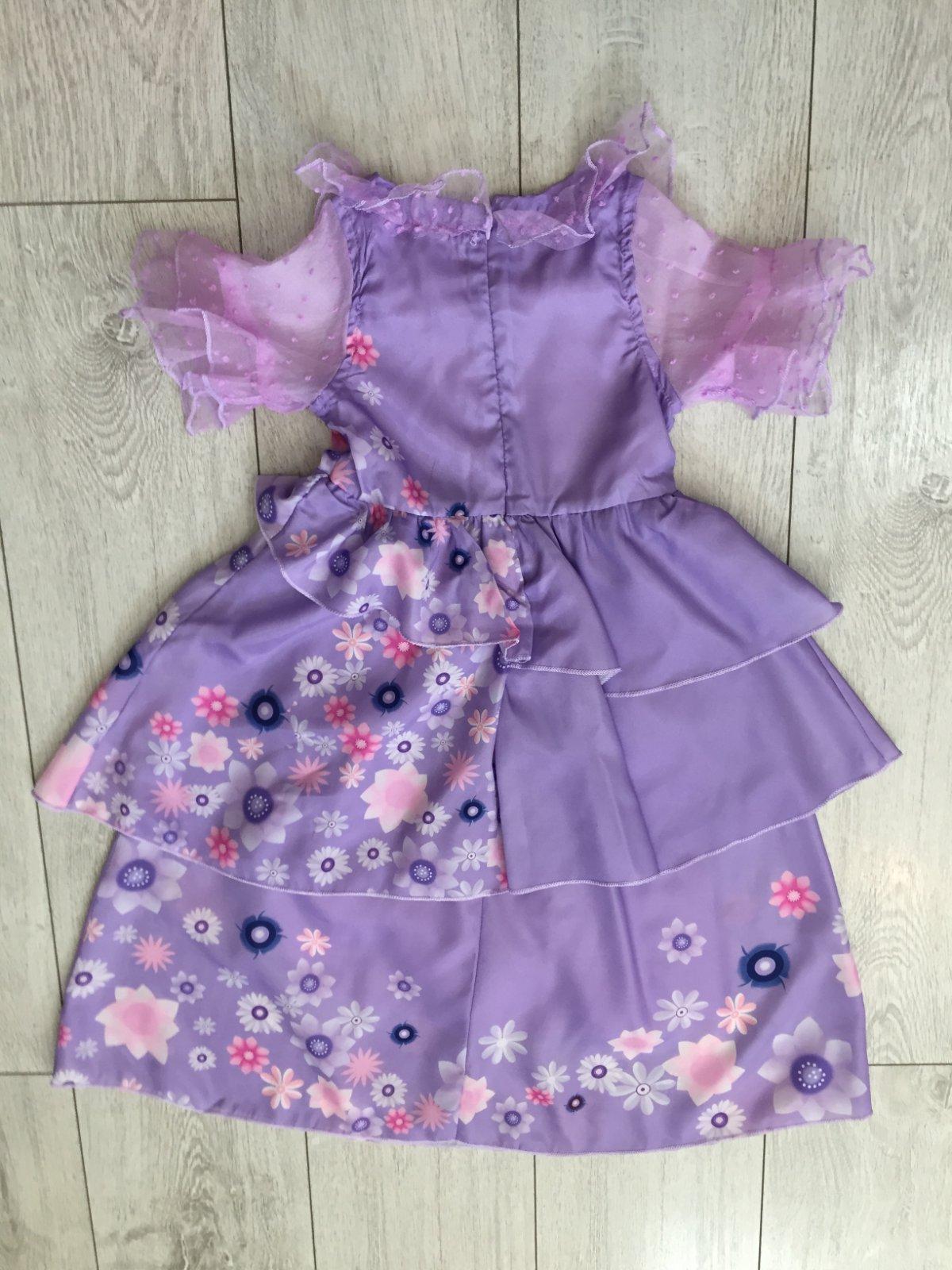Kostým Isabele z rozprávky Encanto v super stave. Velkosť 110. Dlžka 73cm, širka cez pazuchy 27cm, širka v pase 25cm. Plus naramok a nahrdelnik.