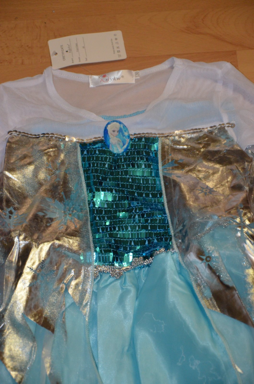 Trblietkavý ligotavý vrchny diel na chrbatiku elasticky, prisposobi sa postave. Rukav biely elasticka latka dole s peknym ukoncenim. V pase strieborne vlocky. Vzadu ozdobene strieborny plášť vlečka s vlockami. Hore na hrudi sa da pripnut odznacik, ktory je sucastou siat.