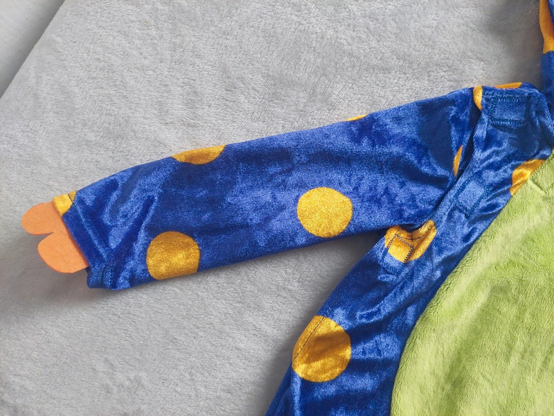 Stav: top stav, bez poškodení a známok nosenia. Parádny, ľahunký plyšový overal malého strašidielka. Zapínanie vpredu na suché zipsy, kapucňa detailne prepracovaná - na kapucni očká a ušká, rukávy ukončené imitáciou pazúrikov.
