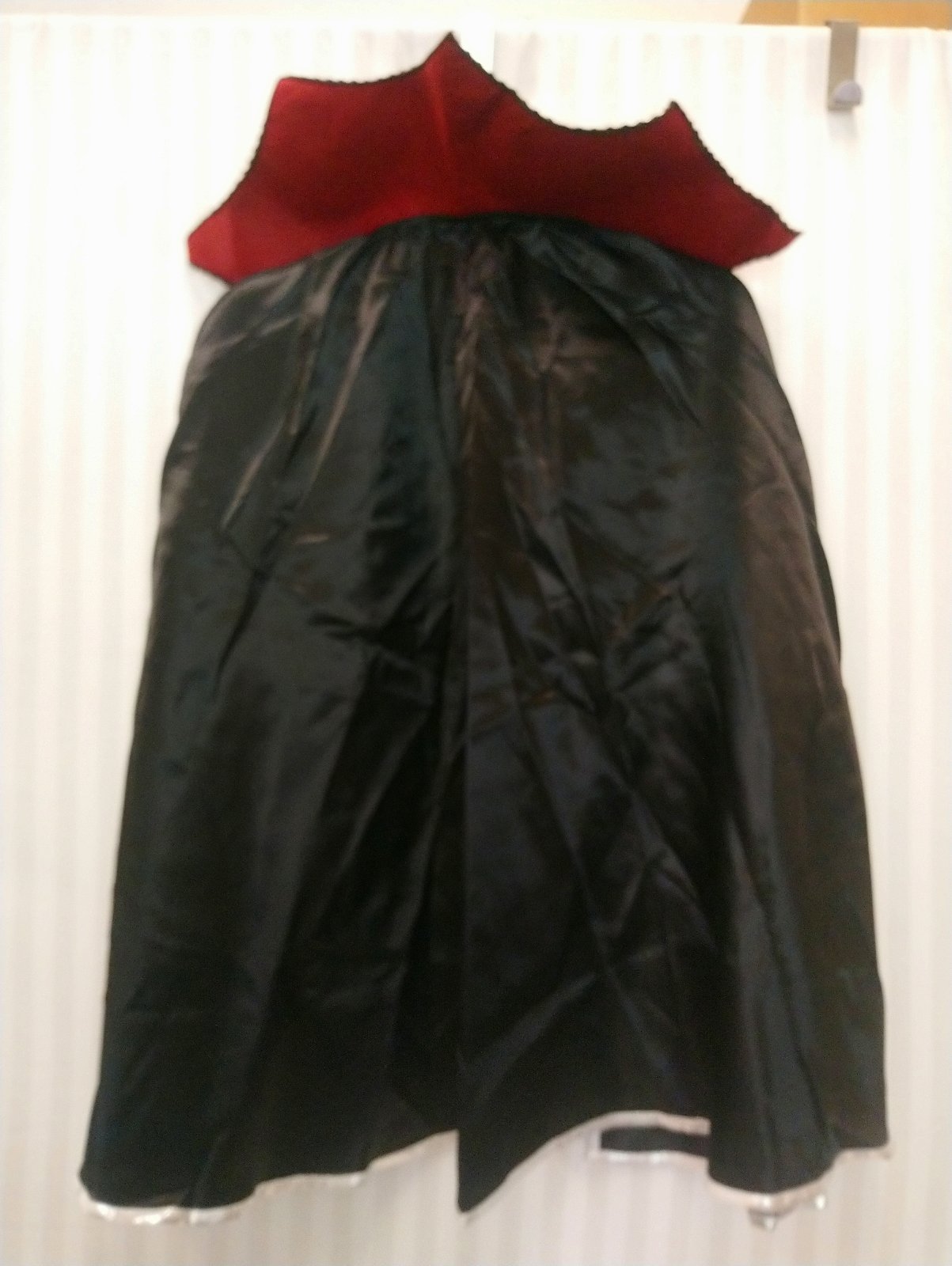 2. luxusný upírsky čierny plášť s lesklým lemovaním a červeno čiernym golierom so zapínaním na suchý zips s motýlikom,