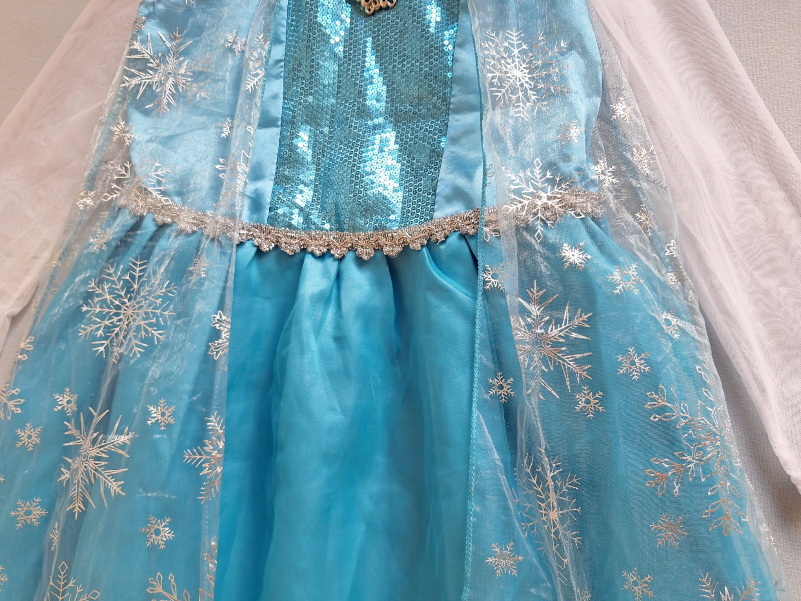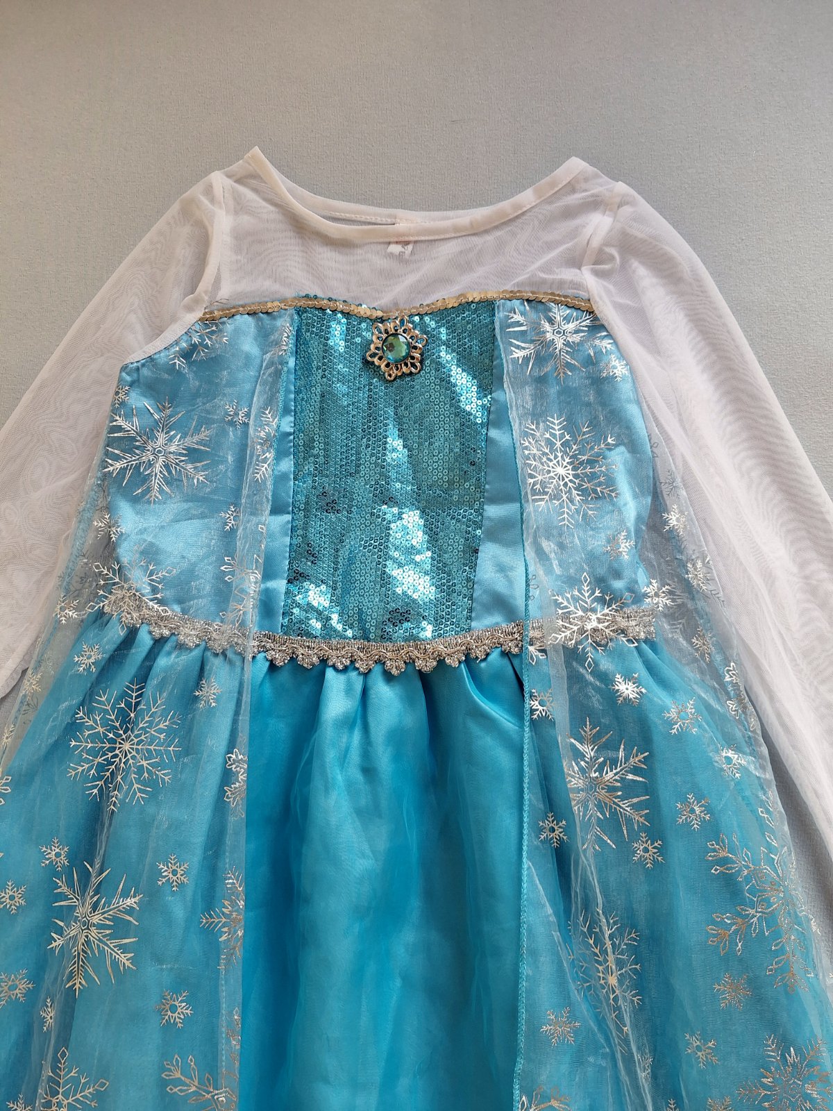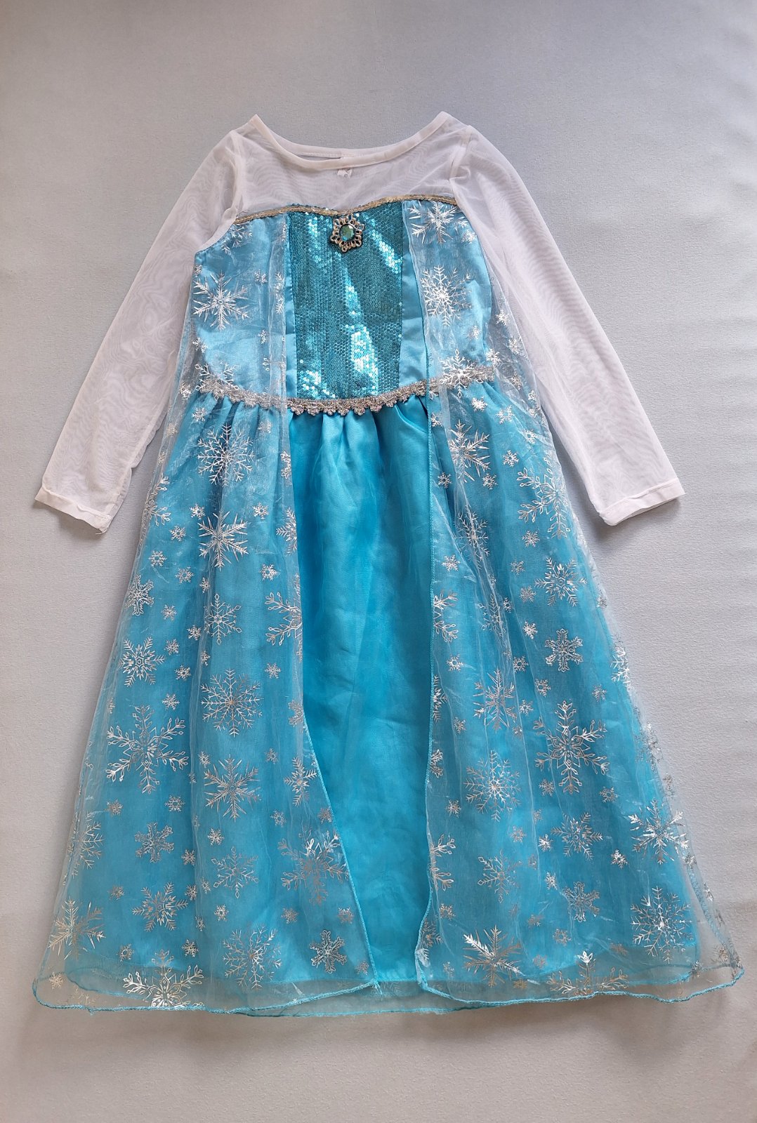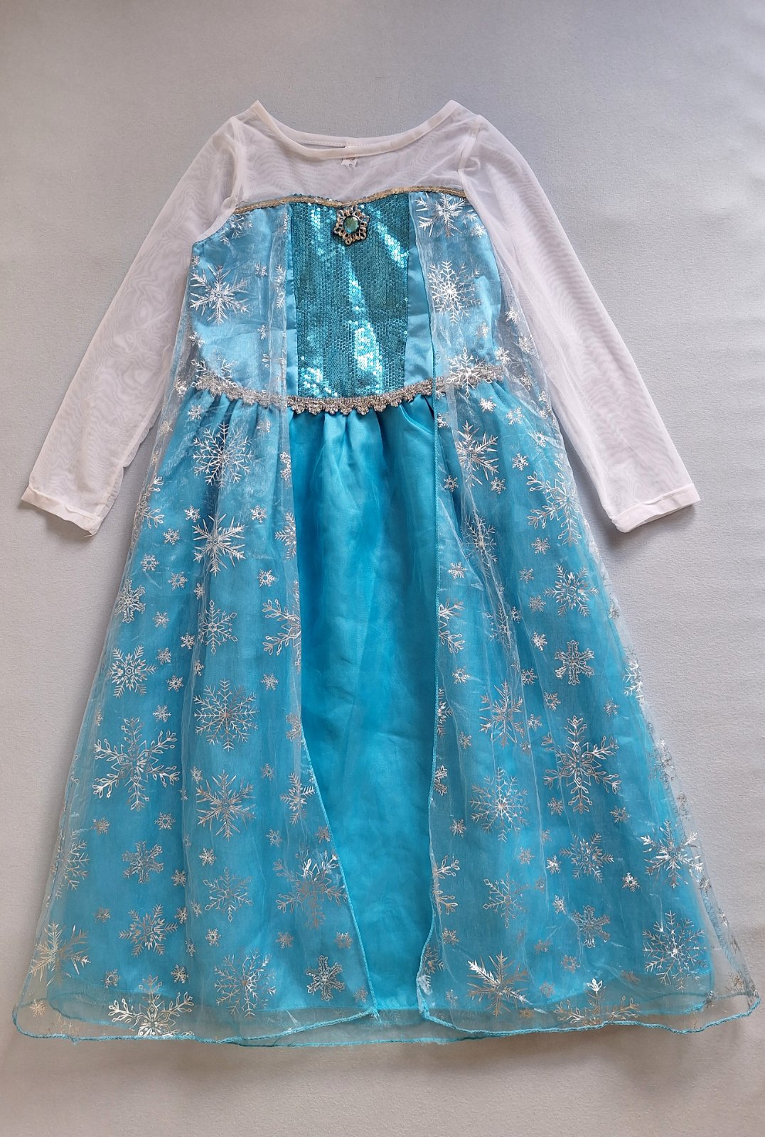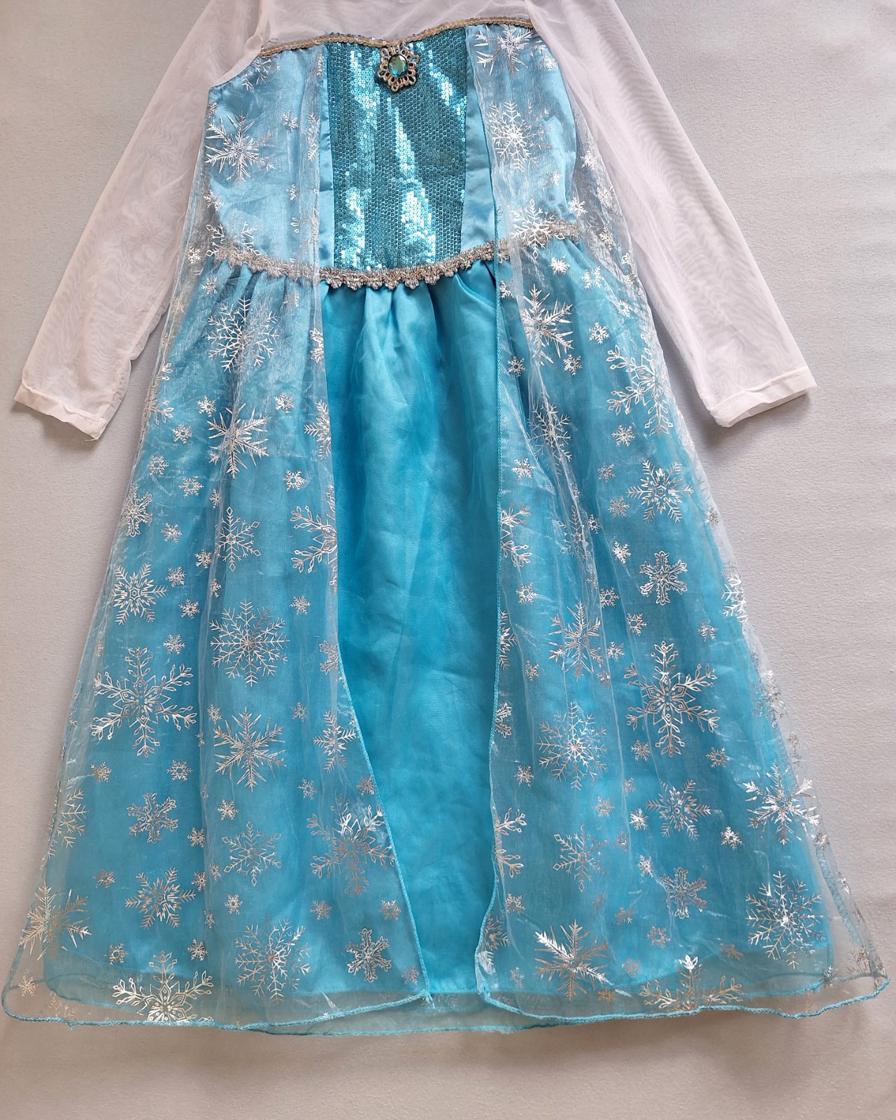 Stav: top stav, bez poškodení. Krásny kostým s dlhou vlečkou zdobenou striebornými vločkami. Rukávy z jemnej organzy - elastické, pod krkom brošňa, v páse guma. Sukňa bohato riasená viac vrstvová. Živôtik zdobený flitrami.
