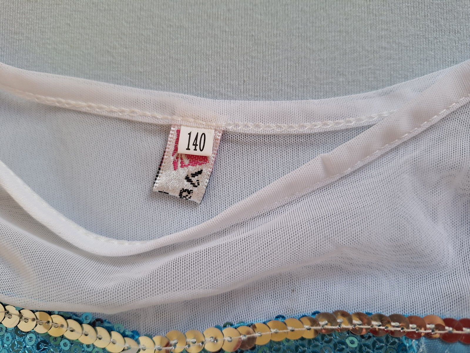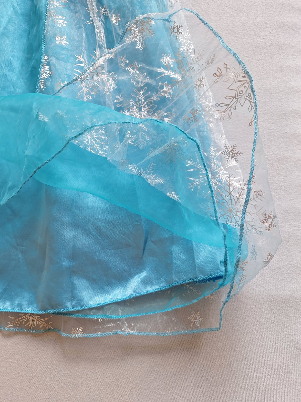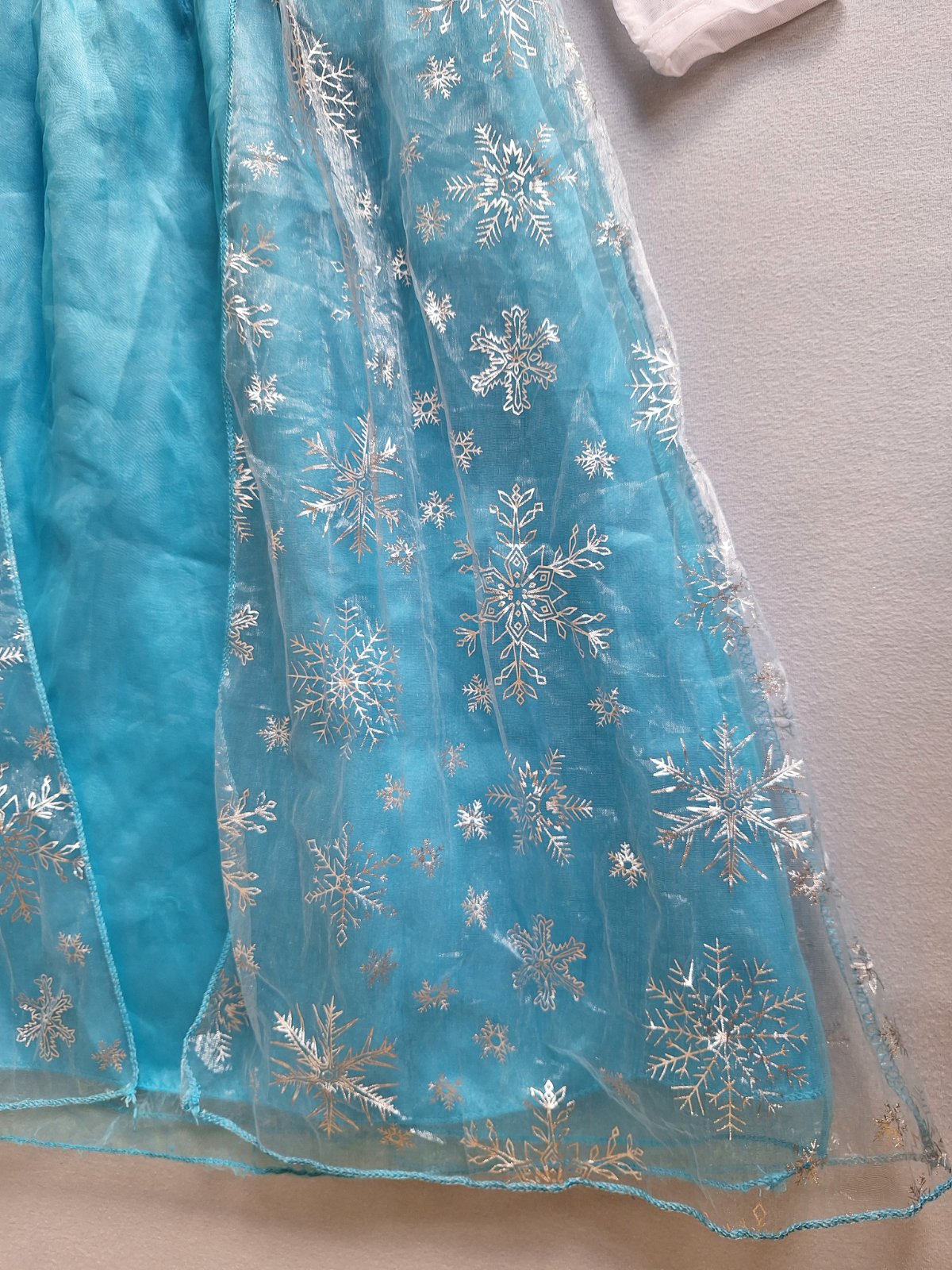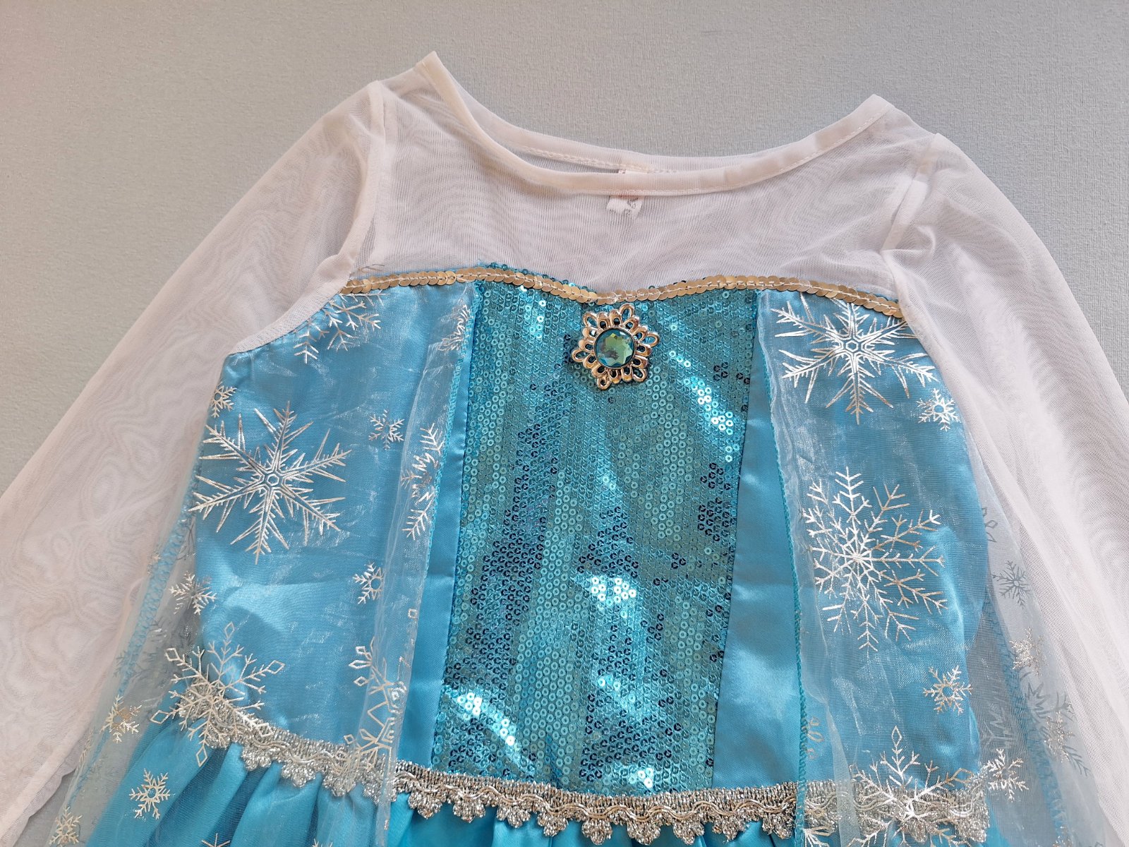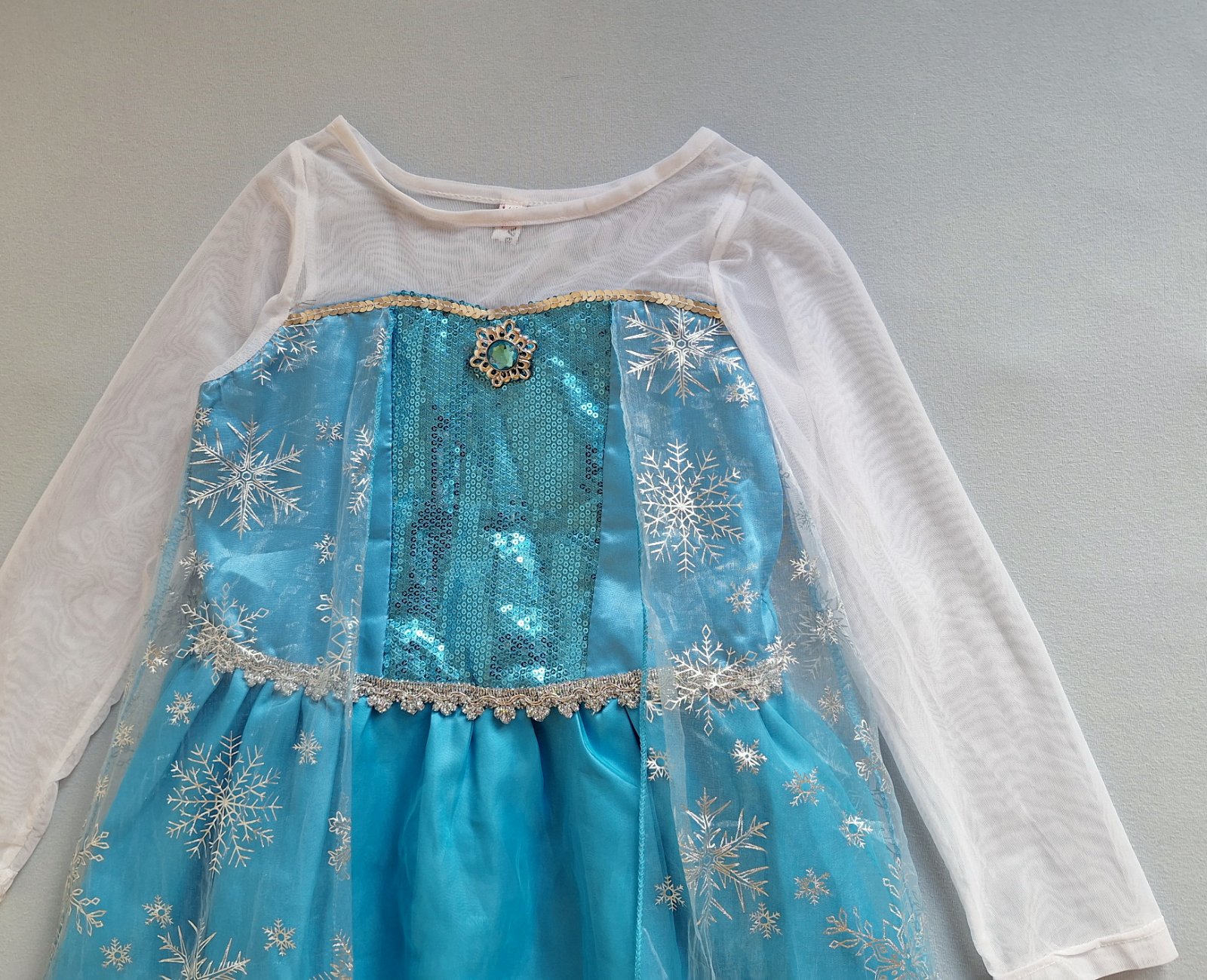 Stav: top stav, bez poškodení. Krásny kostým s dlhou vlečkou zdobenou striebornými vločkami. Rukávy z jemnej organzy - elastické, pod krkom brošňa, v páse guma. Sukňa bohato riasená viac vrstvová. Živôtik zdobený flitrami.