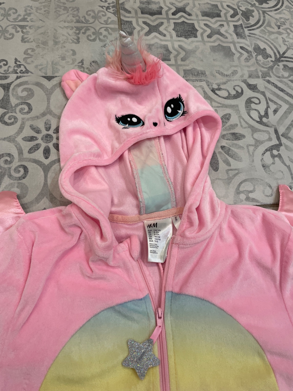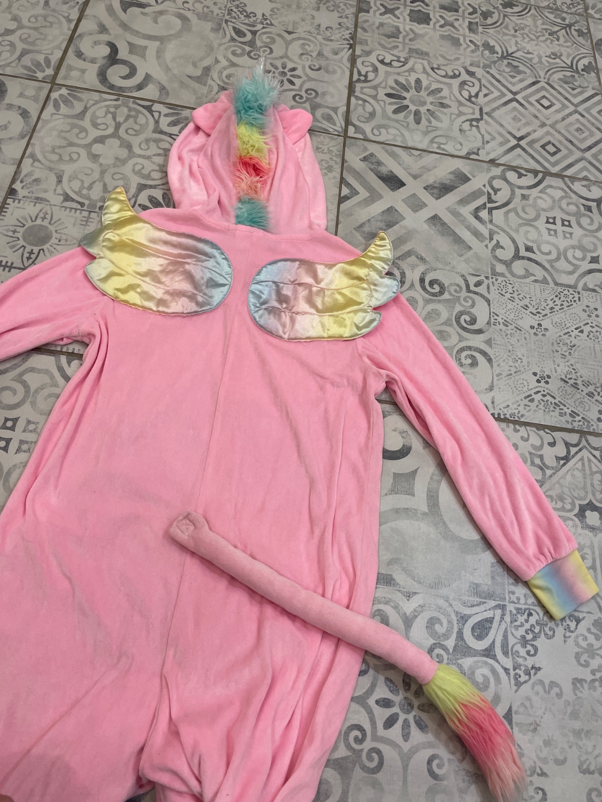 Kostým overal jednorožec, tenký akoby velur. Veľkosť 134/140. Chvost na lepak a. Úle detaily. Trochu popísaný fixou na rukáve, možno pôjde vyčistiť. S kapucňou a duhovym rohom aj očkami.