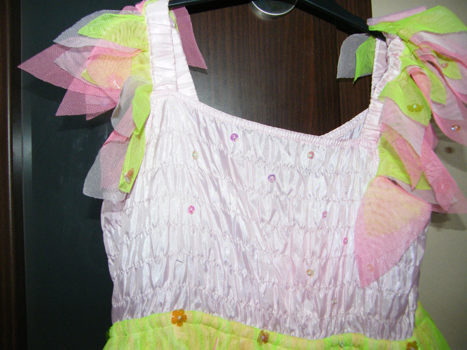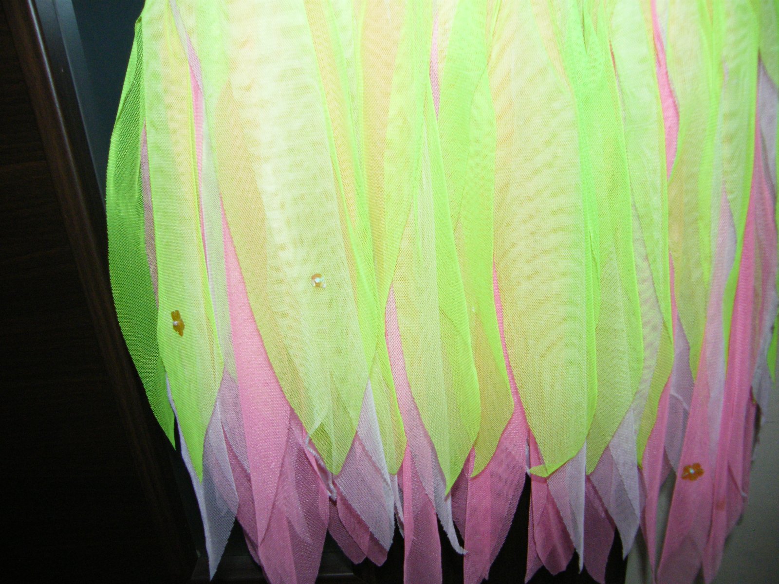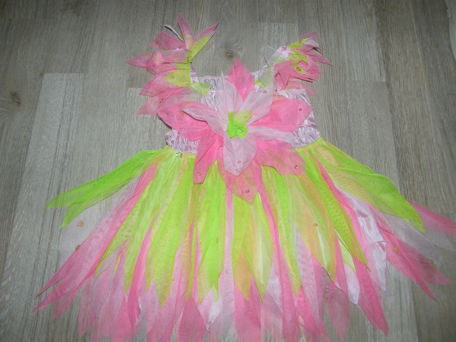 kostým je z dvoch vrstiev látok, vrchná vrstva sú nastrihané prúžky látky, spodok suknička, v páse je gumička, v dobrom nosenom stave, akurát horná časť je trocha roztiahnutejšia, lebo dcéra si ho obliekala na hranie ešte na doma keď jej bol už primalý.