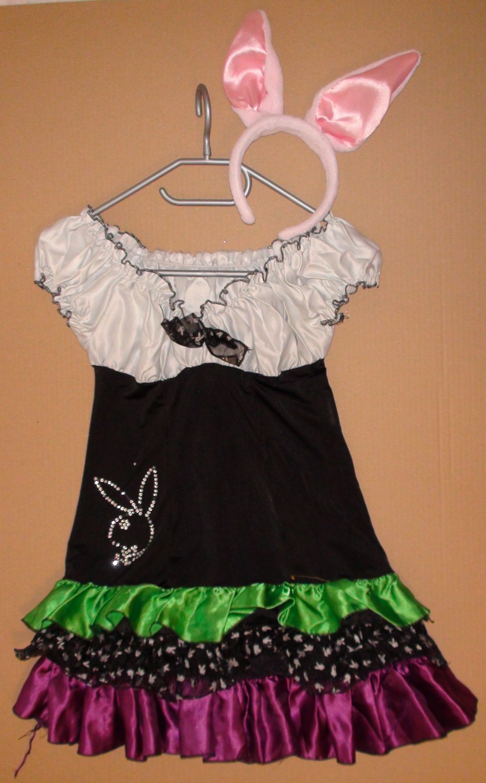 Stav: top stav, chýba pár kamienkov na zajačikovi, inak bez poškodení. Vpredu je možné naviazať korzet. Šaty + čelenka zajačika.
