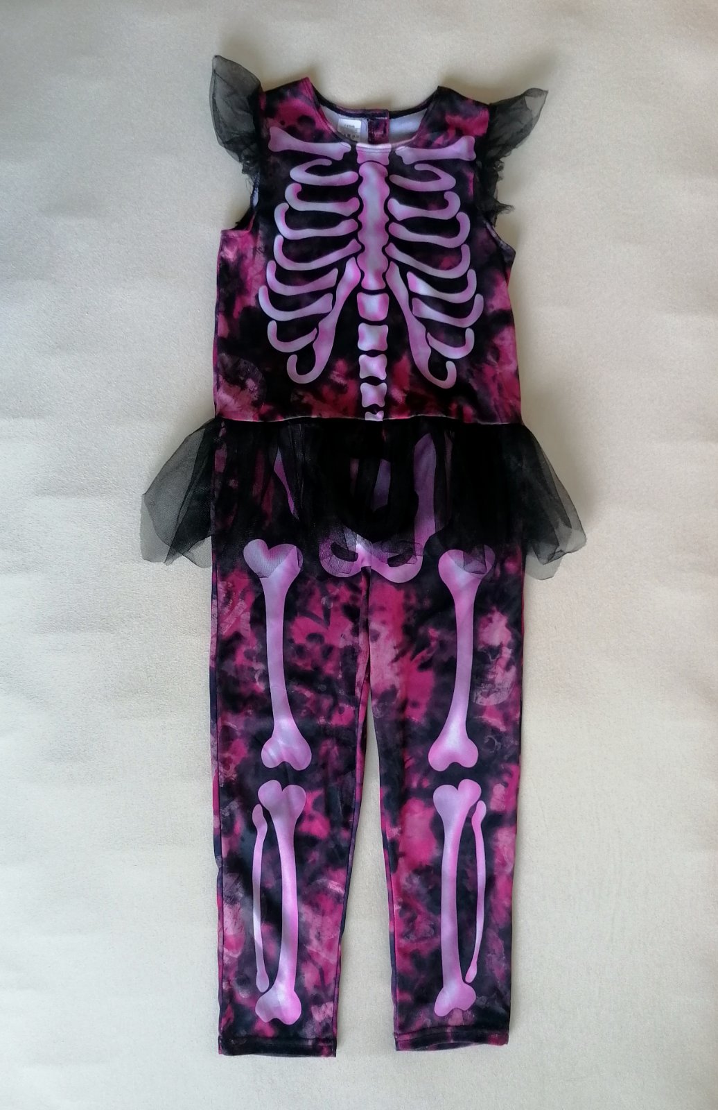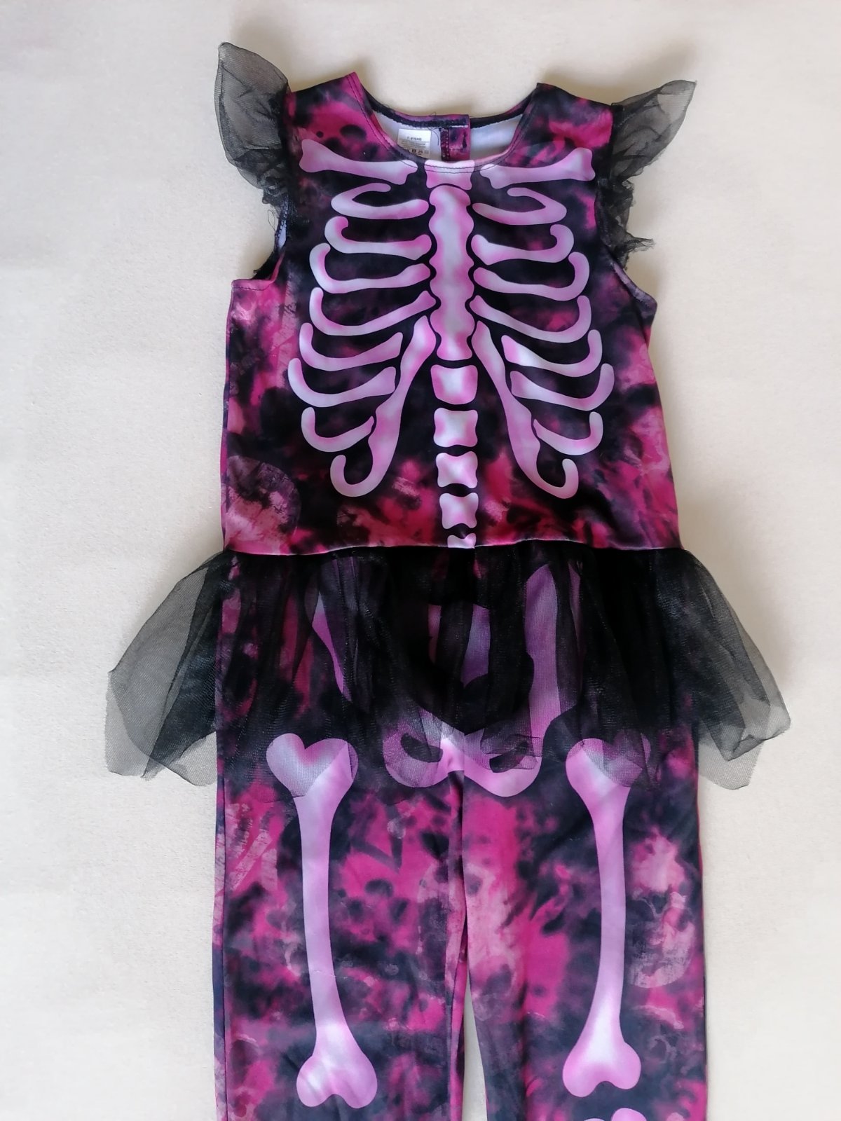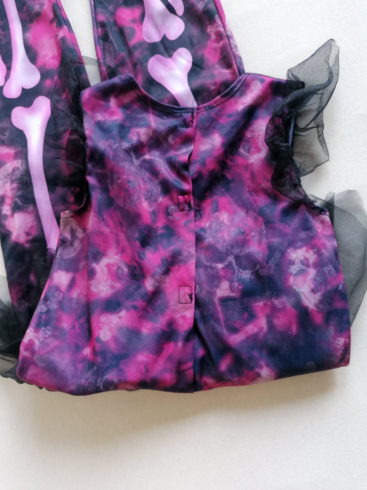 Exkluzívny kostým je v top stave bez poškodení. Pekne elastický, prispôsobí sa postave. V páse tylová suknička, v ružovej batikovanej látke motív svetlých lebiek.