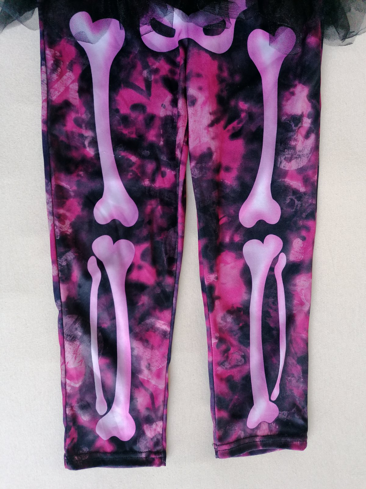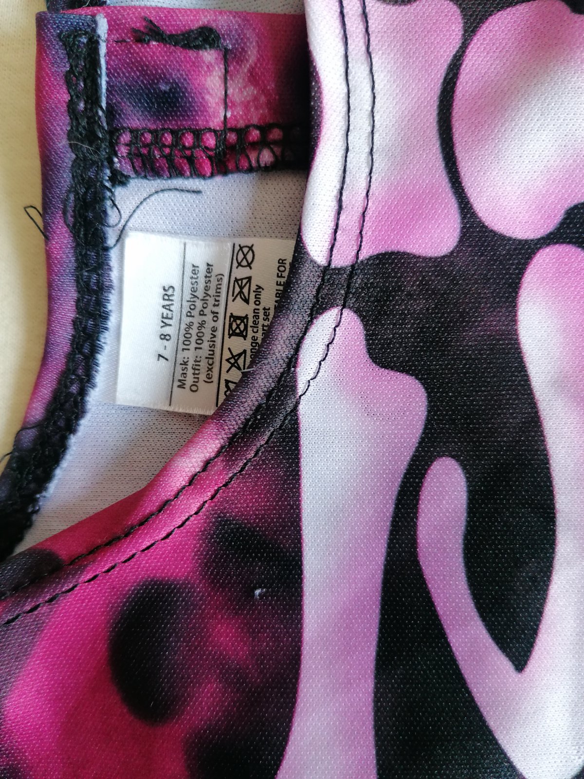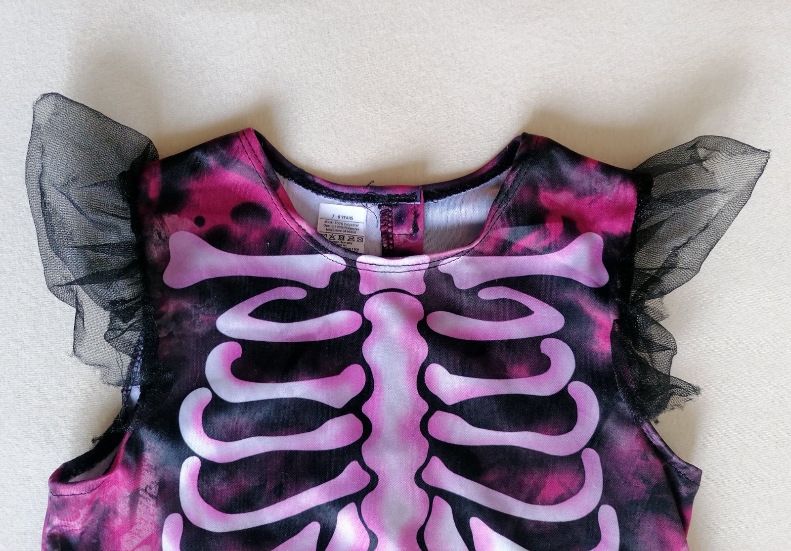 Exkluzívny kostým je v top stave bez poškodení. Pekne elastický, prispôsobí sa postave. V páse tylová suknička, v ružovej batikovanej látke motív svetlých lebiek.