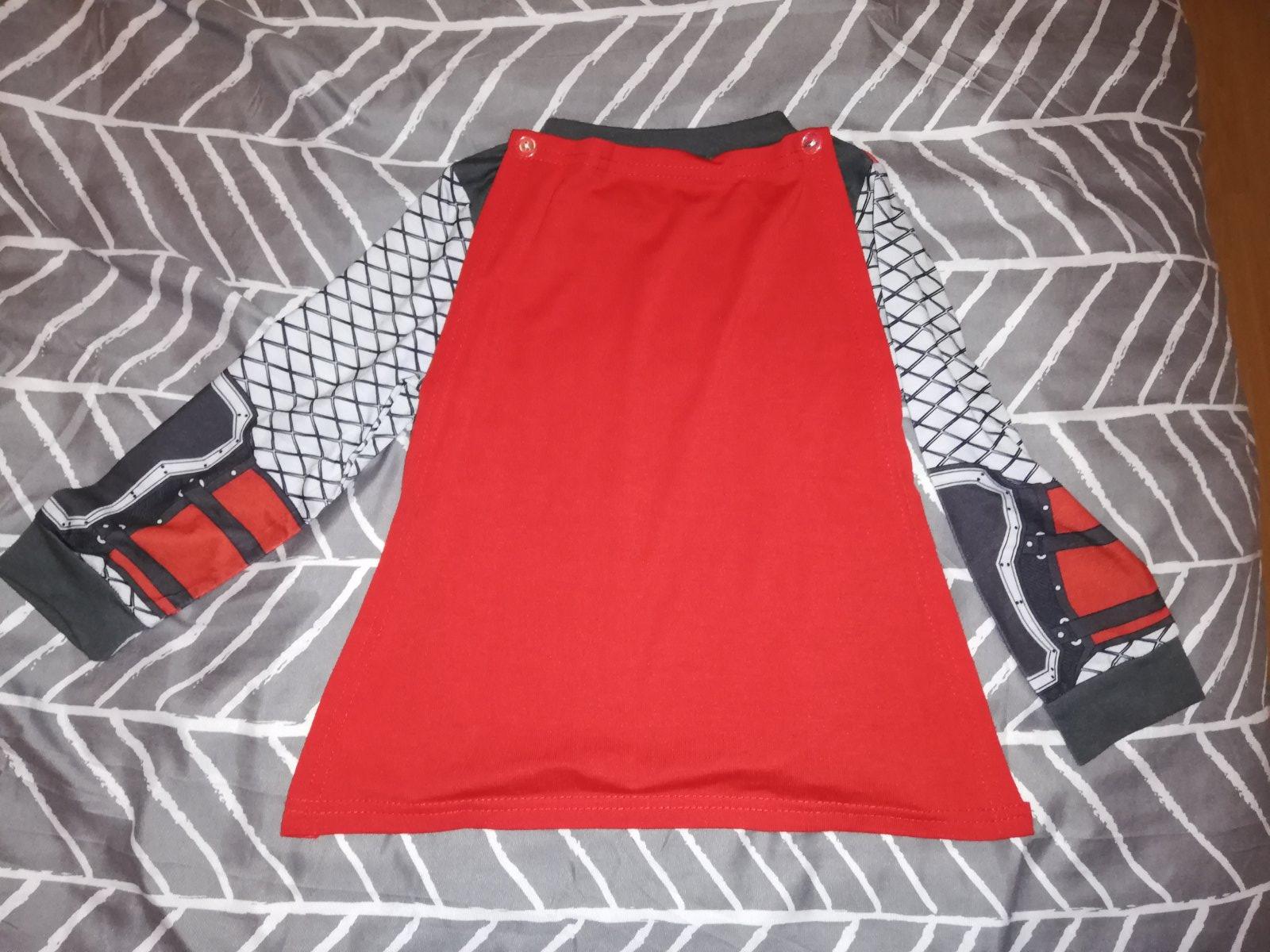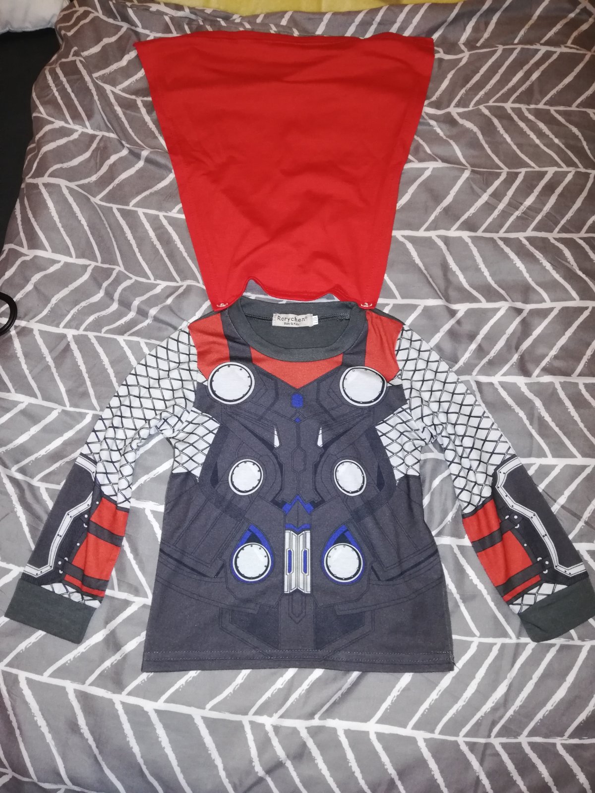 Dvojdielny kostym pre maleho Thora. Použitý raz. Veľkosť pisana 110. Bez závad. Plast sa da gombikmi pripnúť / odopnut.