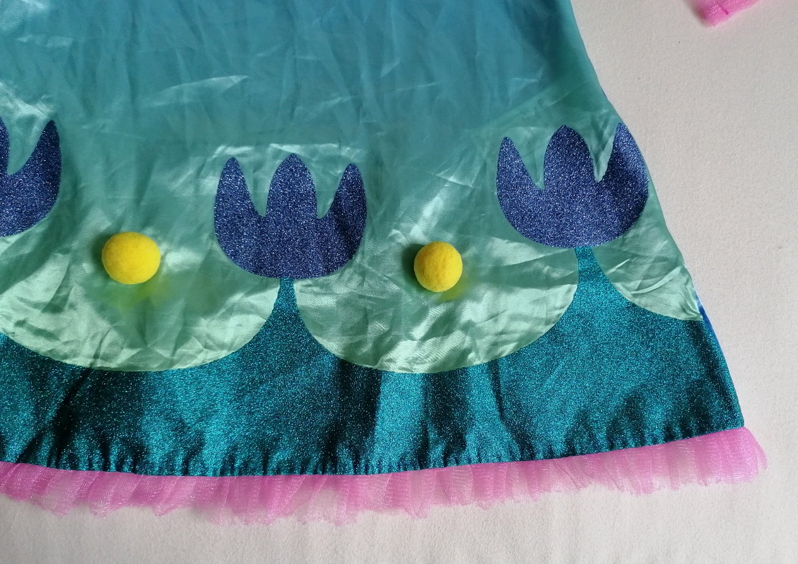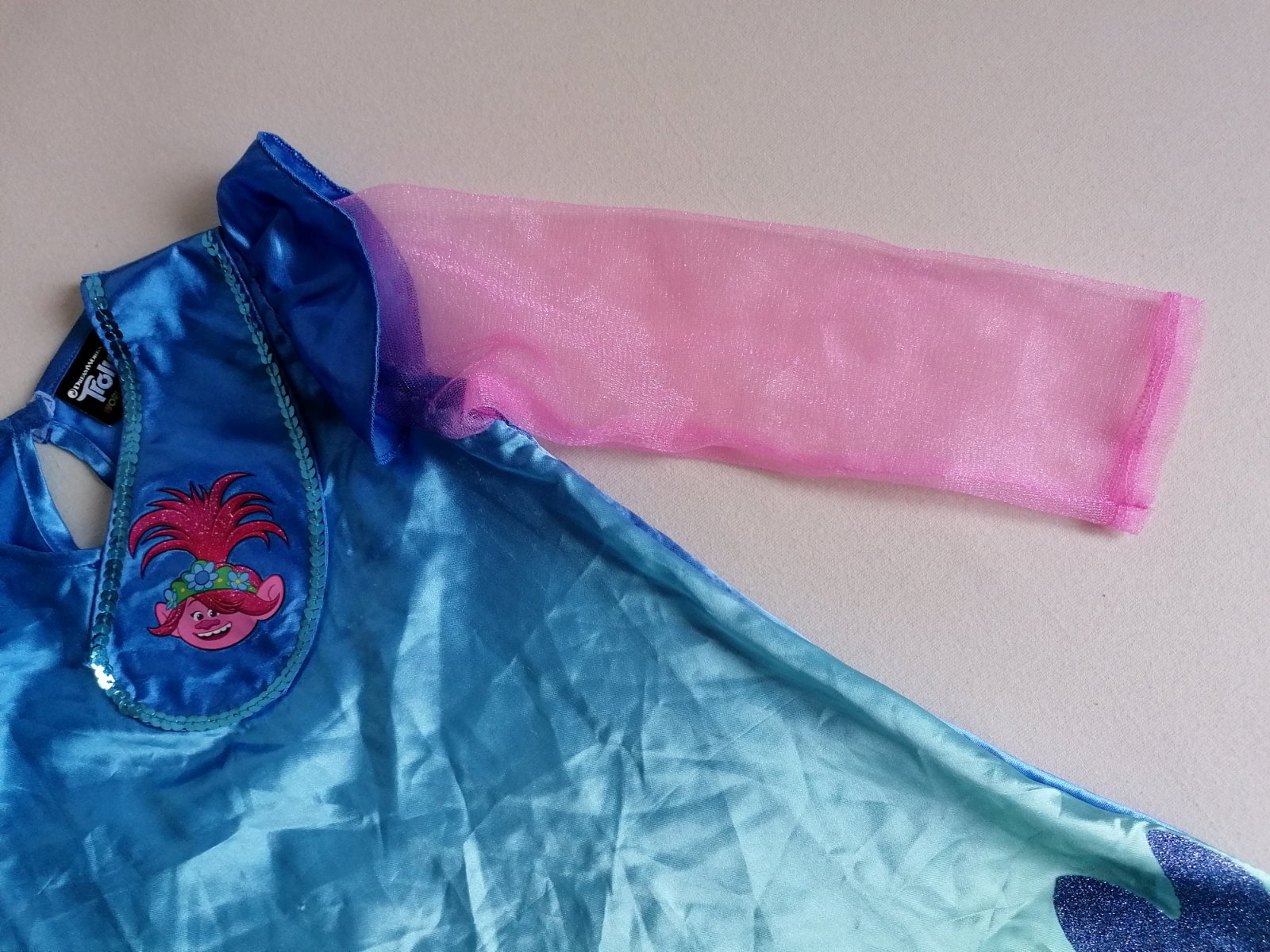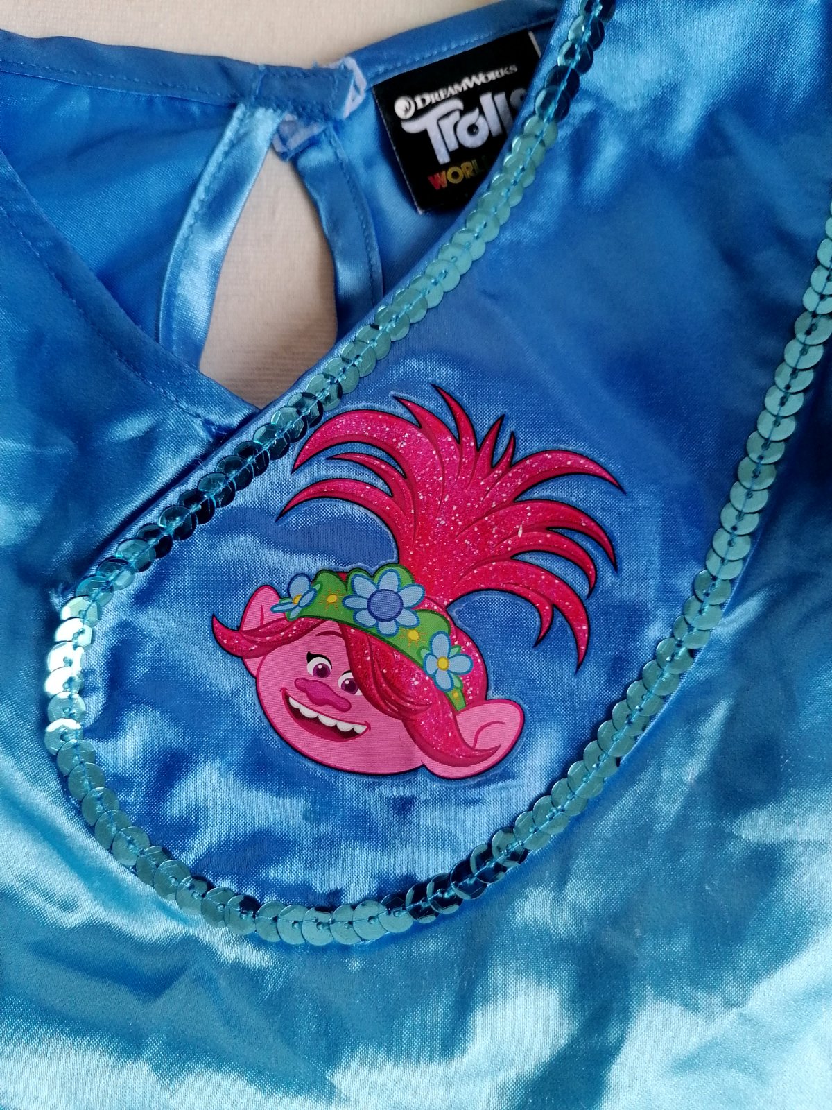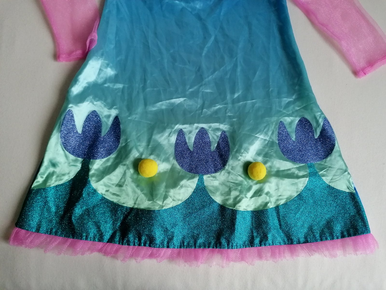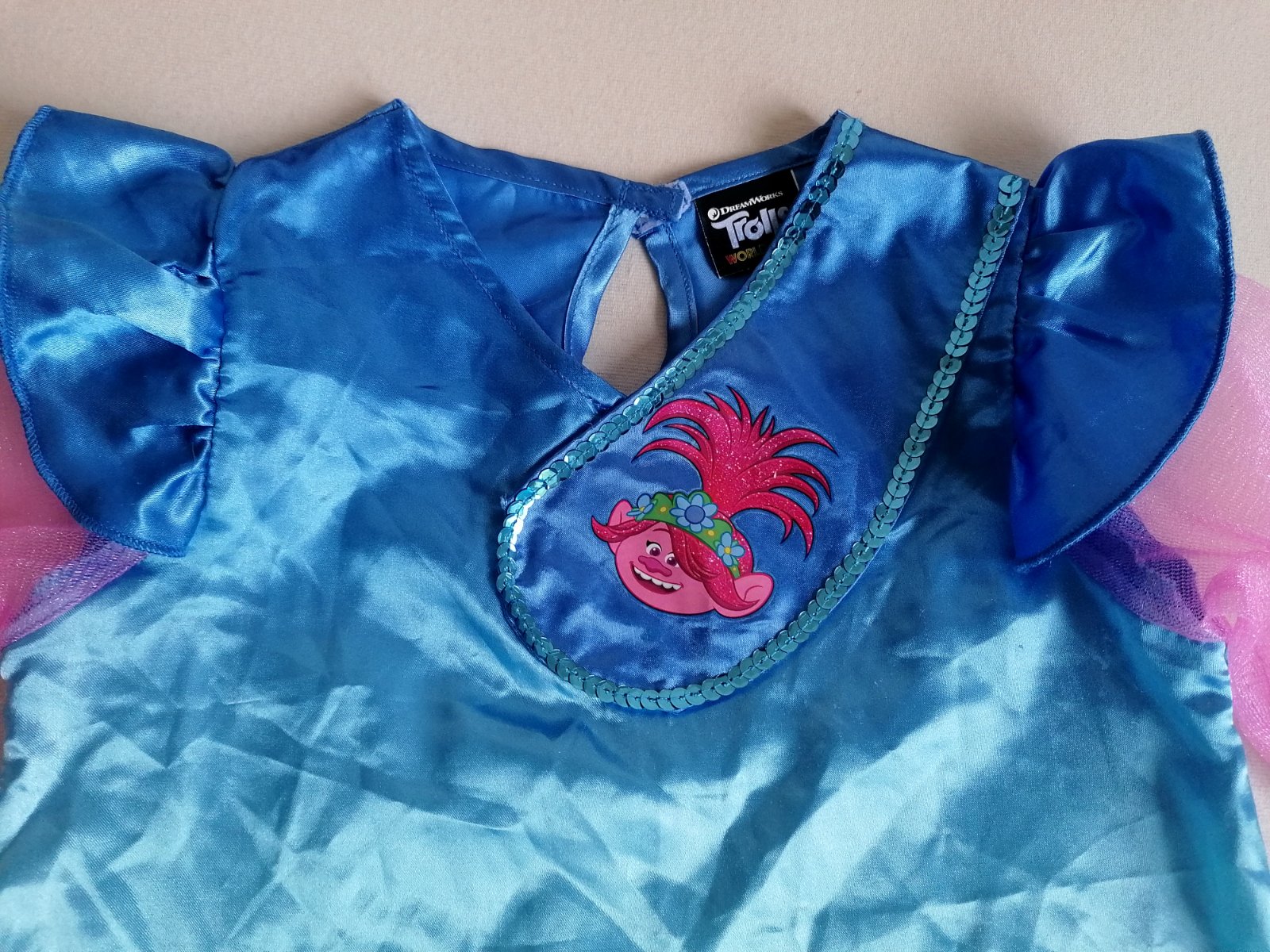 Stav: top stav, bez poškodení. Pekné šaty zdobené trblietavým motívom a brmbolcami na hrudi odbrázok malej Trollky na motívy rozprávky Trollovia.