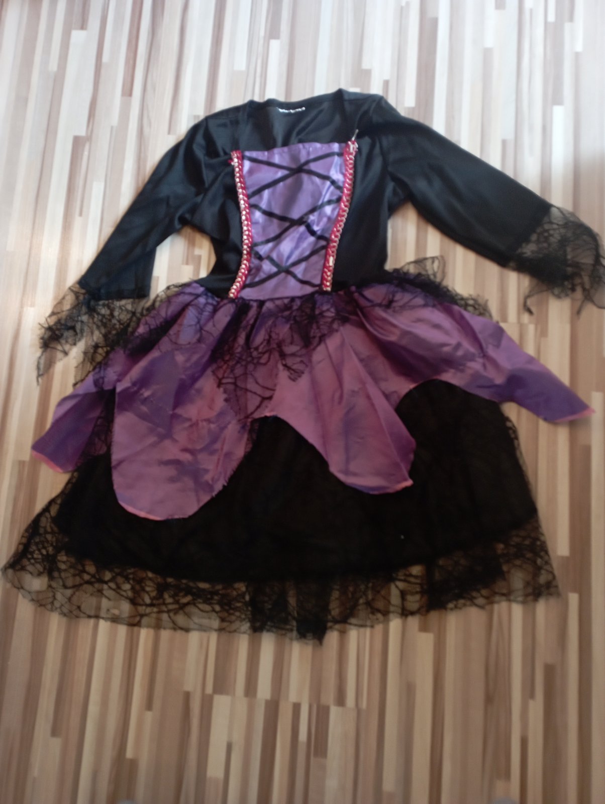 Kostým Večernice-šaty z pružného materiálu, dĺžka 83cm,saténový plášť so zapínaním na gombík, klobúk s gumičkou aj viazaním, raz použité. Čarovná palička v cene kostýmu.