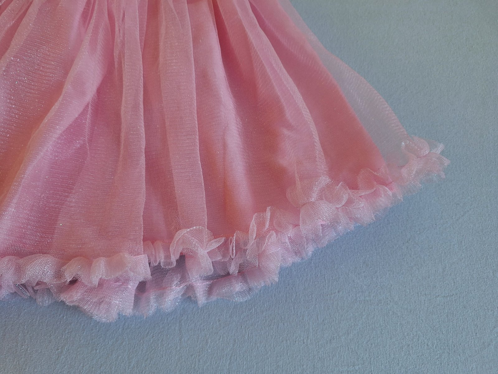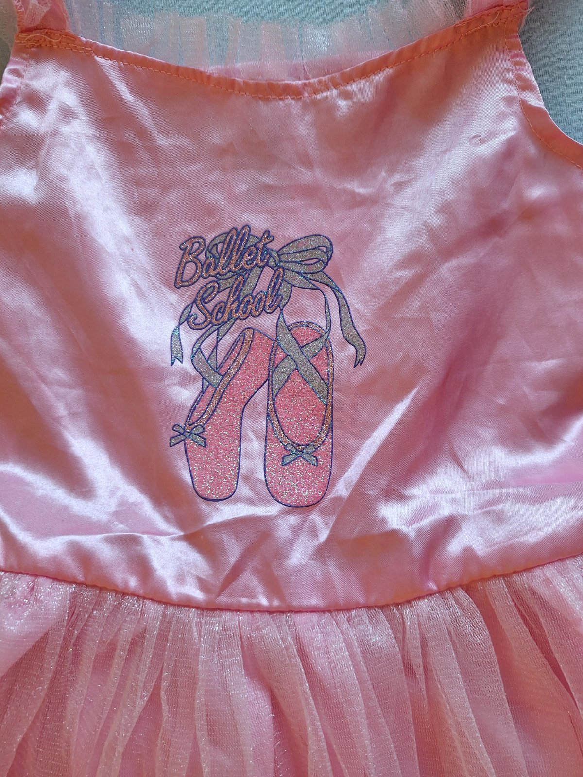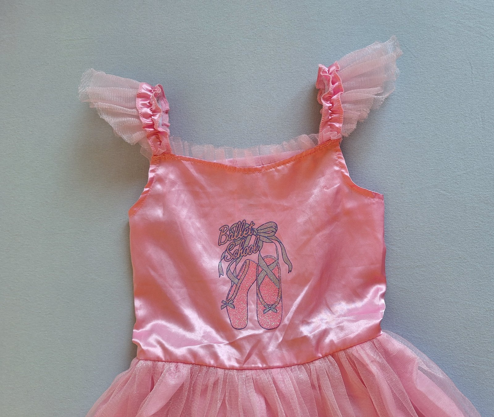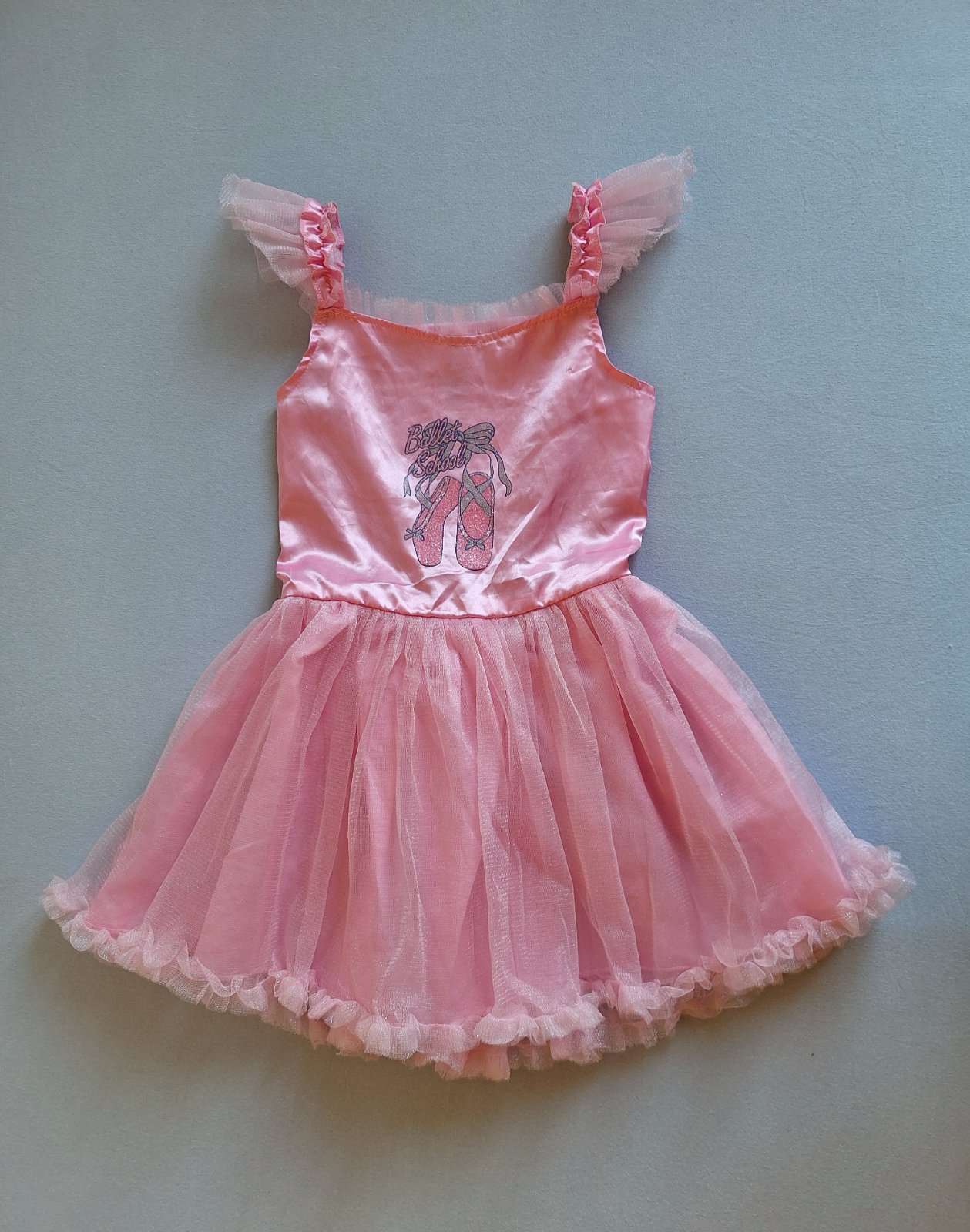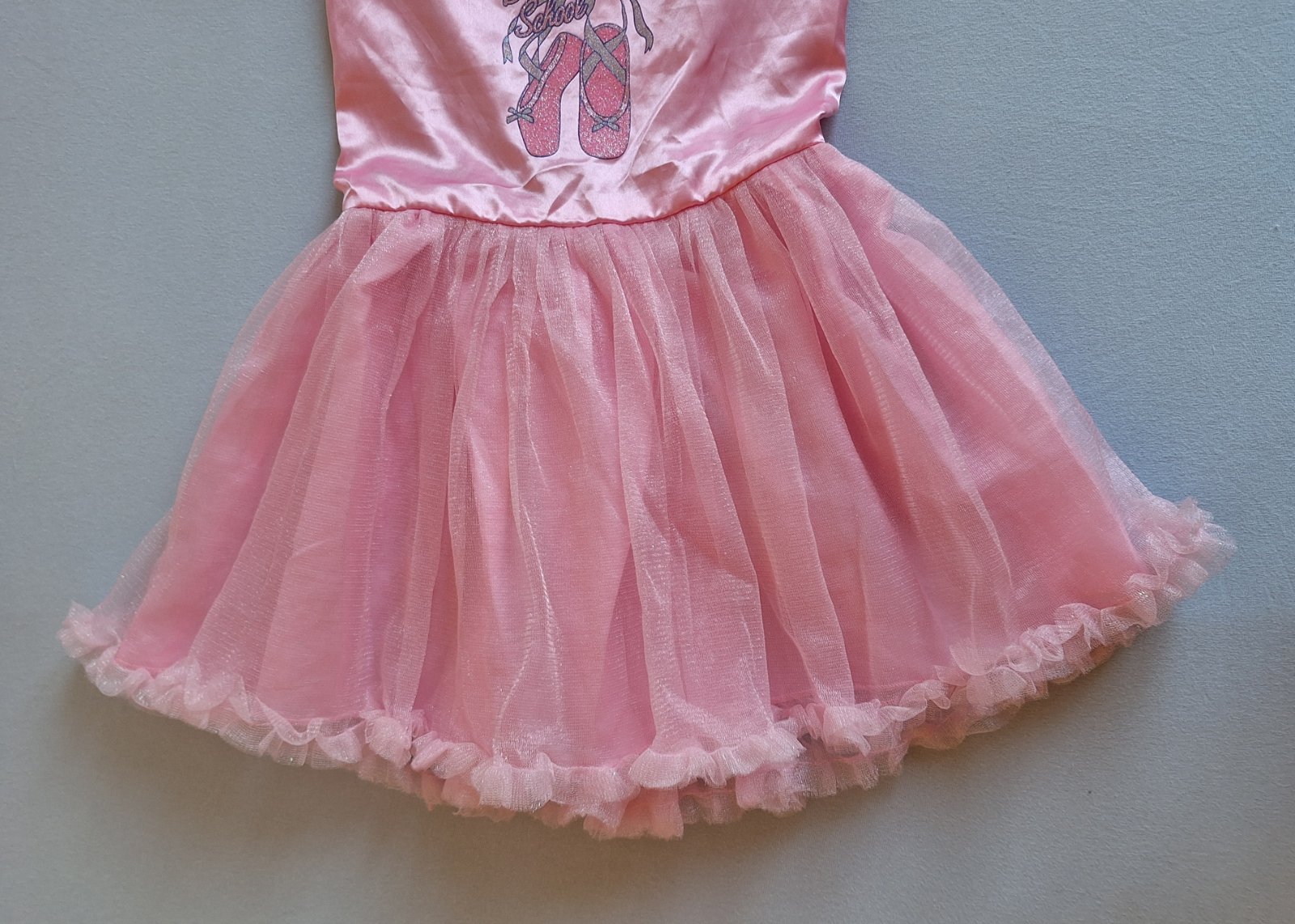 Vhodné ako karnevalový kostým baletky, alebo tanečnice. Príjemné elastické s bohato nazberanou 3 vrstvovou tylovou tutu sukničkou. Na hrudi obrázok baletných topánok – pekne trblietavé. Nádherné, bez poškodení a známok nosenia.