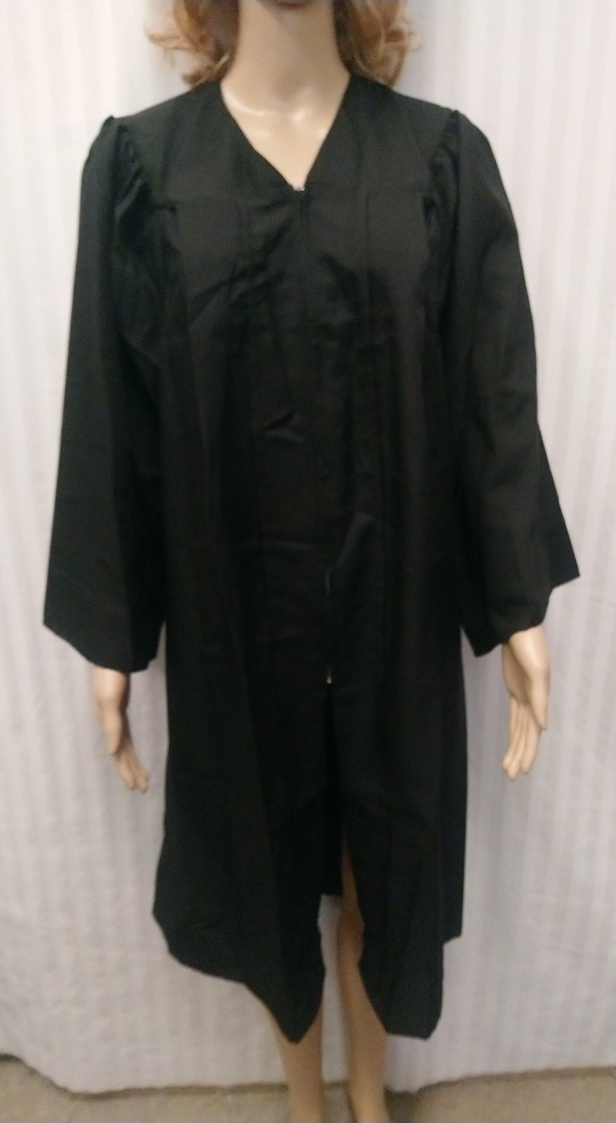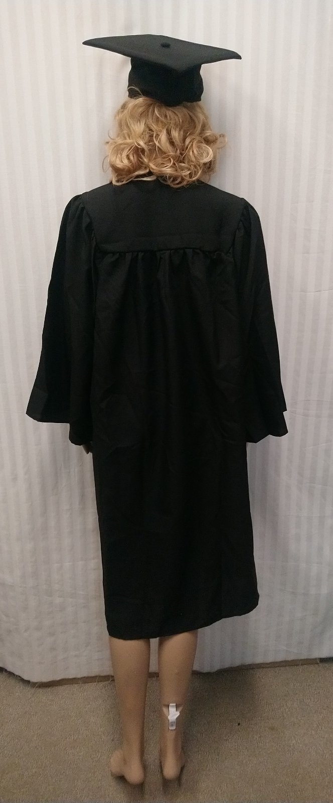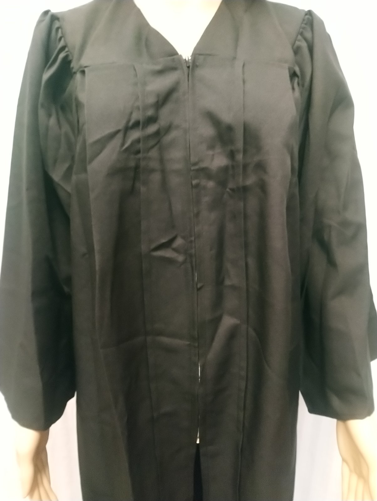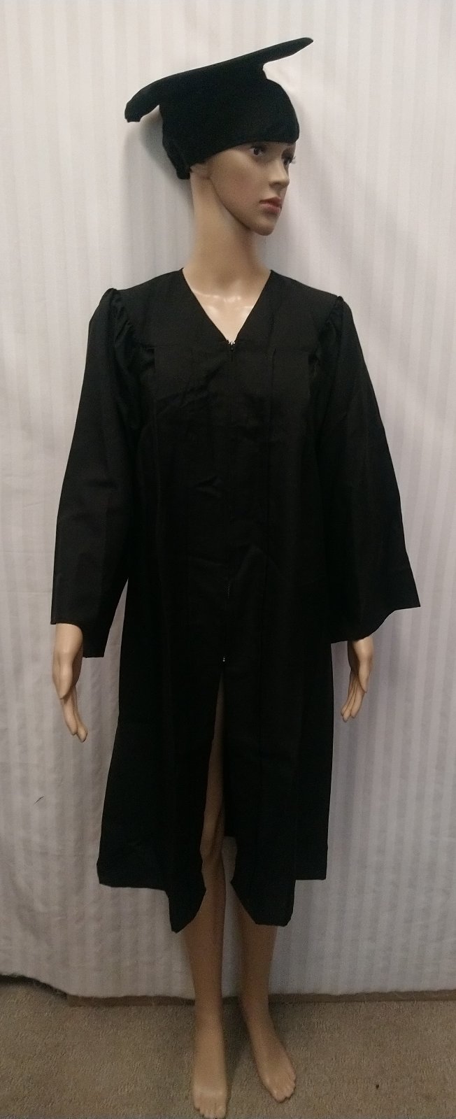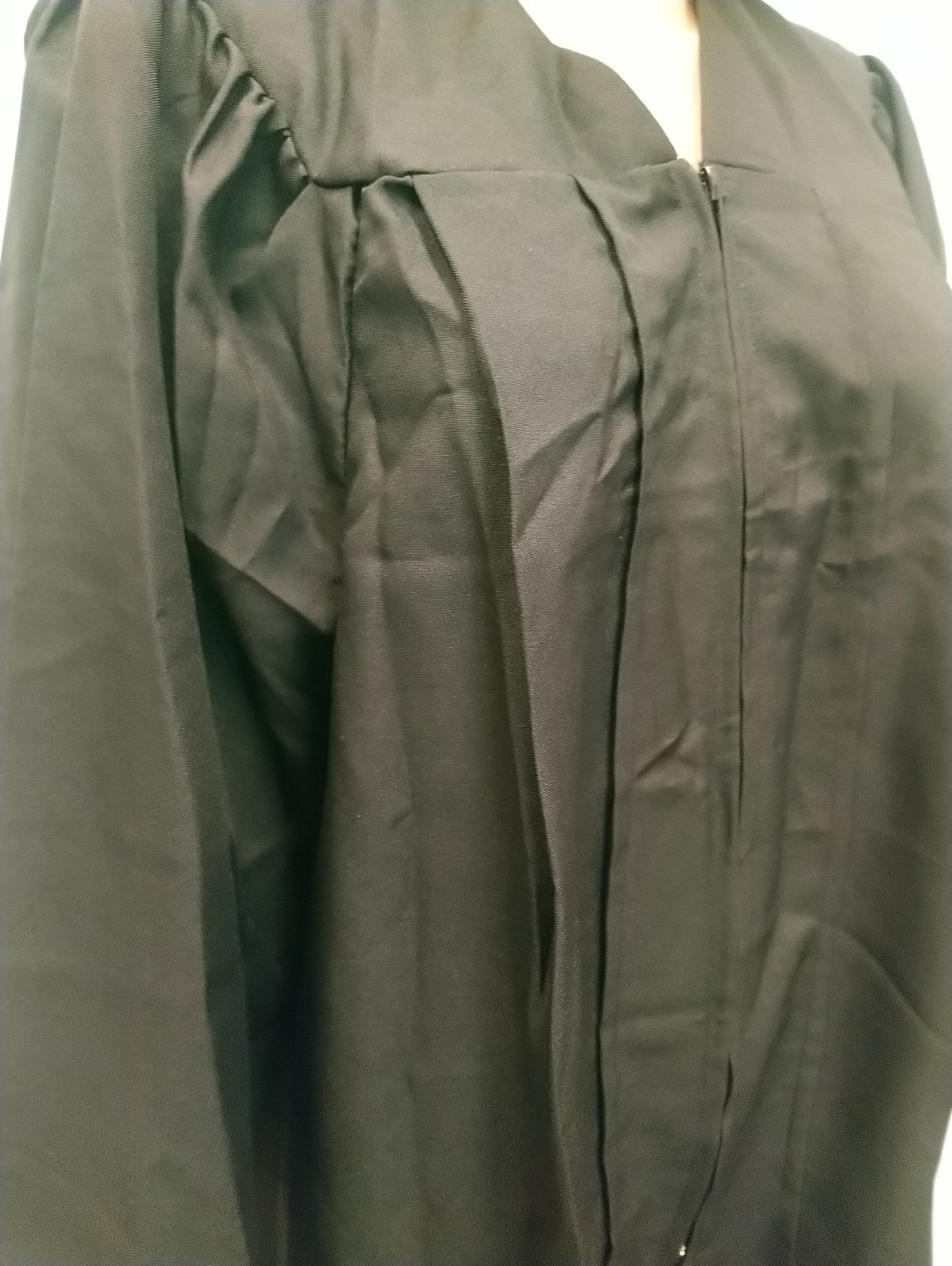 promočné čierne šaty - plášť so zapínaním na zips a čiernu promočnú čiapku,