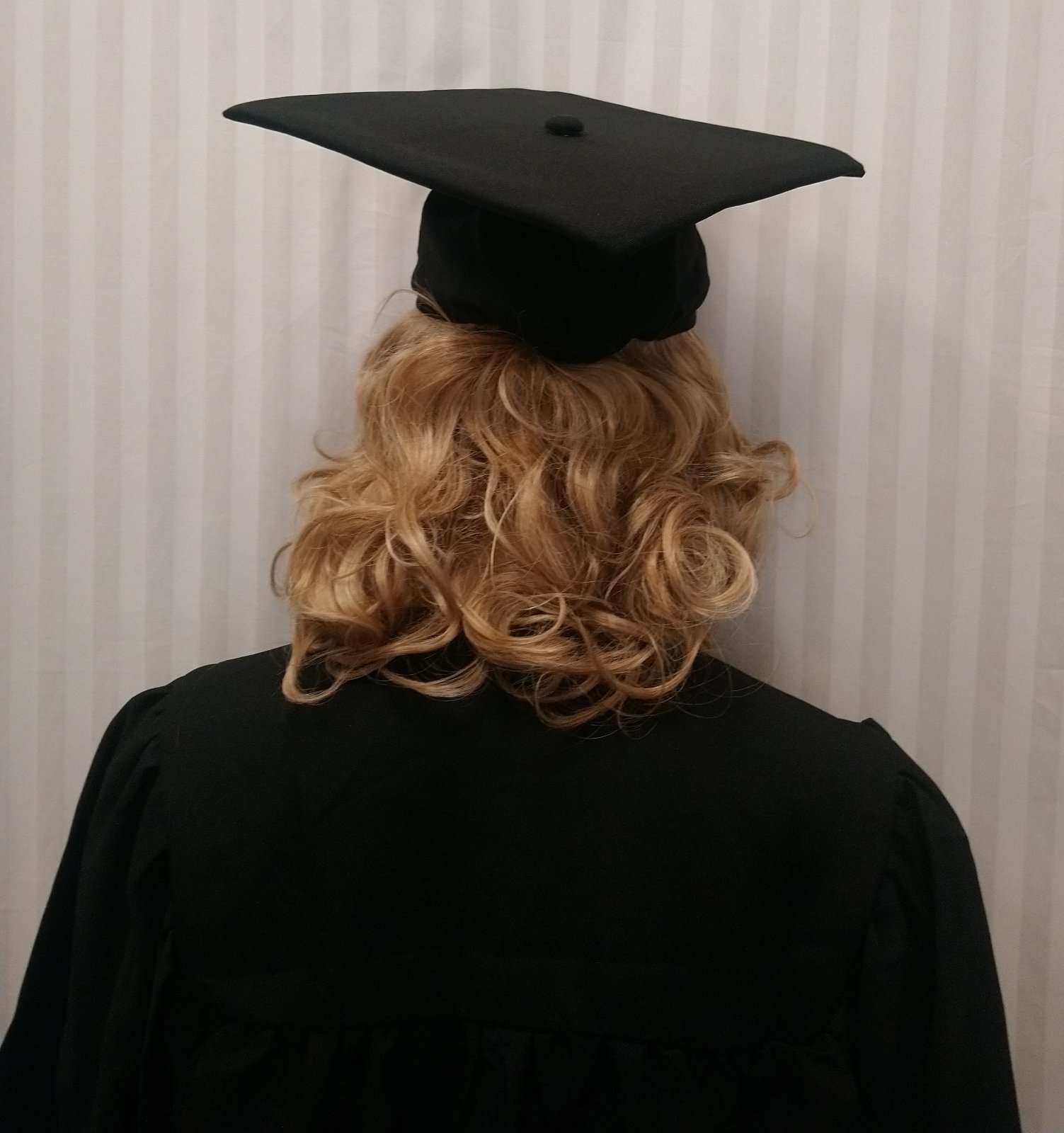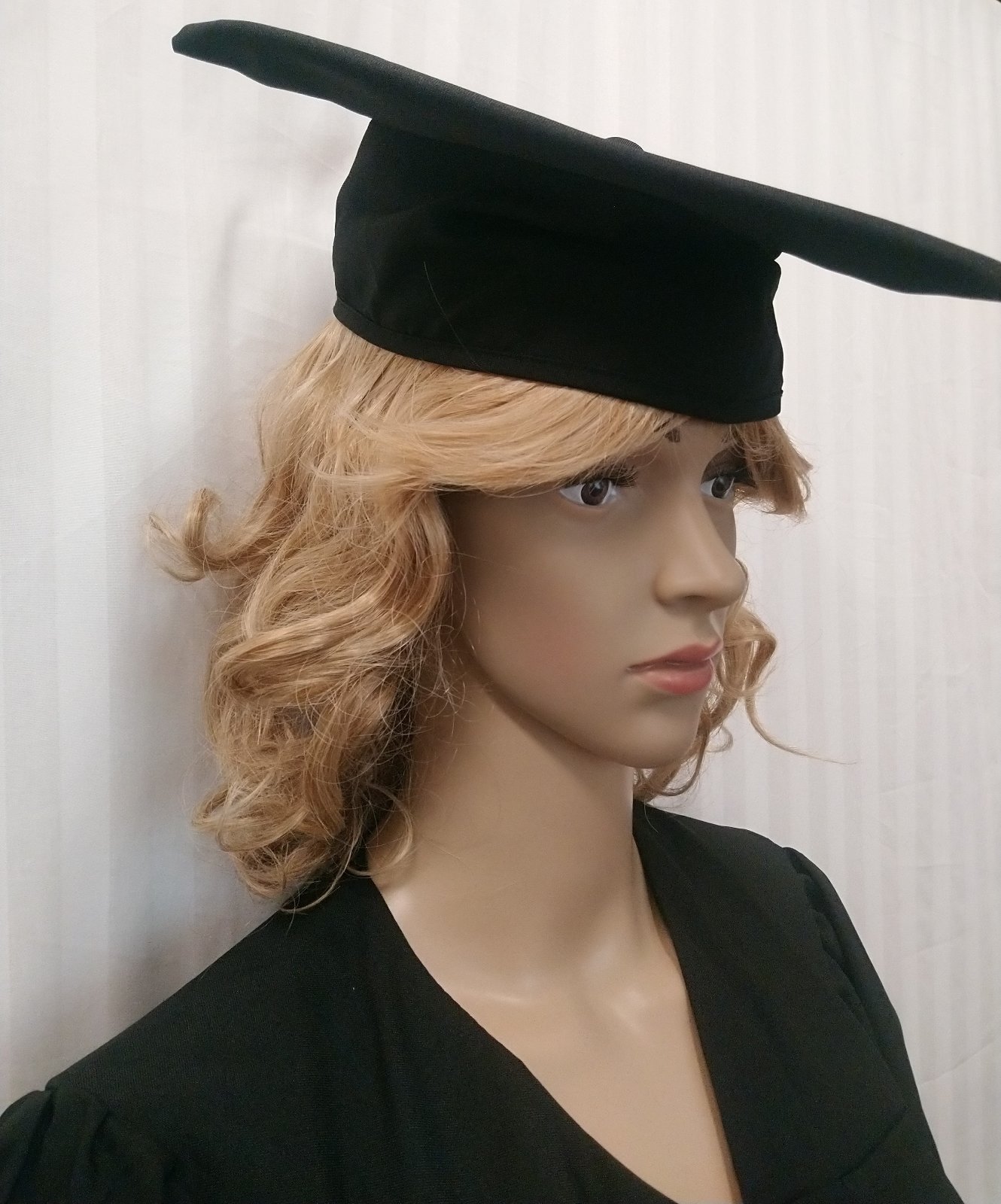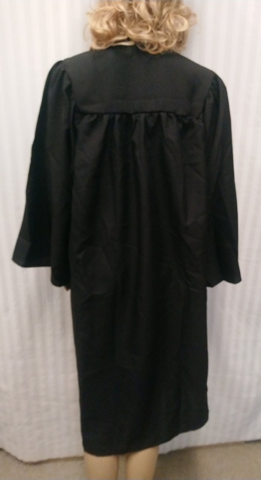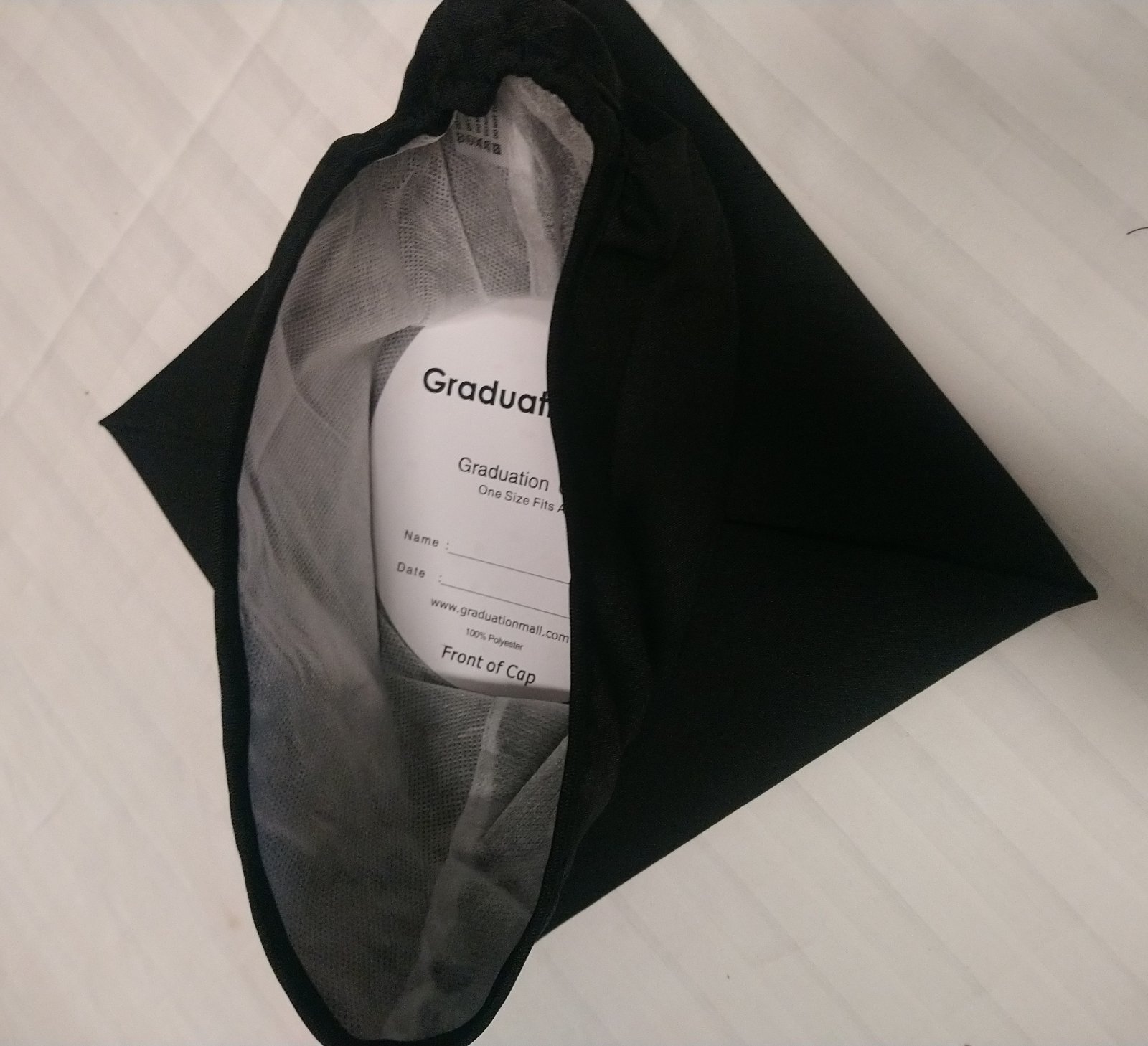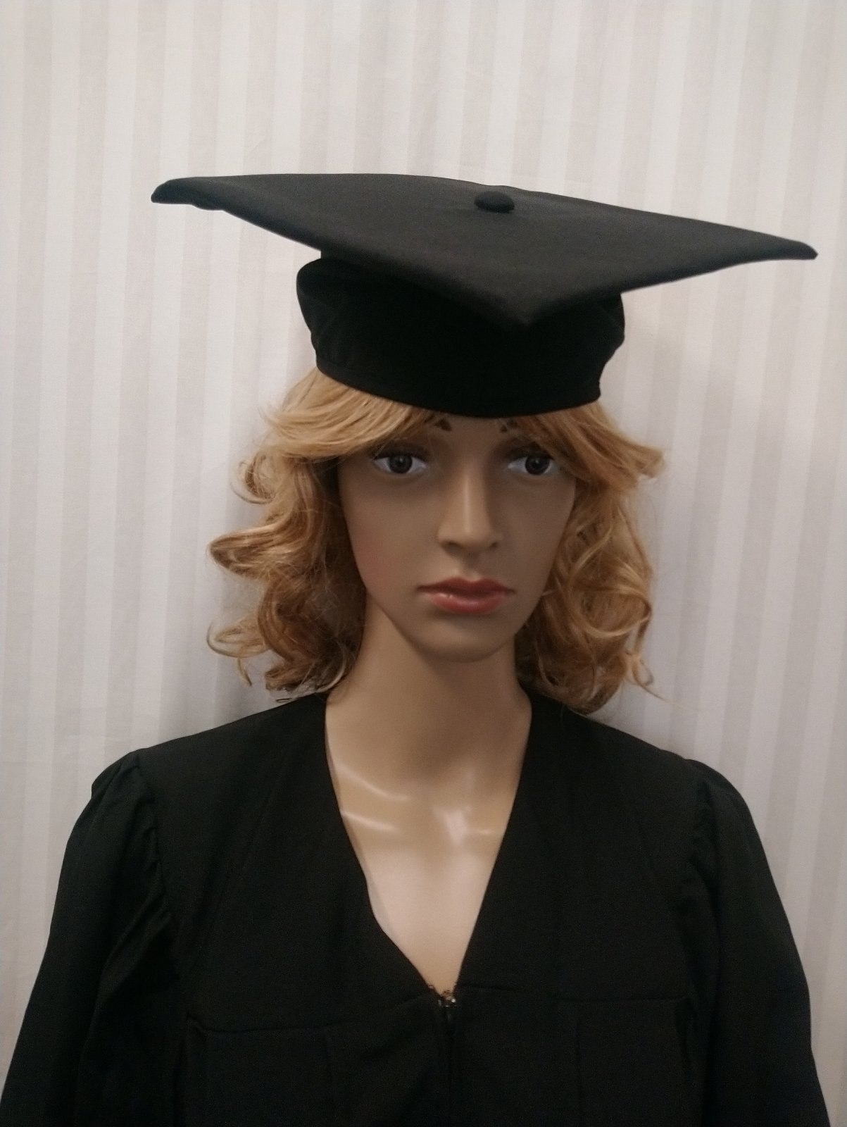 promočné čierne šaty - plášť so zapínaním na zips a čiernu promočnú čiapku,