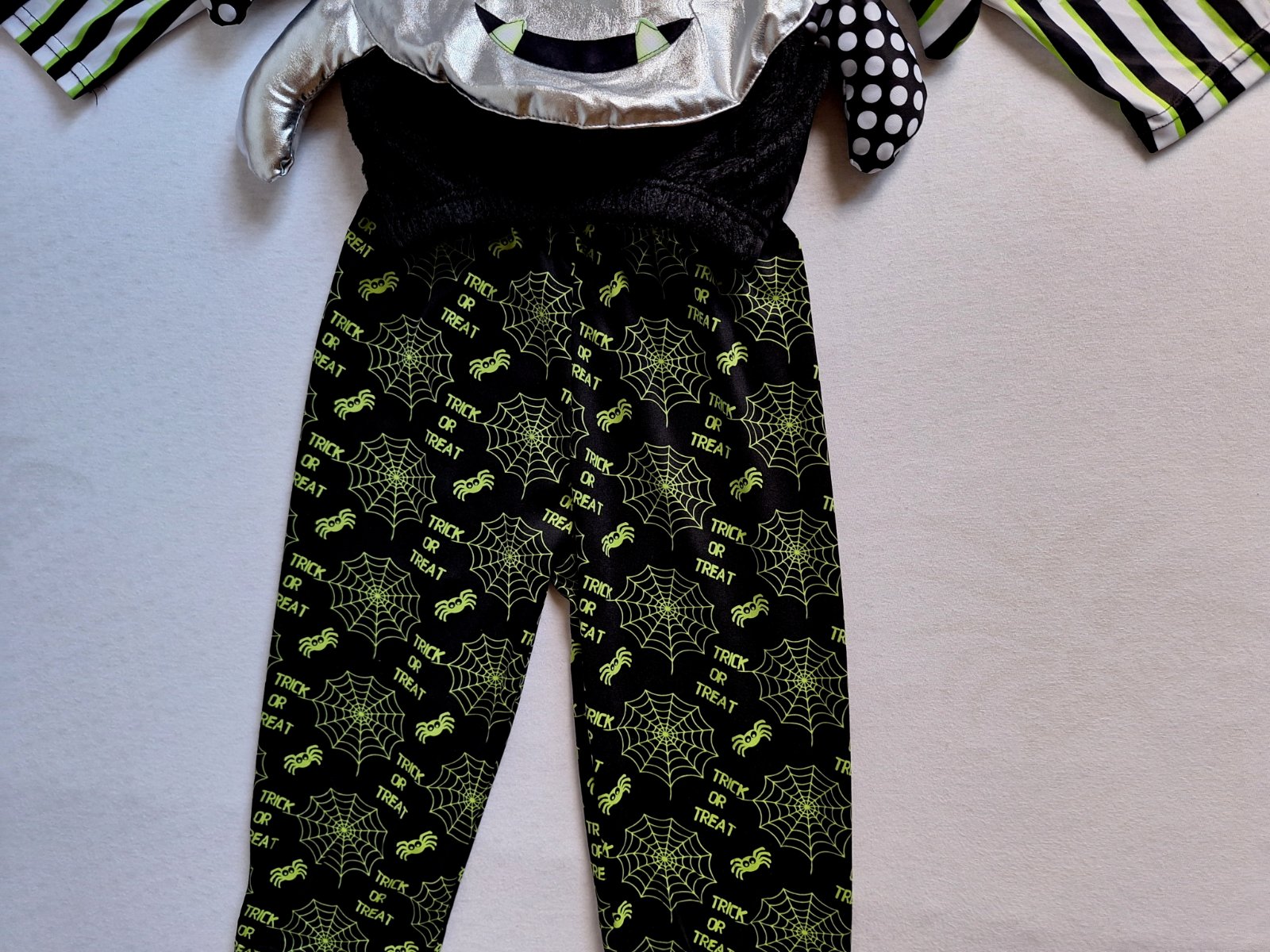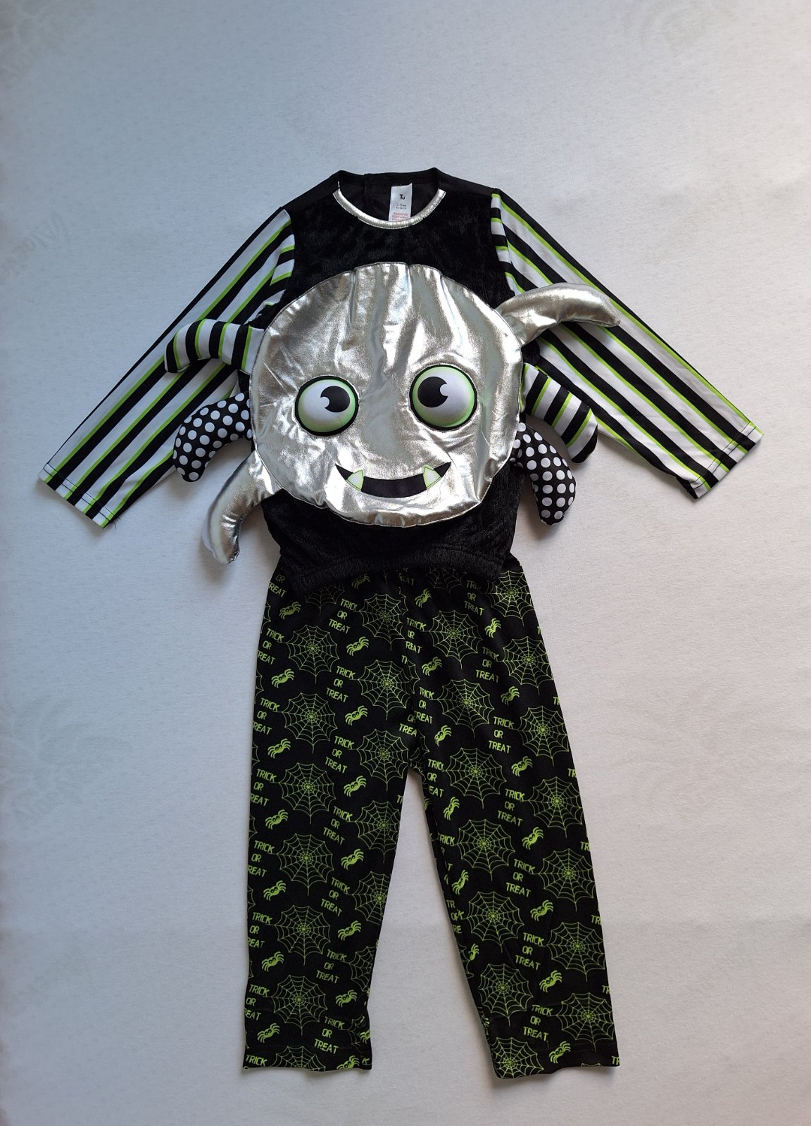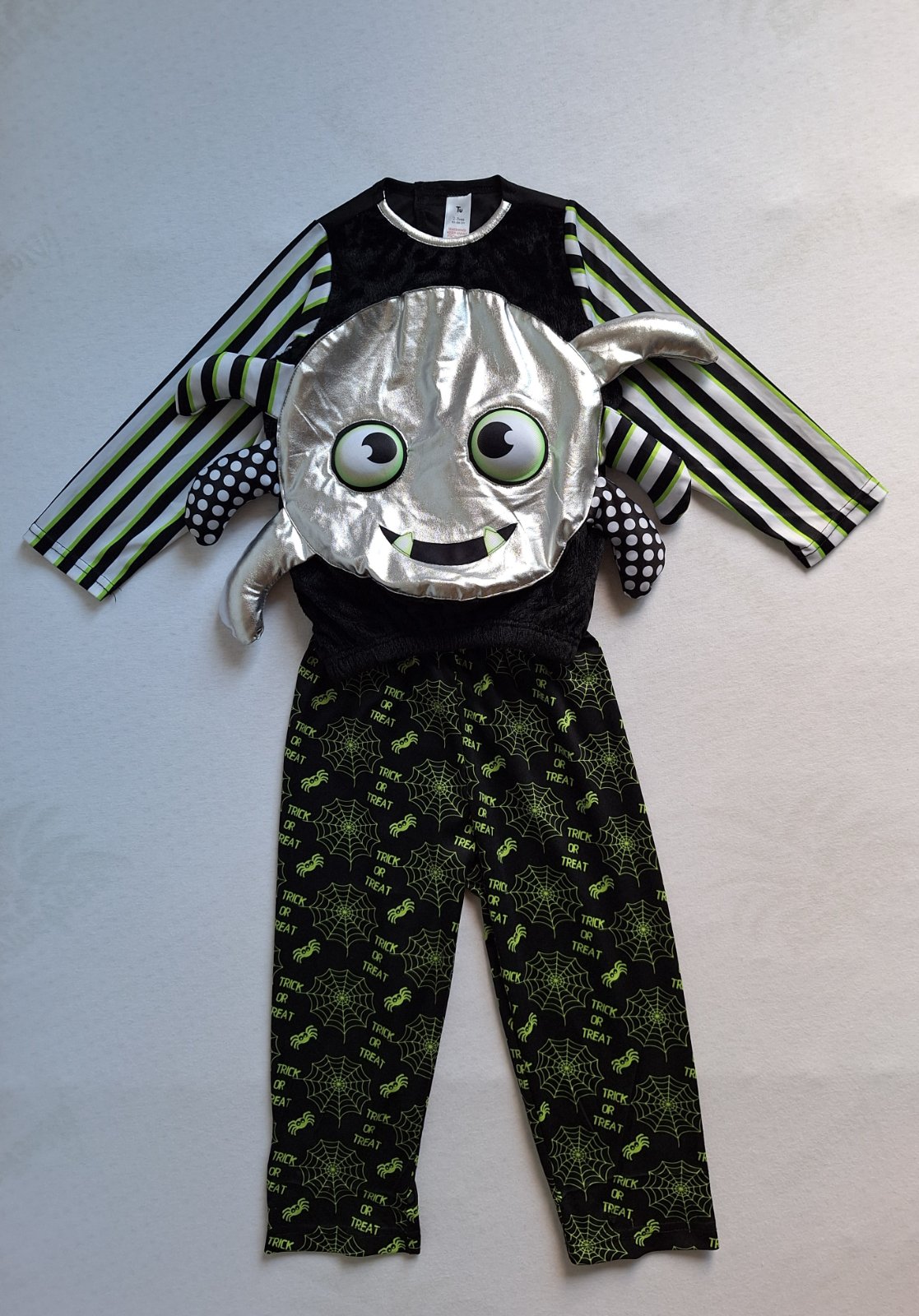 Kostým je vo veľmi peknom stave bez poškodení. 2-dielny kostým pavúčika pozostáva z vystuženého topu a po bokoch trčia nožičky. Nohavice sú elastické v páse do gumy.