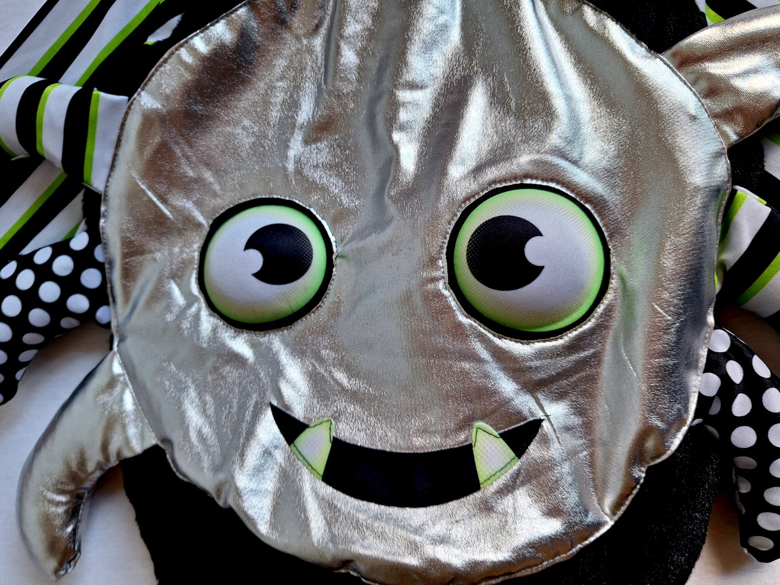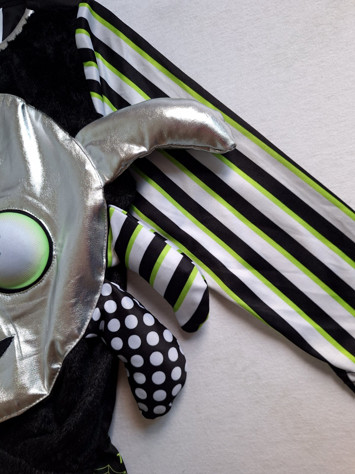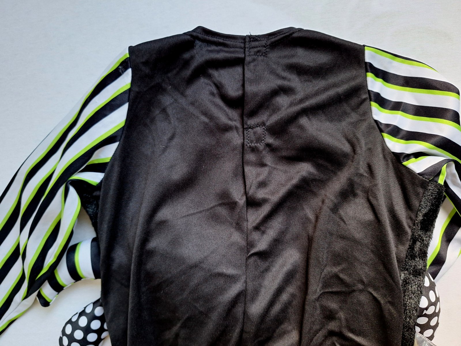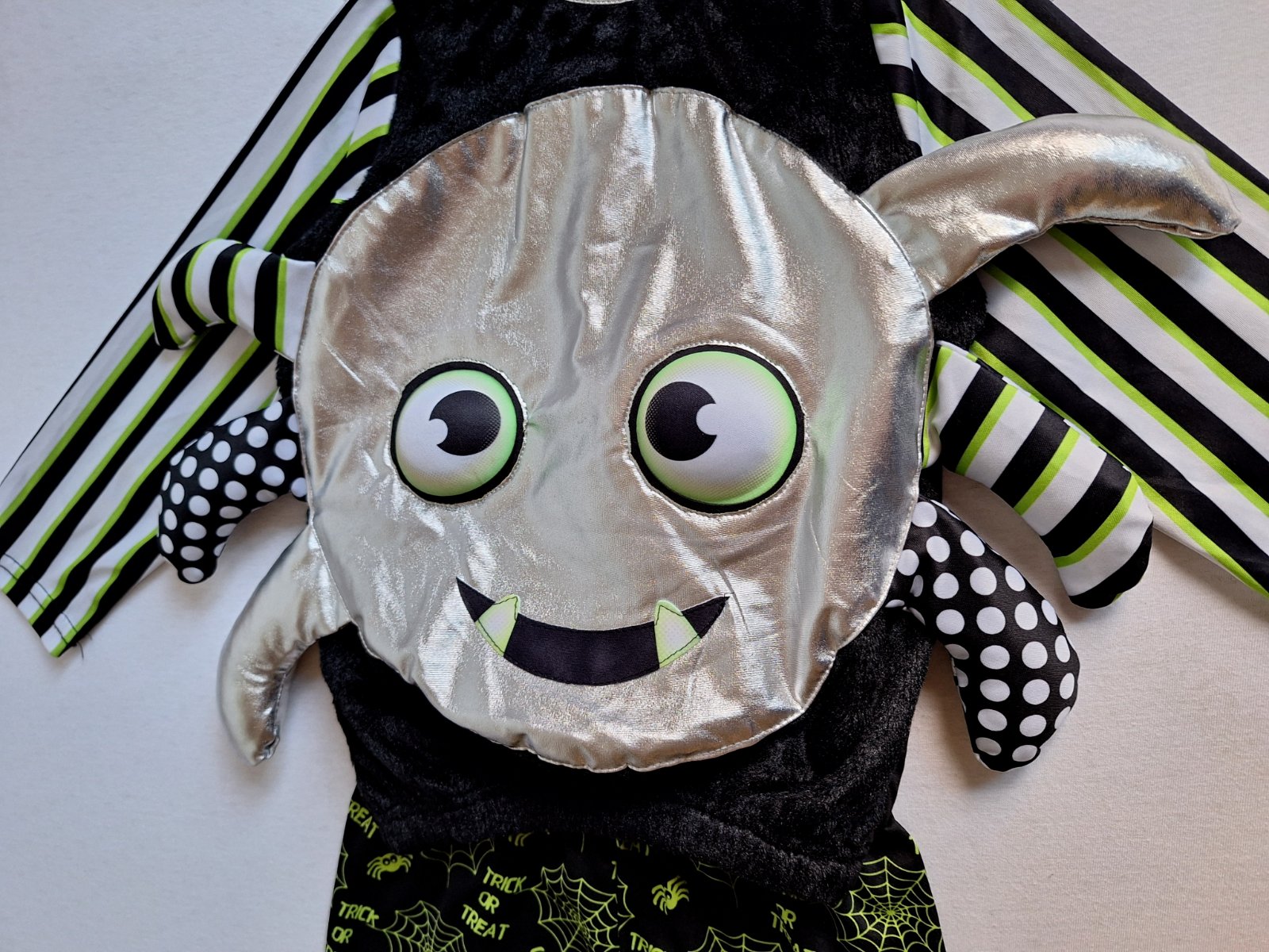 Kostým je vo veľmi peknom stave bez poškodení. 2-dielny kostým pavúčika pozostáva z vystuženého topu a po bokoch trčia nožičky. Nohavice sú elastické v páse do gumy.