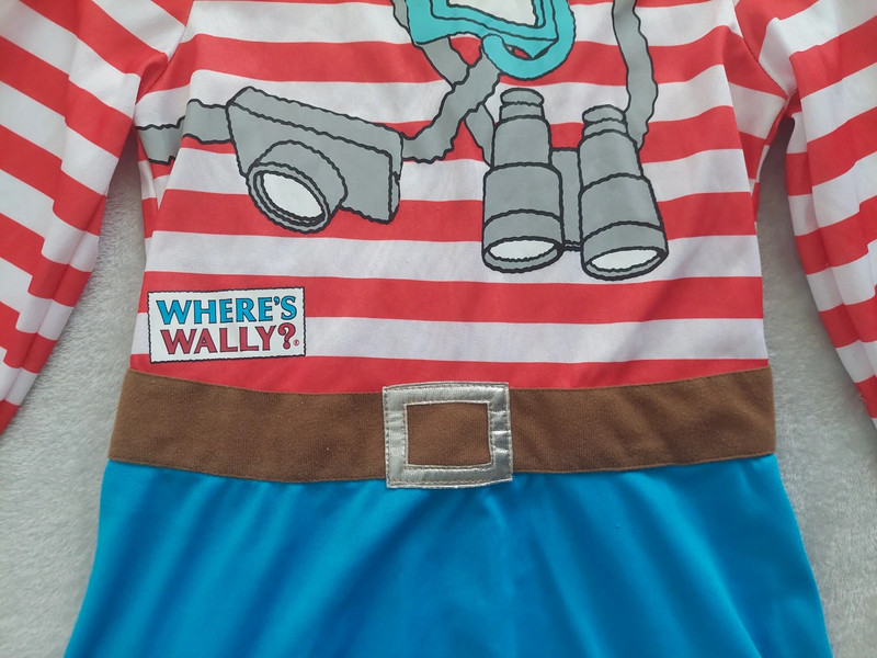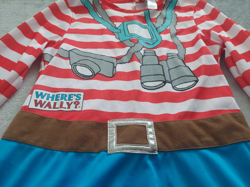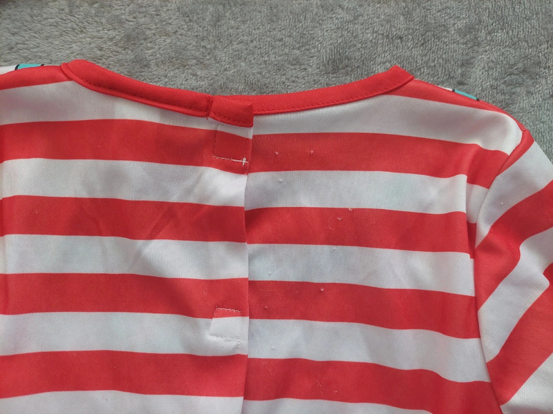 Stav: top stav, len na sukničke drobné zatiahnutie. Šaty + čiapka na hlavu. Veľmi pekný kostým malej turistky na motívy Where is Wally?, v páse guma, imitácia opaska.