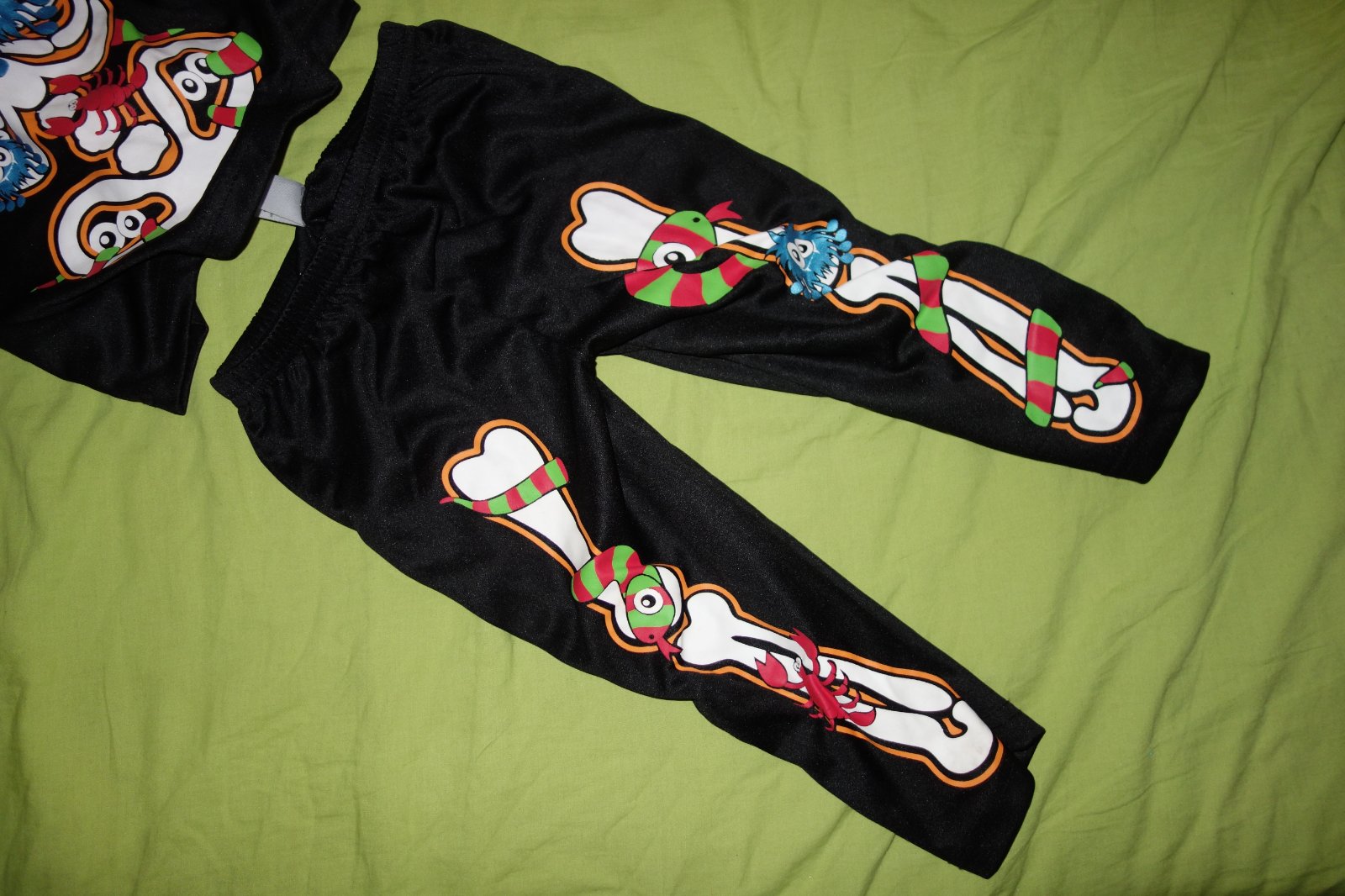 Pekny kostymcek na Halloween vo velmi dobrom stave- na tych bielych nazehlovackach su fliaciky. Je urceny na vek 1-2roky.